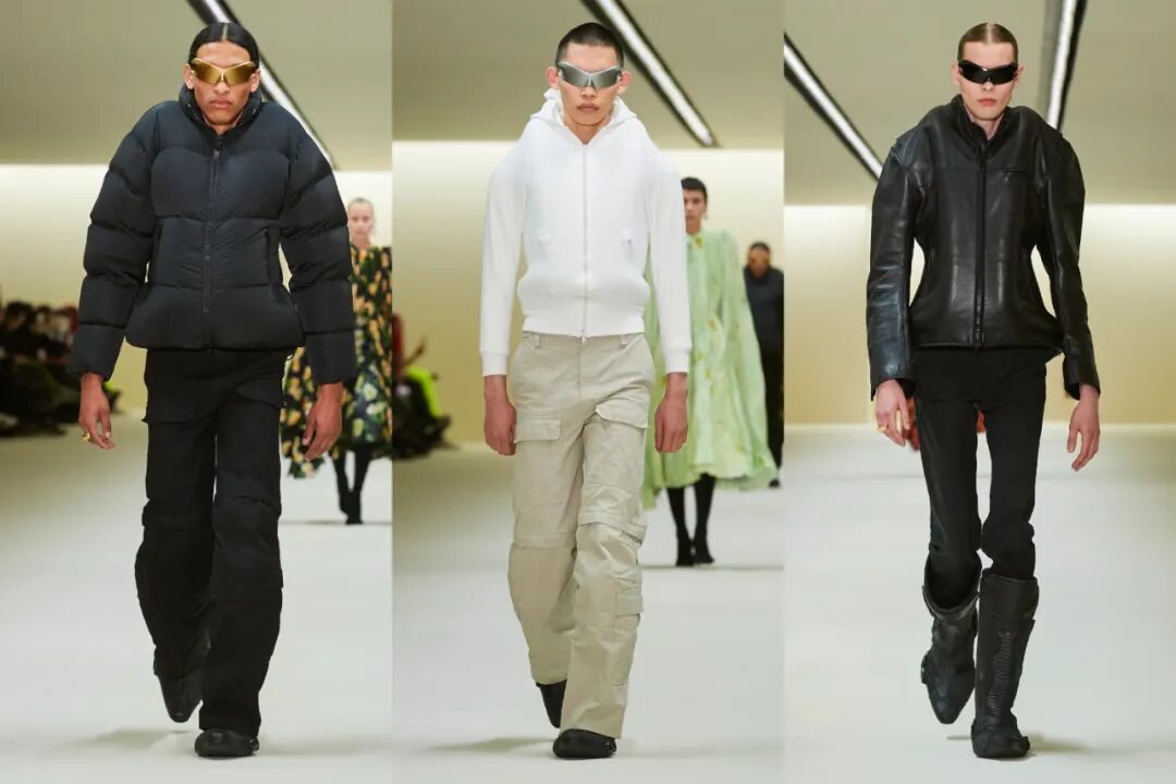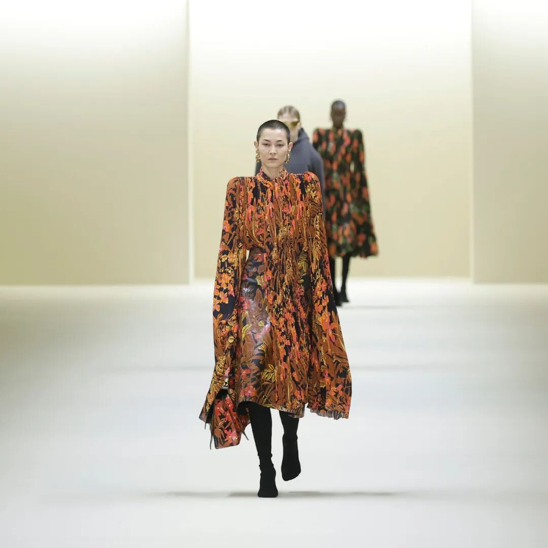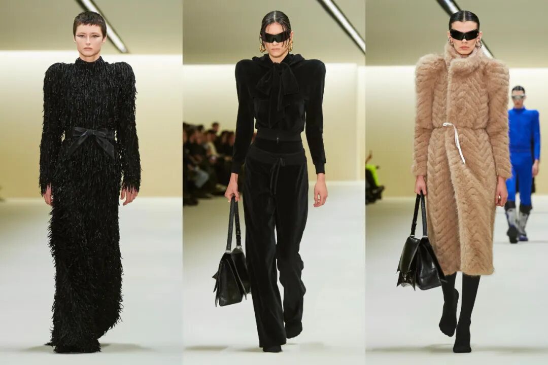 不少出现在上一季高定中的造型,以相似的样貌再出现在了成衣秀场,直角垫肩、高领礼服都充满Demna式的未来式古典审美。
