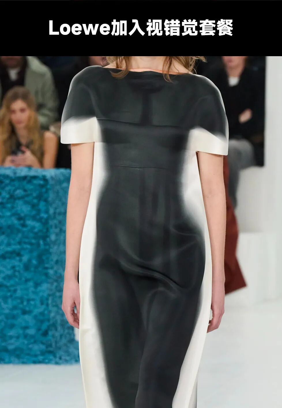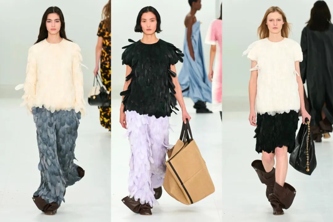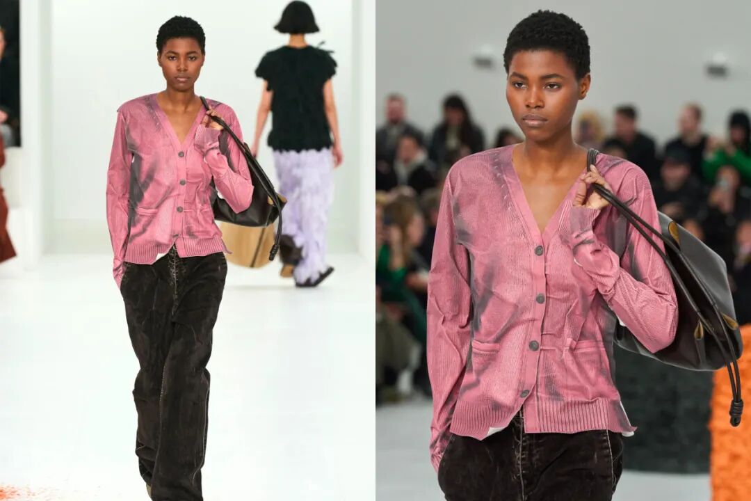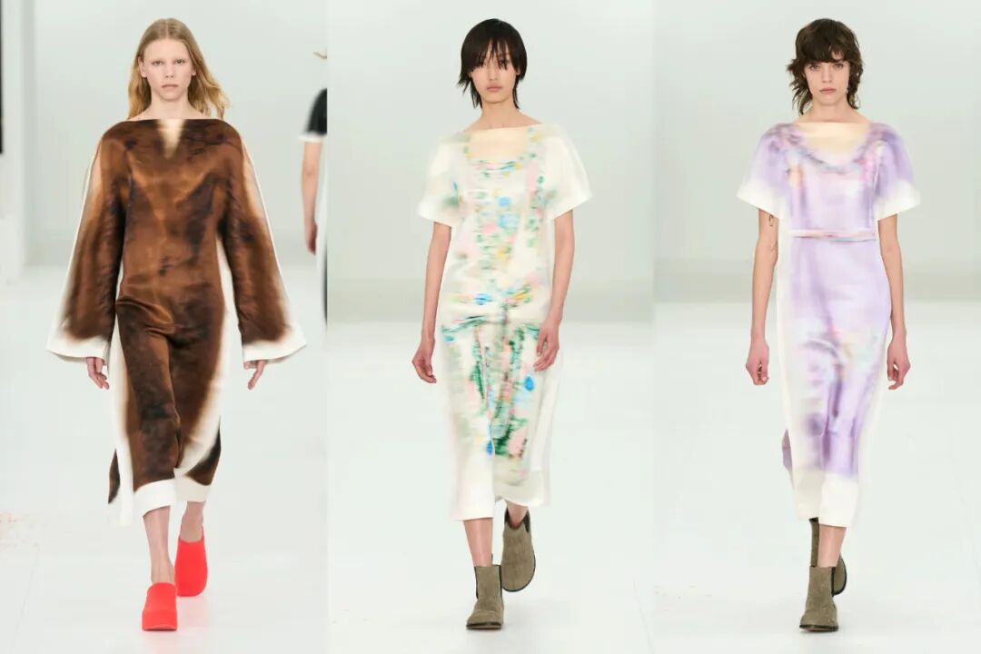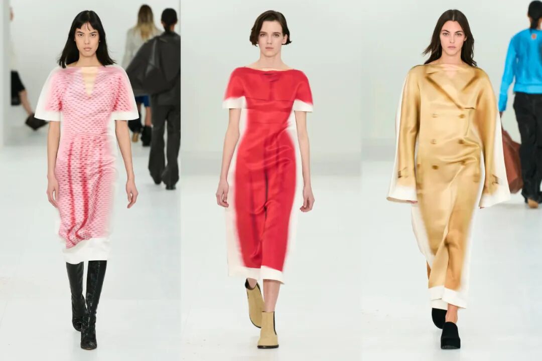 毫无疑问的,视错觉印花式近几季中,设计师最爱用的元素之一。Jonthan Anderson将五十年代的裙装、大衣以一种模糊印花的方式转印在了秀场的缎面裙上,而裙装的边缝设计又赋予廓形一种2D图像的平面感,极其有趣。