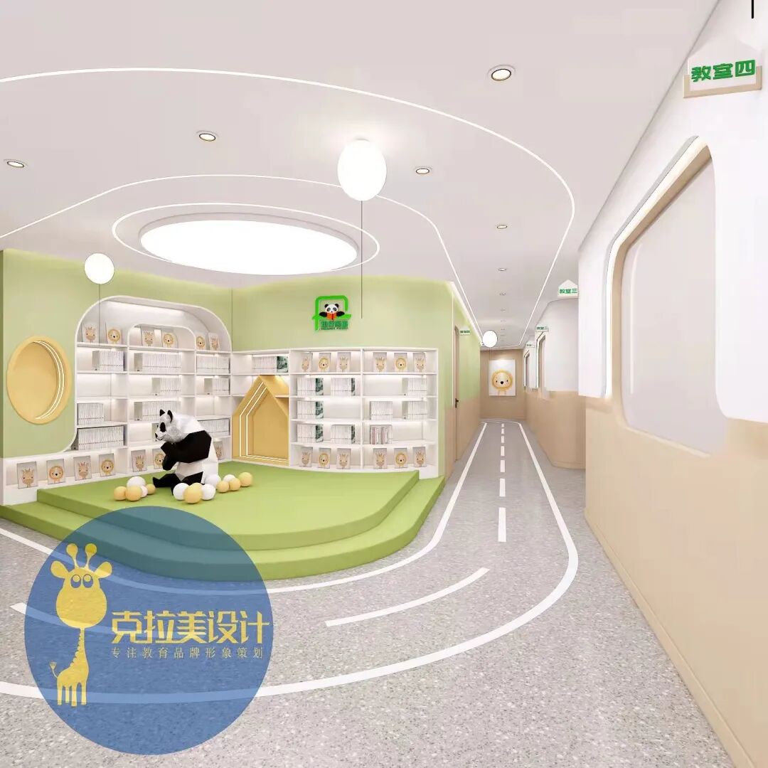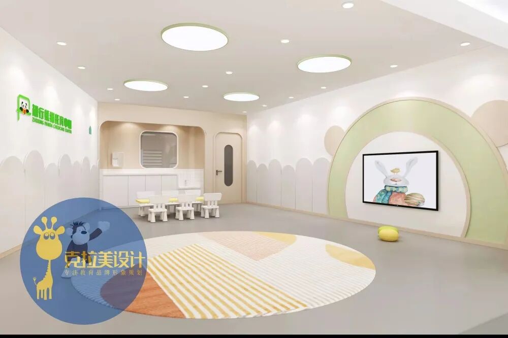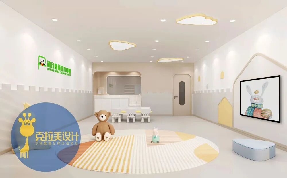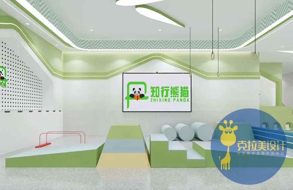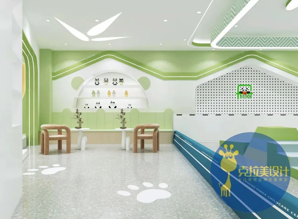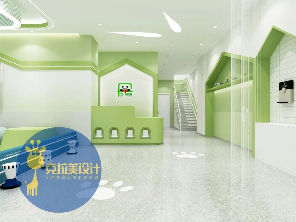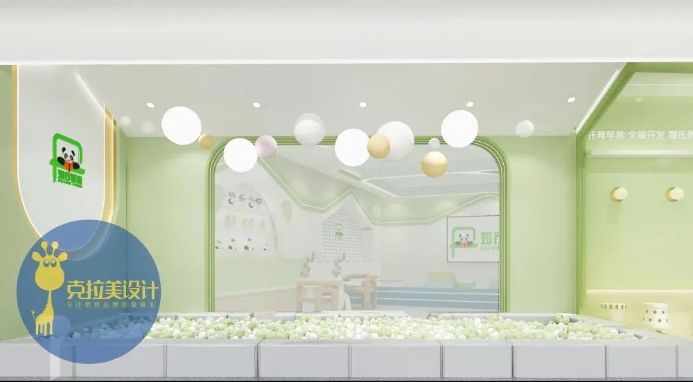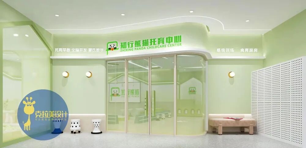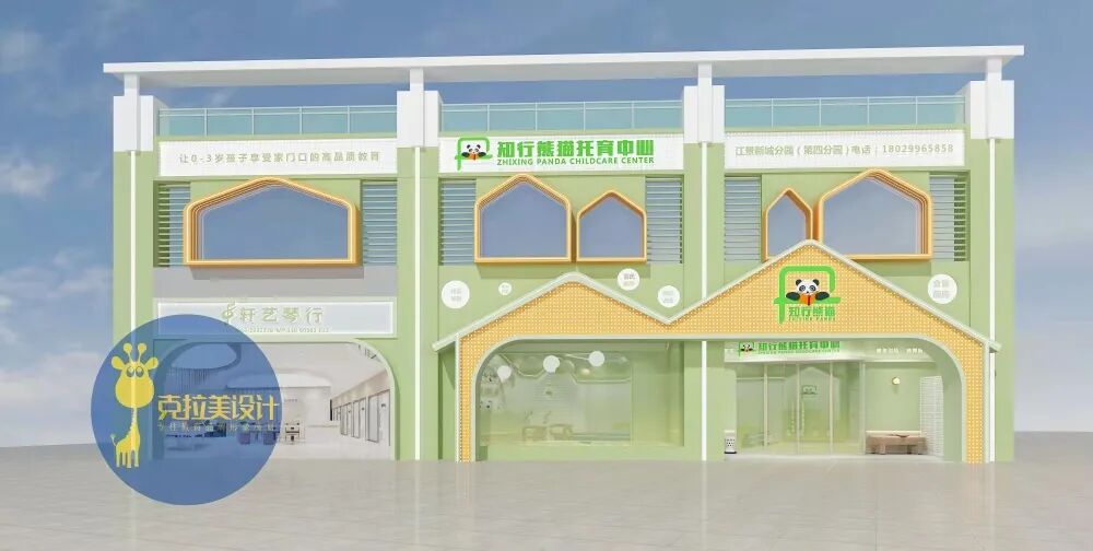 独特门面能够带给家长和孩子良好的第一印象,也可以吸引孩子的注意力和兴趣。所以在托育中心门头设计风格上要达到亲切,醒目、难忘的目的。克拉美设计师在浅绿色门头的基础上加上木屋的门窗造型,打破沉闷的同时贴合了知行熊猫的品牌定位。