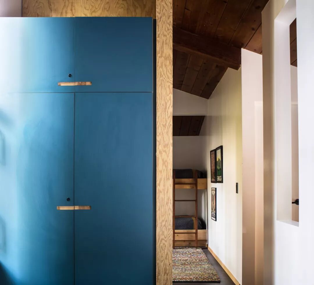 不加修饰的木材在这栋房屋里起到不可或缺的作用,不同的花纹和颜色令空间更有层次感。在蓝色和黄色的点缀下,更增添了活力。一张办公桌放在落地窗前,实现了与大自然的零距离。