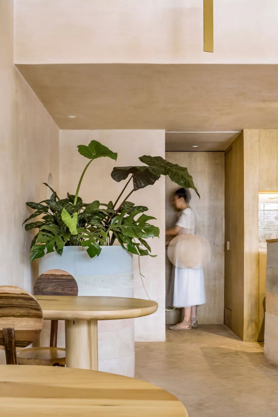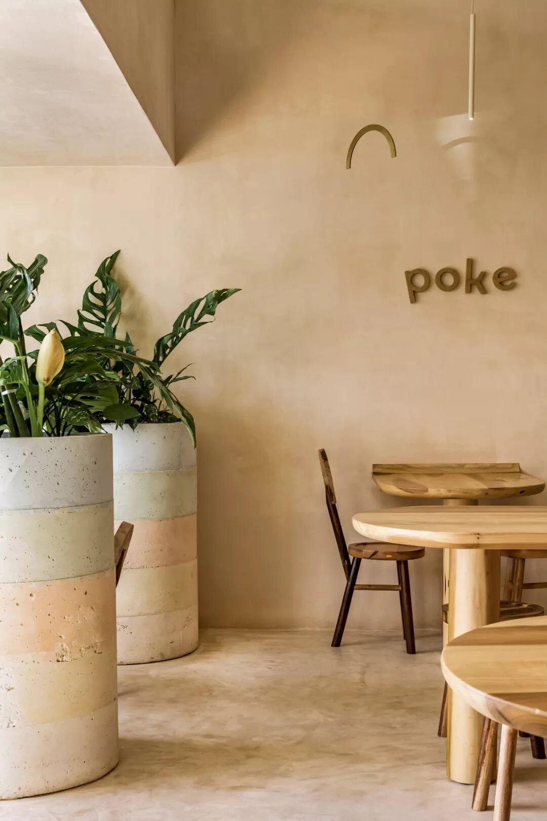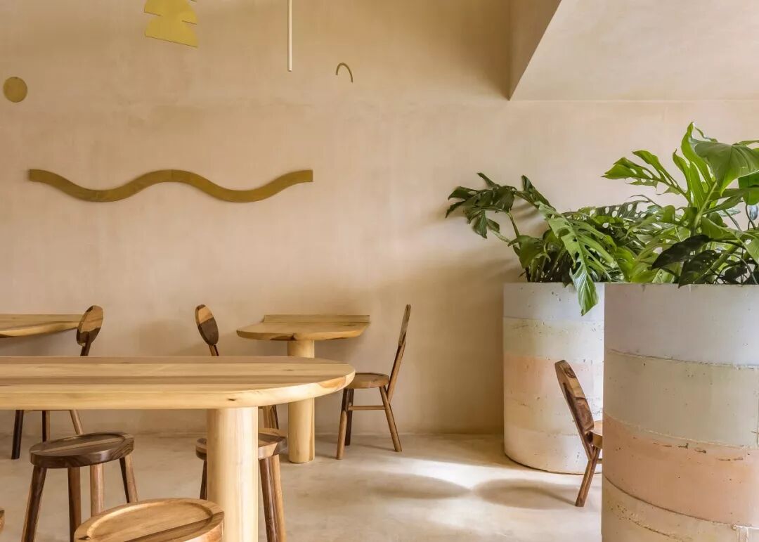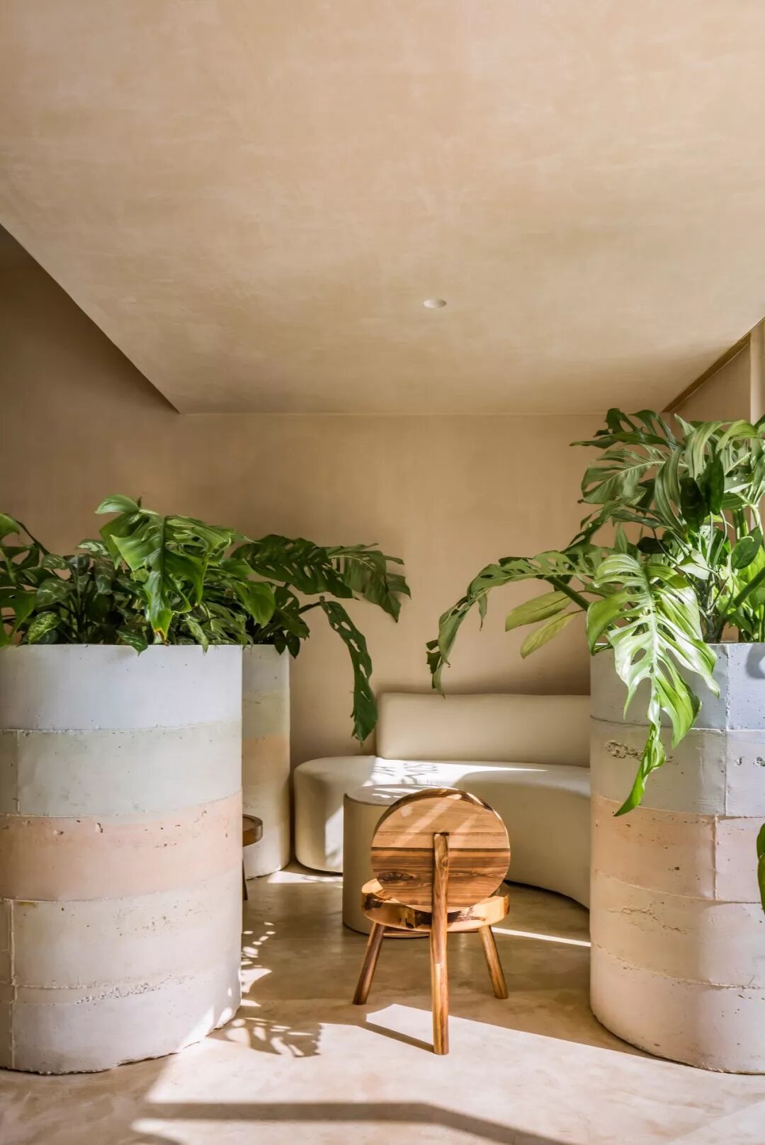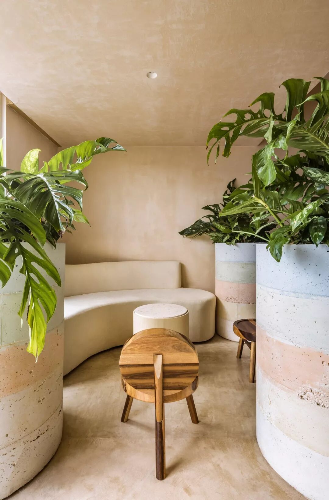 这间餐厅的内部使用一种古老的灰泥,色调温和,给人舒适感受。超大的彩色泥土花盆,种着绿意盎然的热带植物,令整个空间更有生命力。