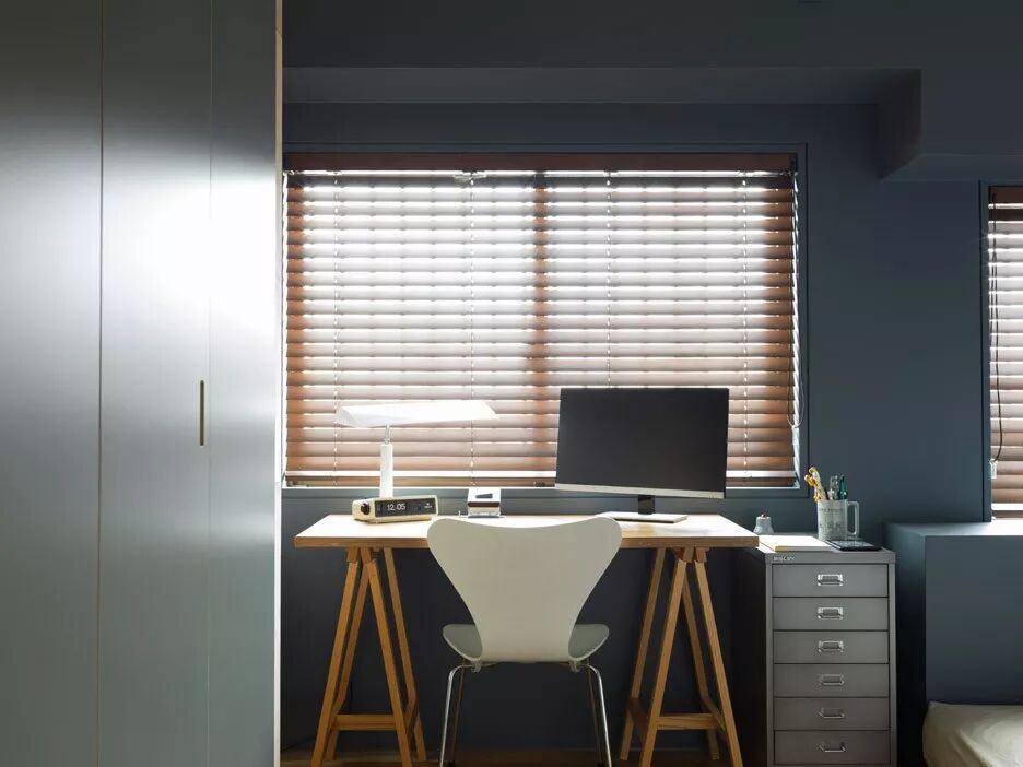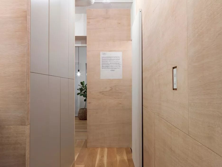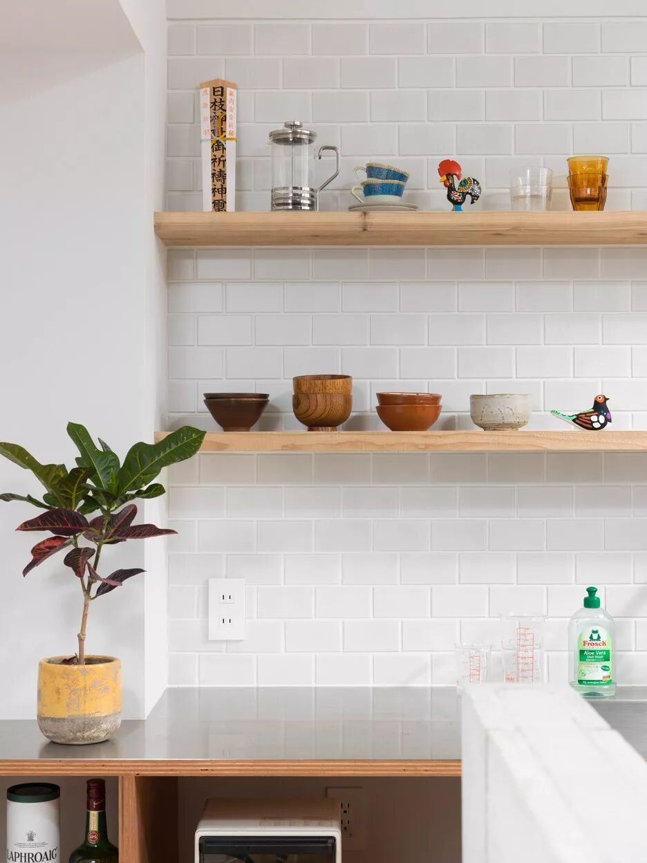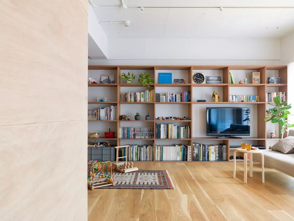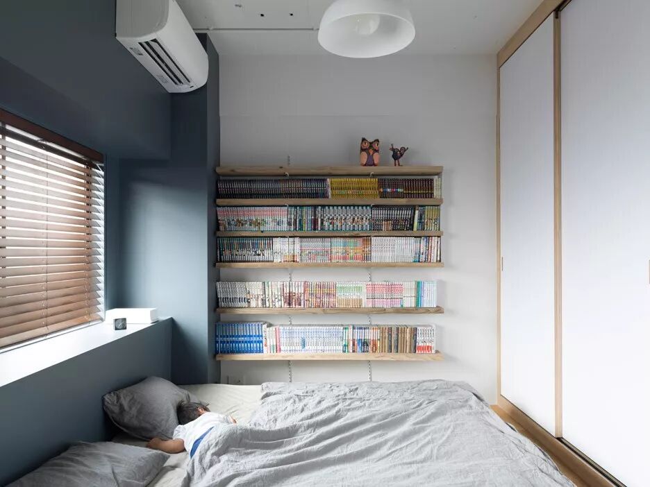 为了适用于家庭,增加了木质隔断划分出不同功能区域。不同的区域粉刷成不同的颜色,颜色深的是卧室,而生活空间选择更亮眼的颜色。置物架合理的利用墙面空间,充满生活氛围。