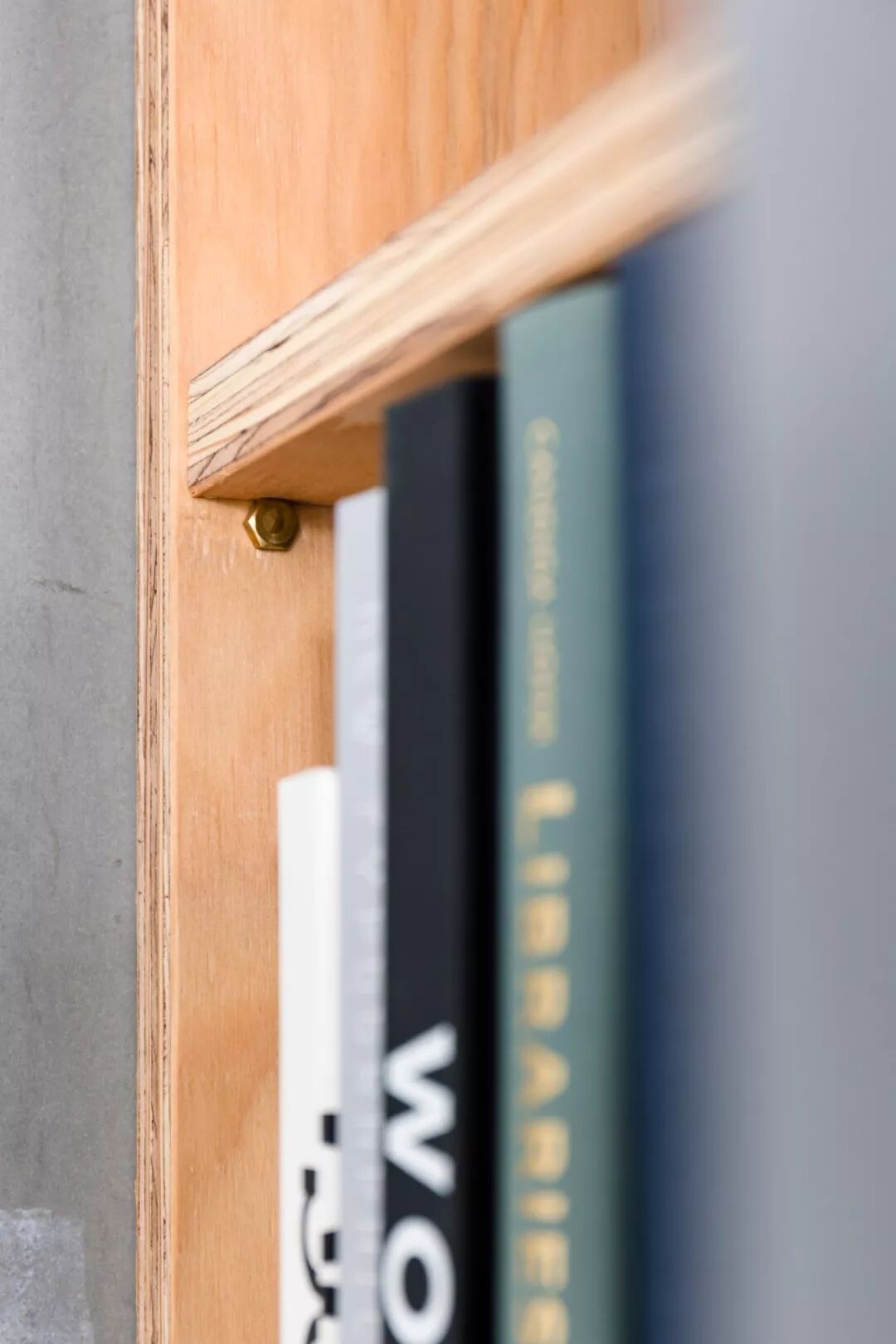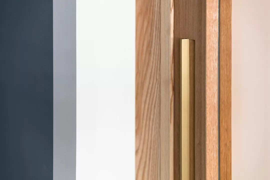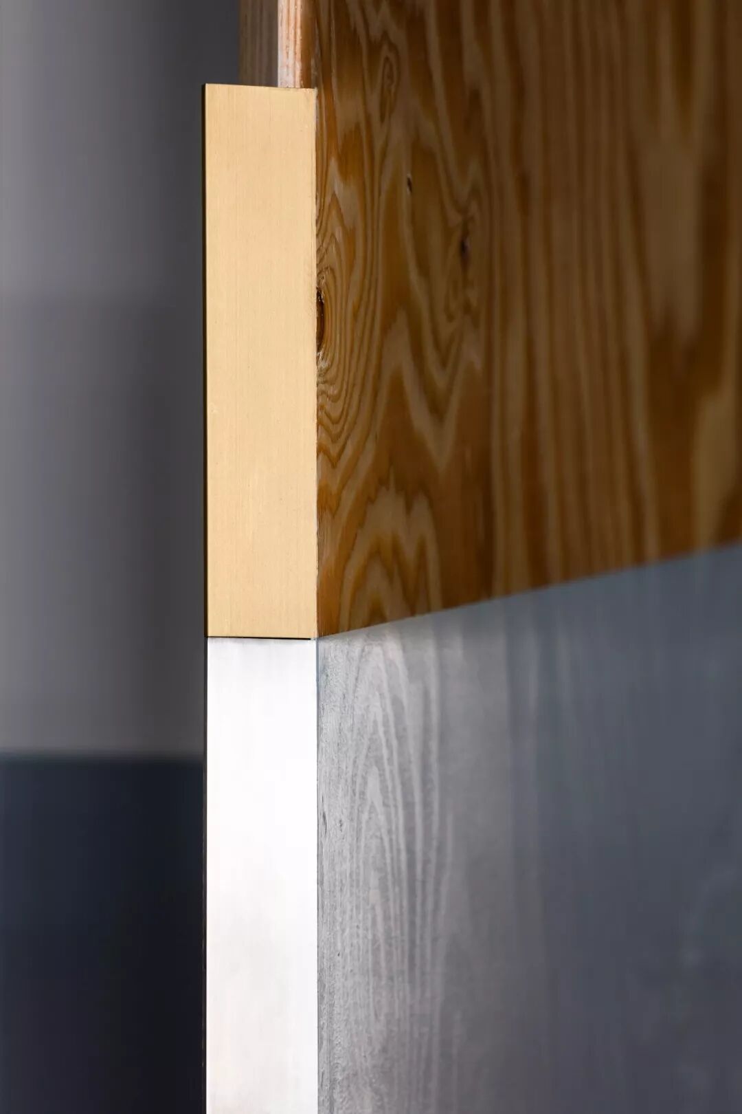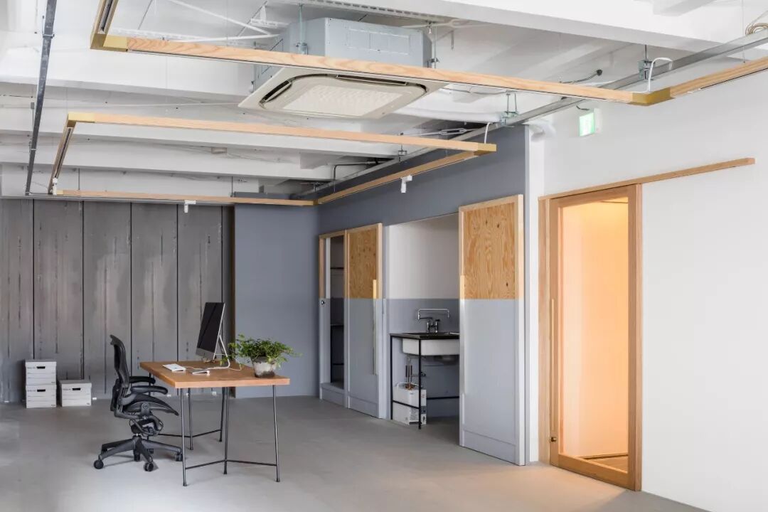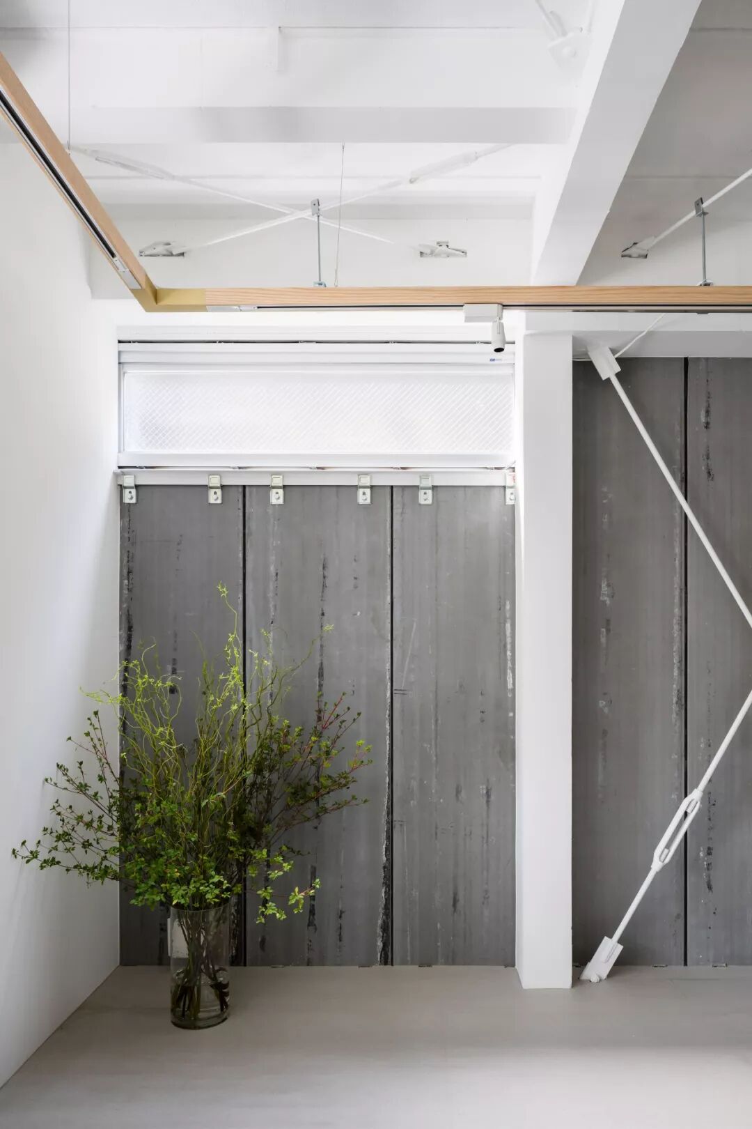 灰色打底的工作室宽敞素雅,木条围绕的天花板凸显简约的工业设计风。粉刷了一半的木门呈现层次感,从而调节室内氛围。