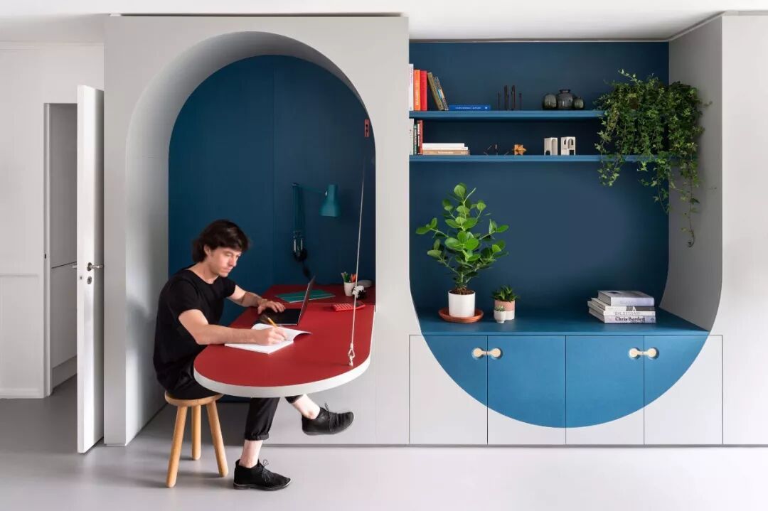 拱形空间被蓝色覆盖,一面可以办公、学习,另一面是儿童床和玩耍的区域。增进家人的感情,带来欢乐气氛。