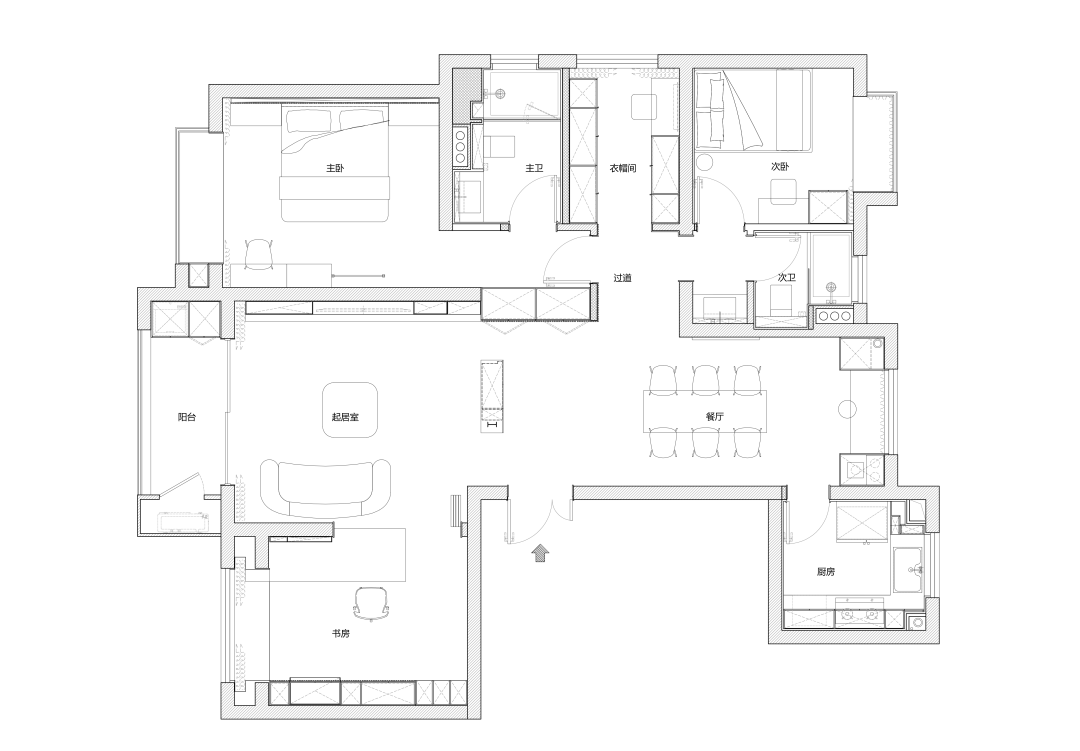重新诠释客餐厅的空间,用工字钢与柜体进行组合形成玄关柜,搭配竖向栅格储物柜,让玄关消失在空间中,从而把客餐厅的距离感拉开。不同高度的方块如同两颗错落有致的陨石,推开即是另一片时空。