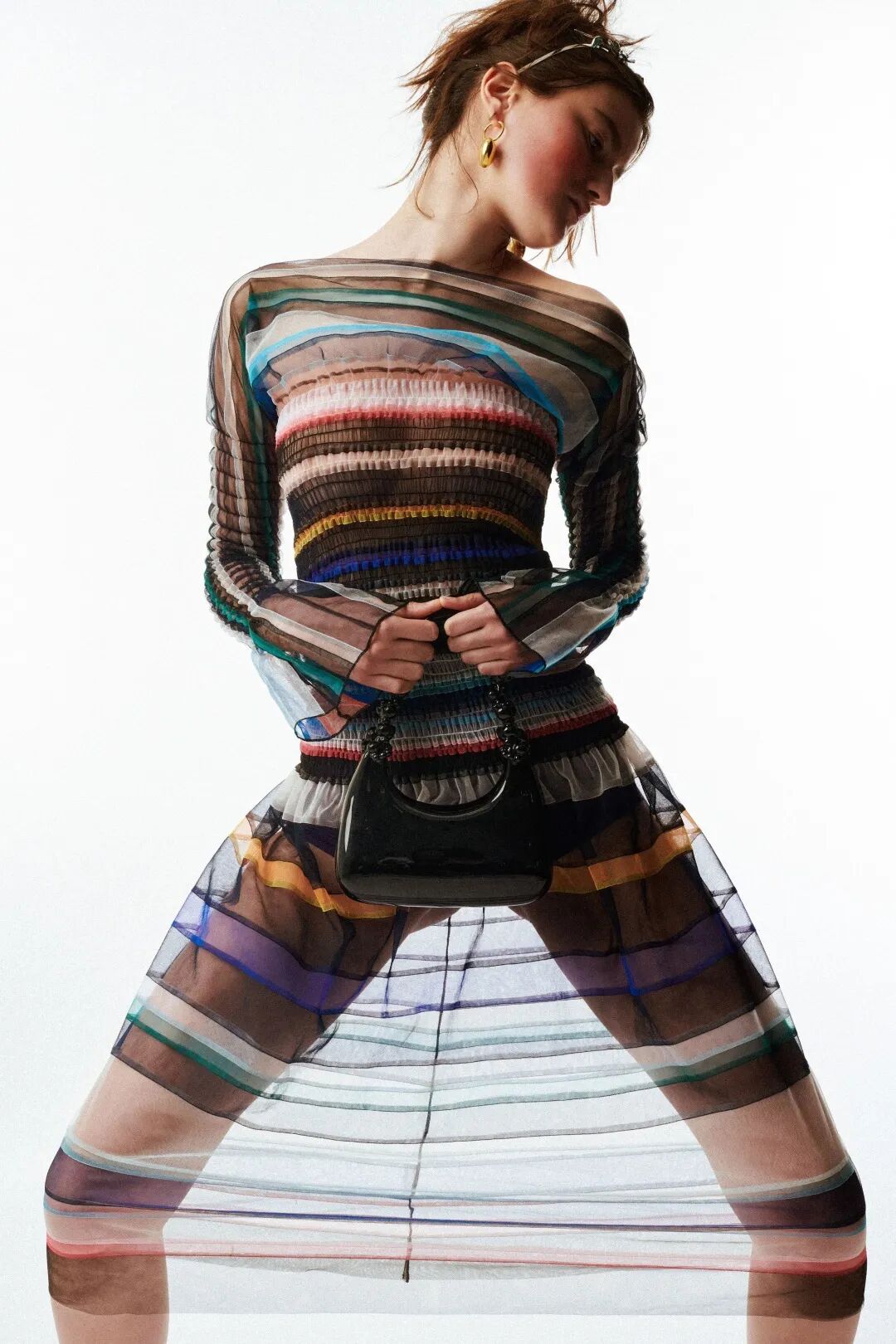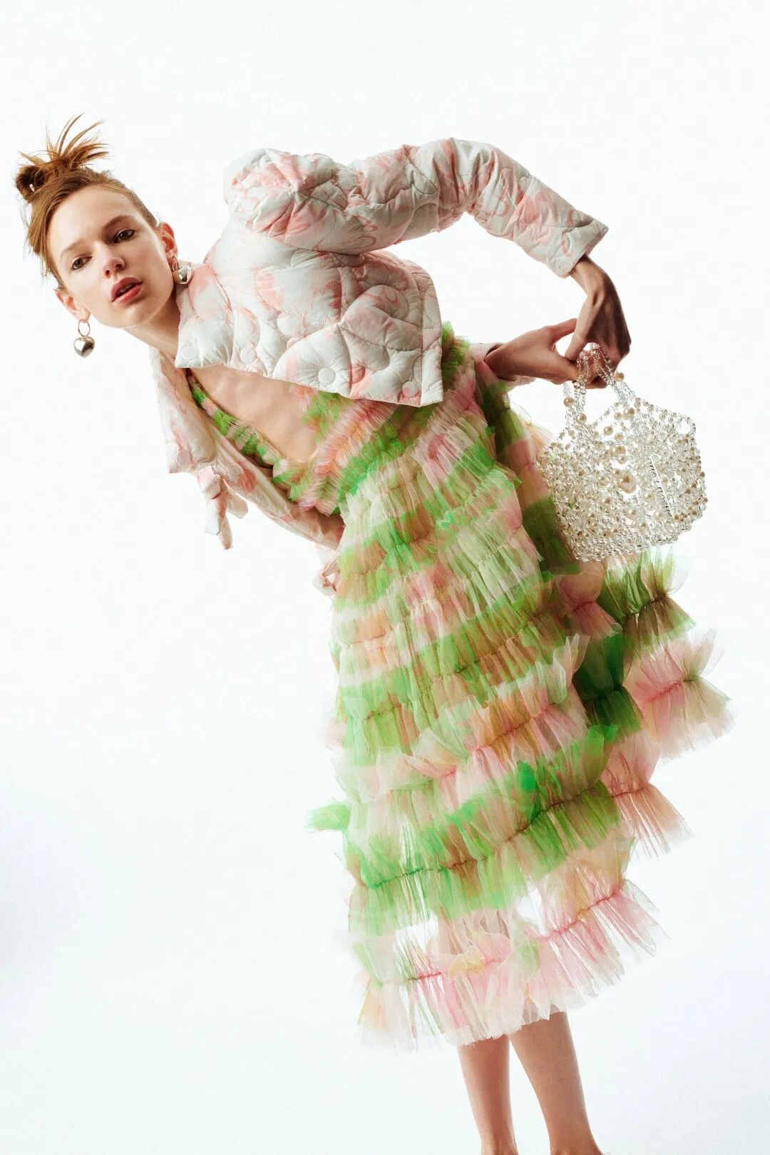 SUSAN FANG还会像画家一样运用颜色和纹理丰富服装的内容,系列的罩衫、羽毛般的针织、绗缝衬裙就是最好的佐证。