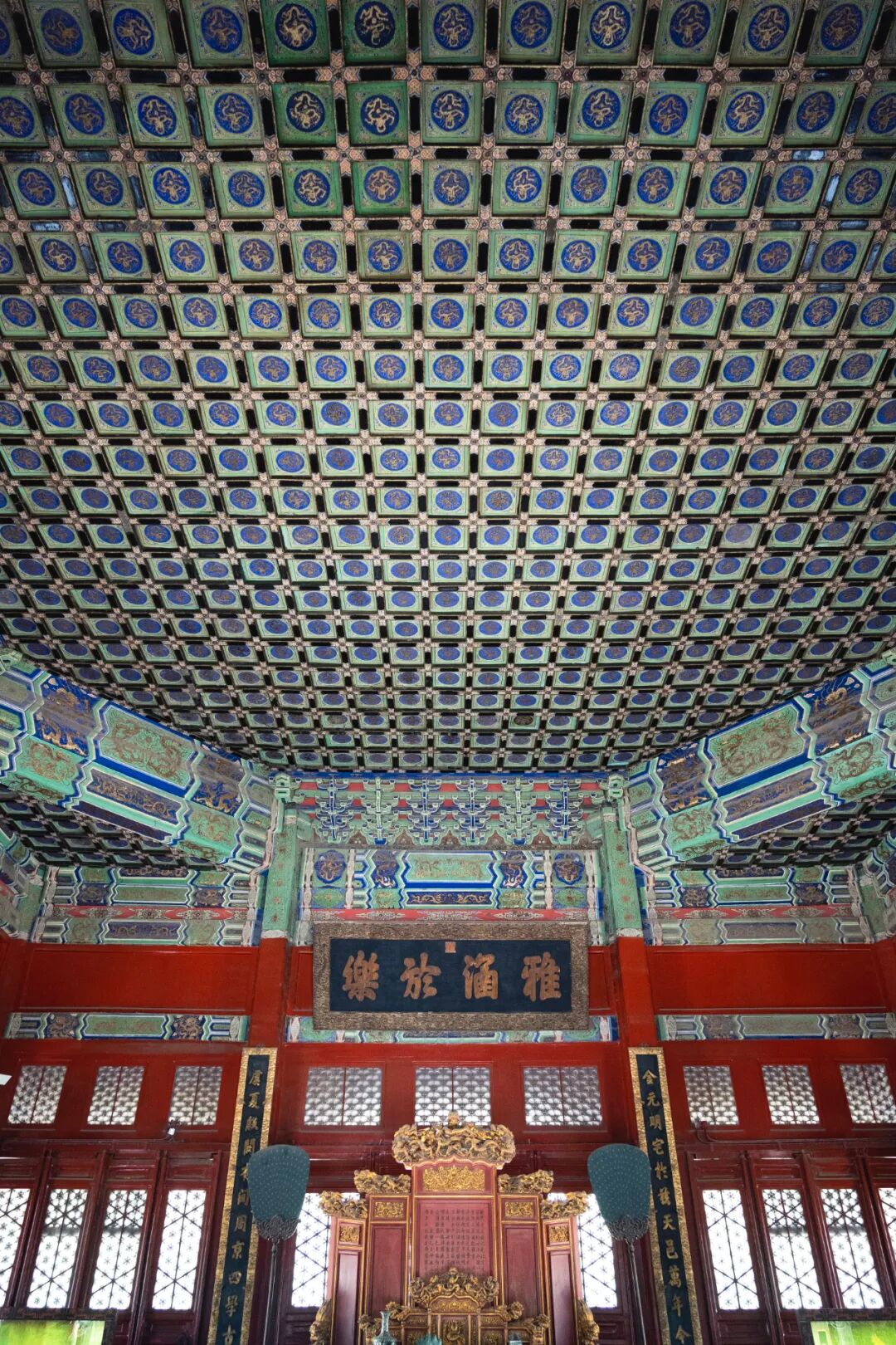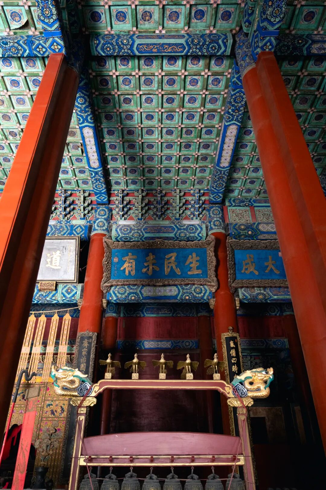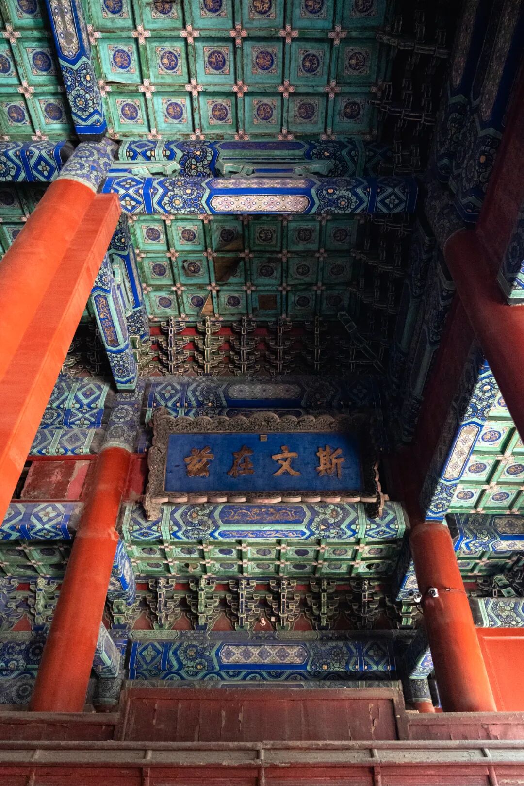 今天的辟雍大殿内没有另设其他光源,仅以自然光照明,但即使是在这样相对昏暗的光线下,我们仍能清晰地体会到何为金砖墁地,何为天花鳞甲,感受到什么是雅涵於乐,什么又叫涵泳圣涯。