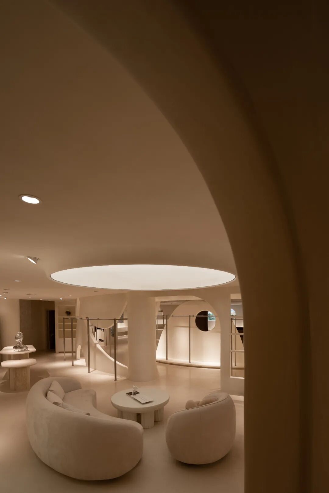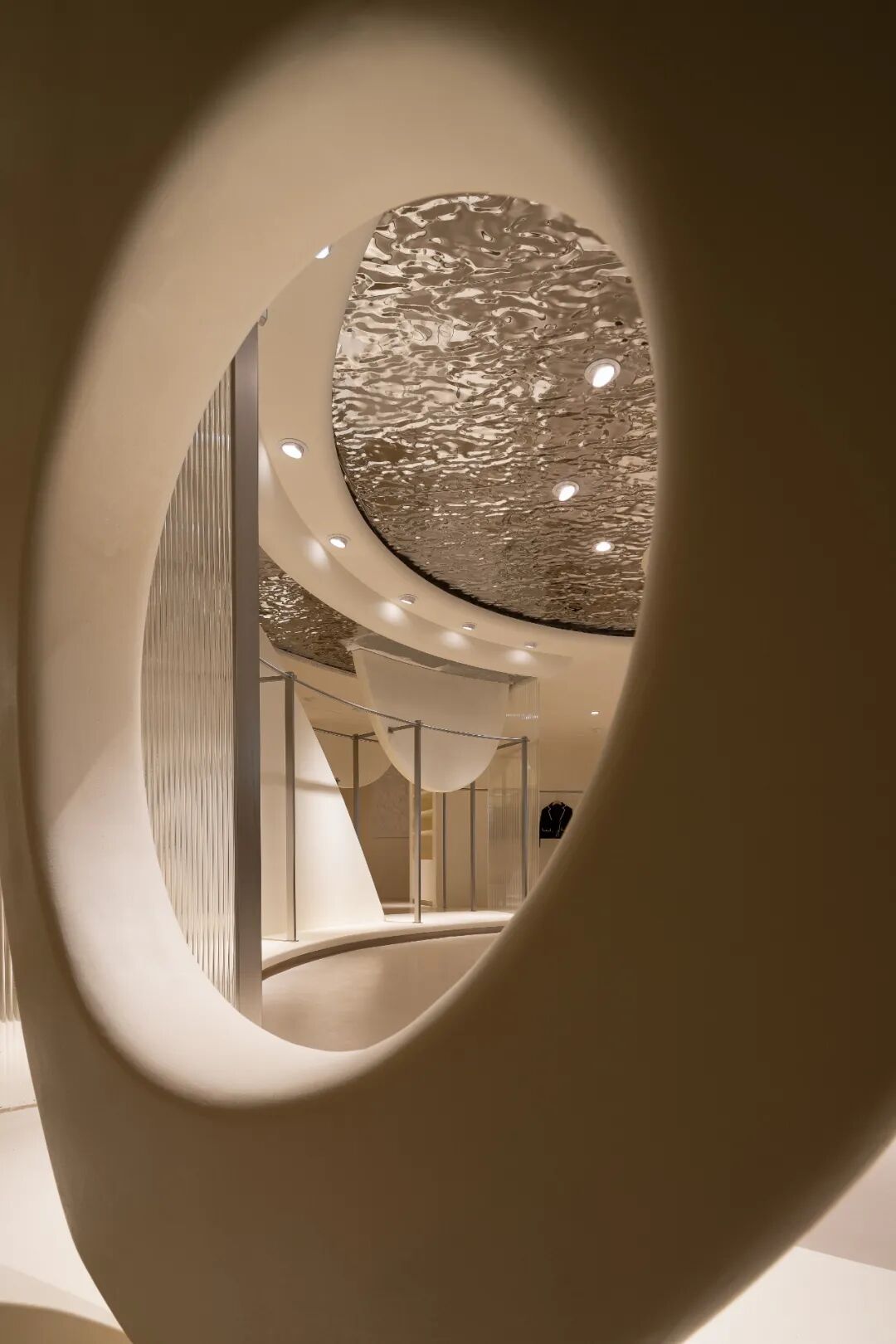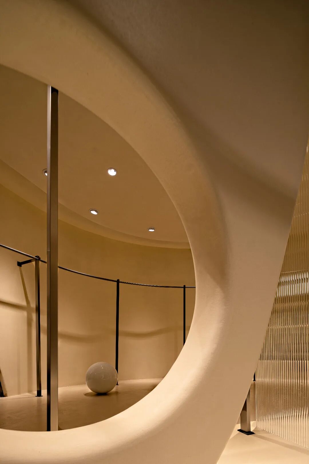 双曲线、抛物线形式的隔断,既展现了空间的柔和美,又不形成封闭的空间阻隔。在空间的视觉营造方面,移步换景正是曲线应用的优势所在。曲线与曲线之间相互交错,曲线又与产品陈设相互呼应。无论是水平视线还是垂直视线,空间的变换总能让人心生惊喜。