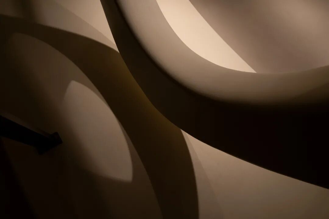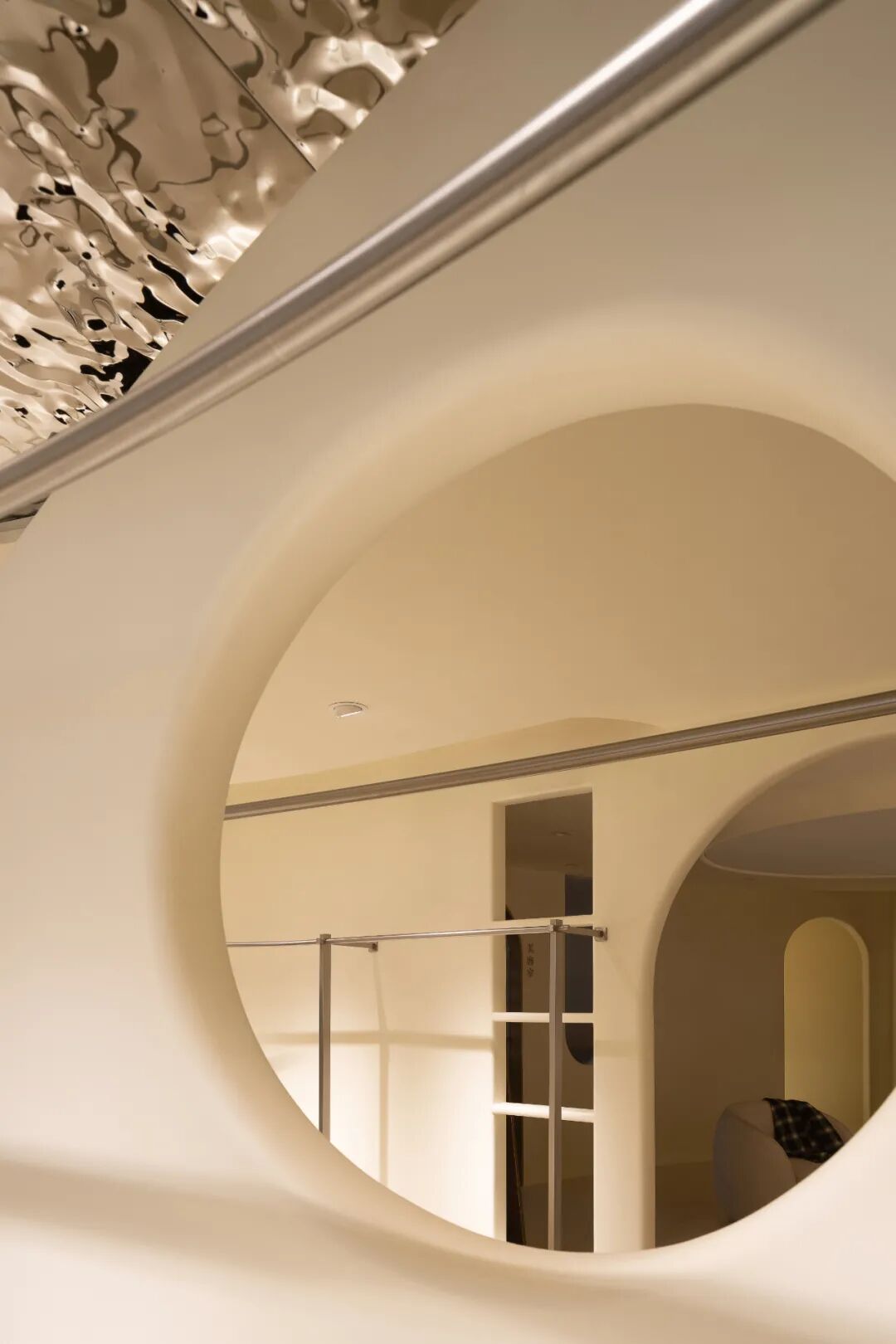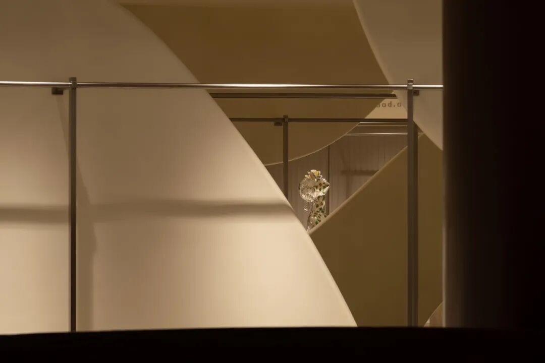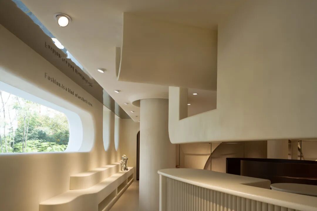 双曲线、抛物线形式的隔断,既展现了空间的柔和美,又不形成封闭的空间阻隔。在空间的视觉营造方面,移步换景正是曲线应用的优势所在。曲线与曲线之间相互交错,曲线又与产品陈设相互呼应。无论是水平视线还是垂直视线,空间的变换总能让人心生惊喜。