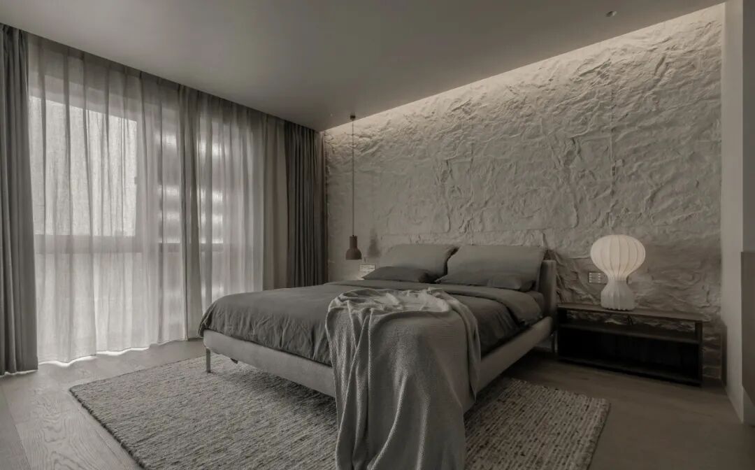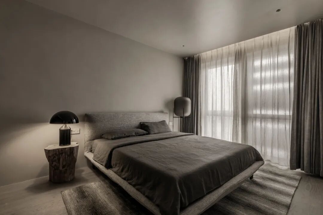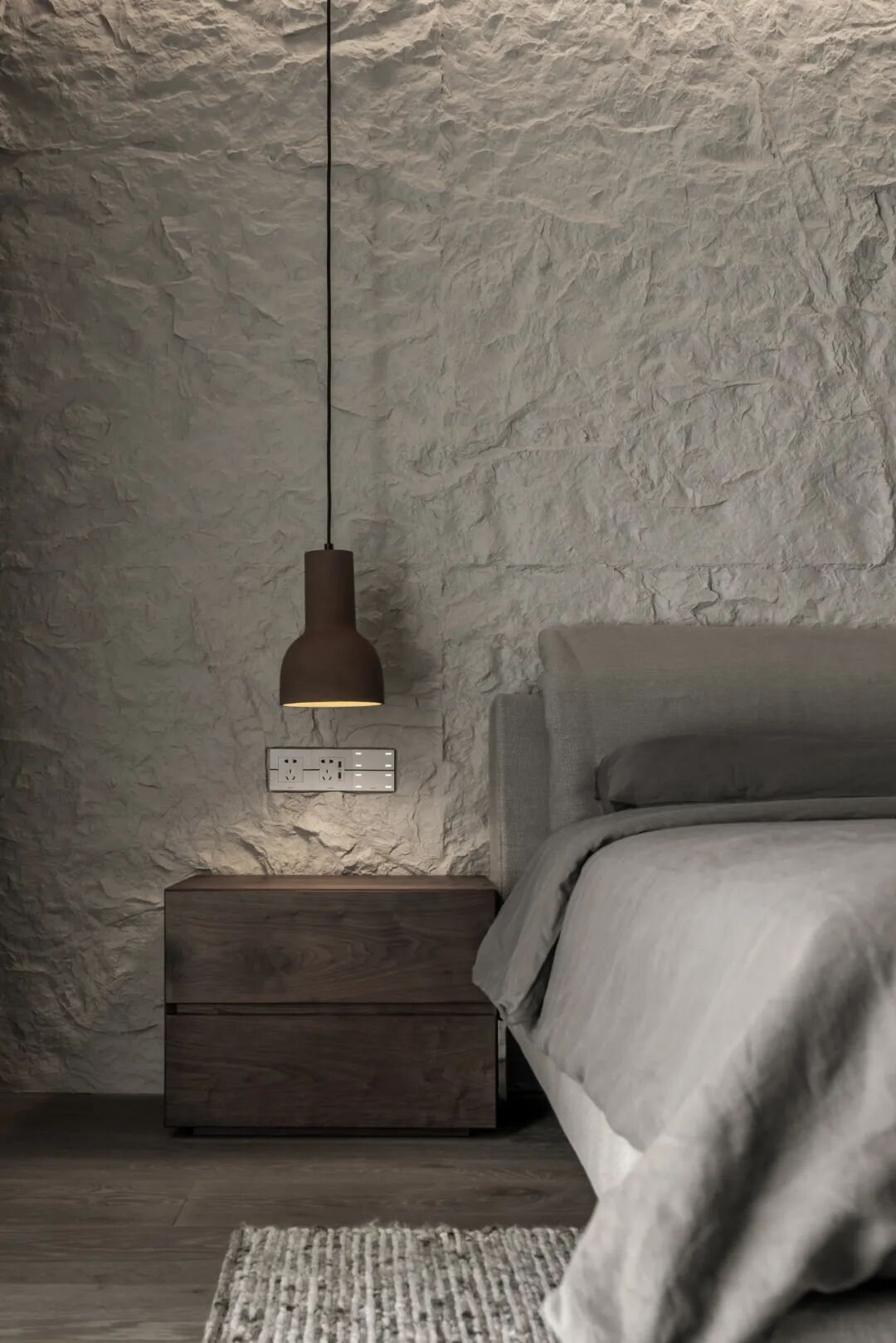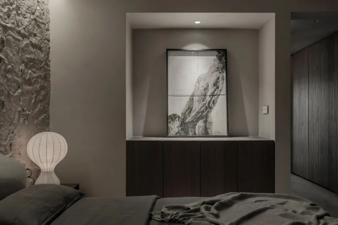 不会有鲜艳跳脱的色彩出现,没有繁杂的线条装饰,浅灰色系贯穿卧室空间,设计师注重人与生活的本质,感悟内心的平静。木柜艺术斑斓的色彩与纹样丰盈苍白的墙体、朴素柔和的寝具,在平静的空间轻抹一份清丽明亮的情绪氛围。