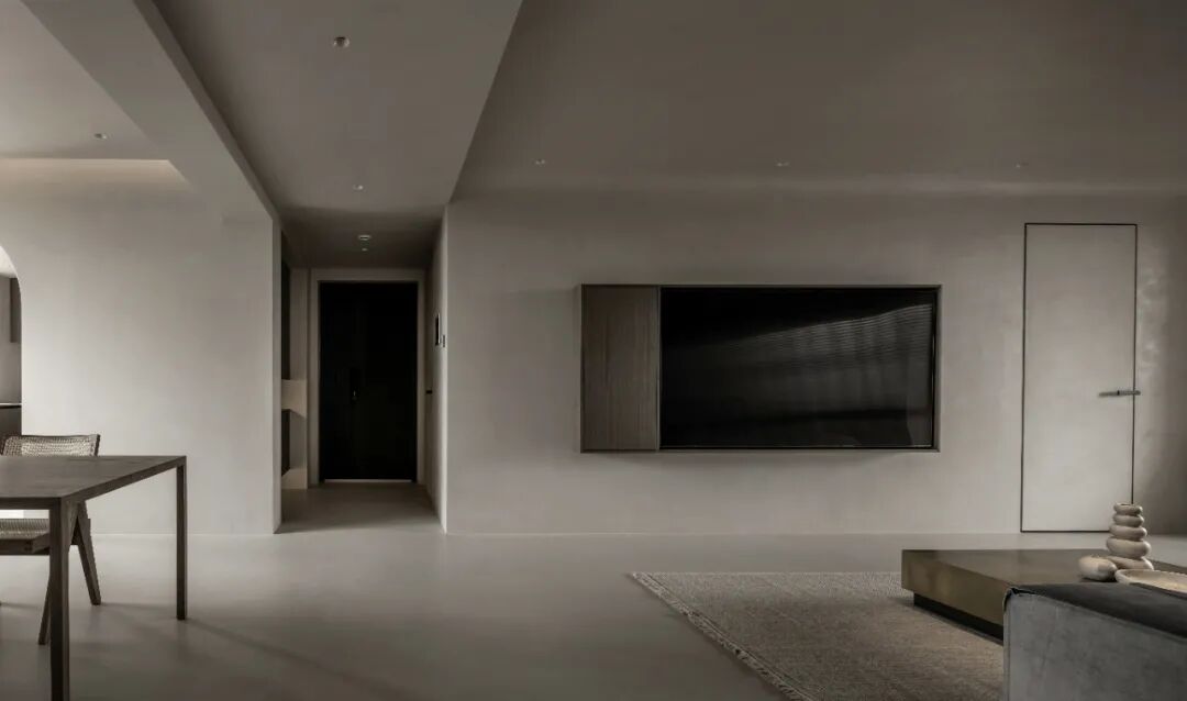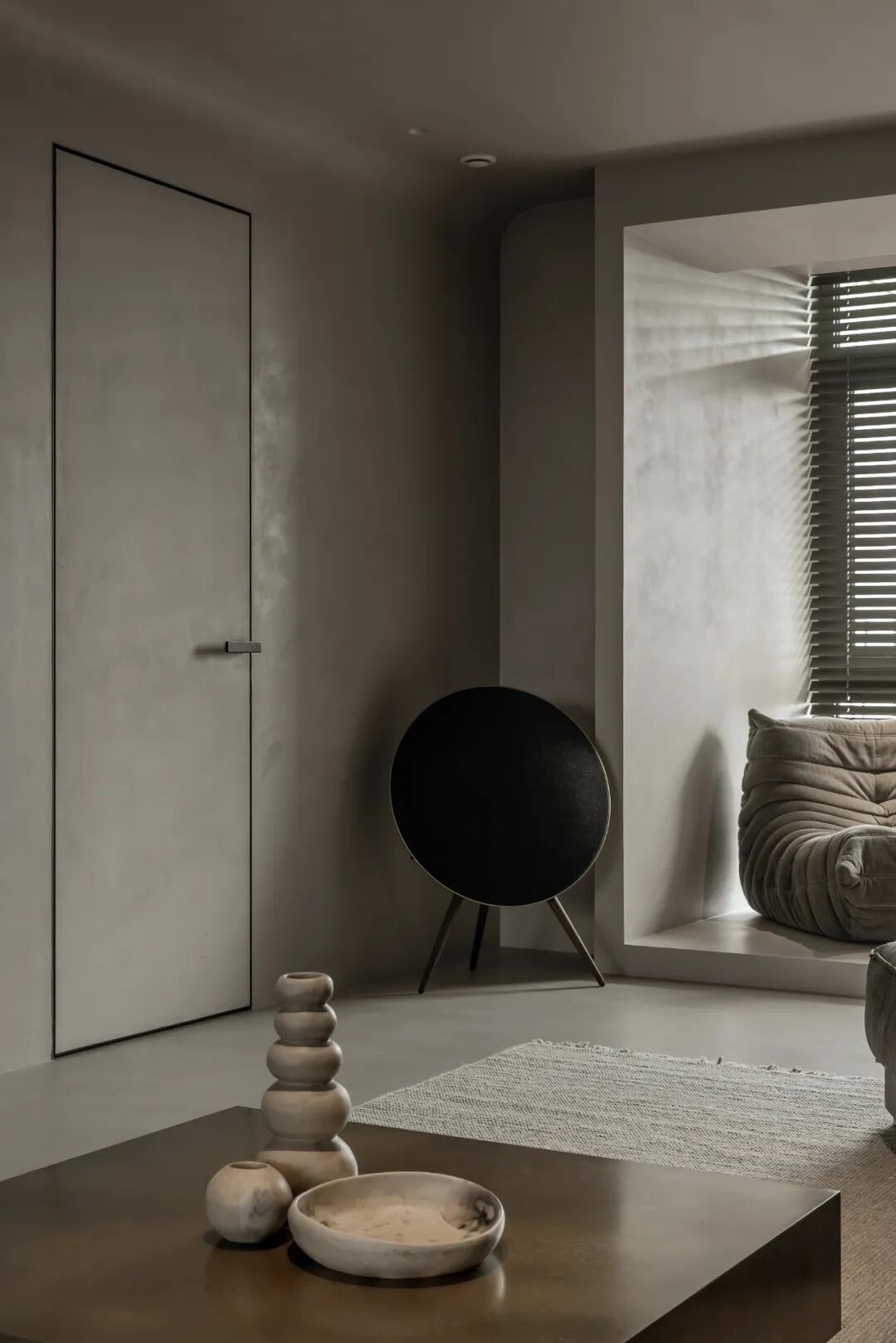 本案是位于繁华的北京城,设计师以侘寂美学为出发点,运用以静制动、以空代满、以残为美的东方哲学,褪去城市及空间繁冗华丽的外壳,让空间回归至与人的内在共鸣。