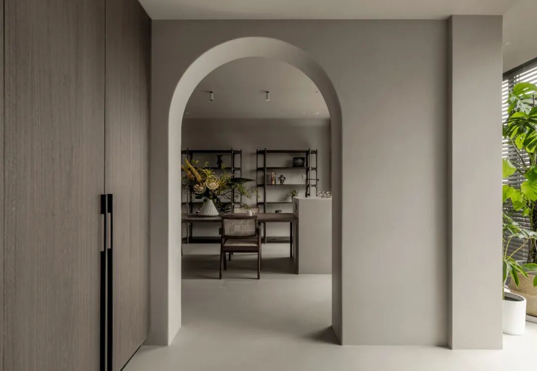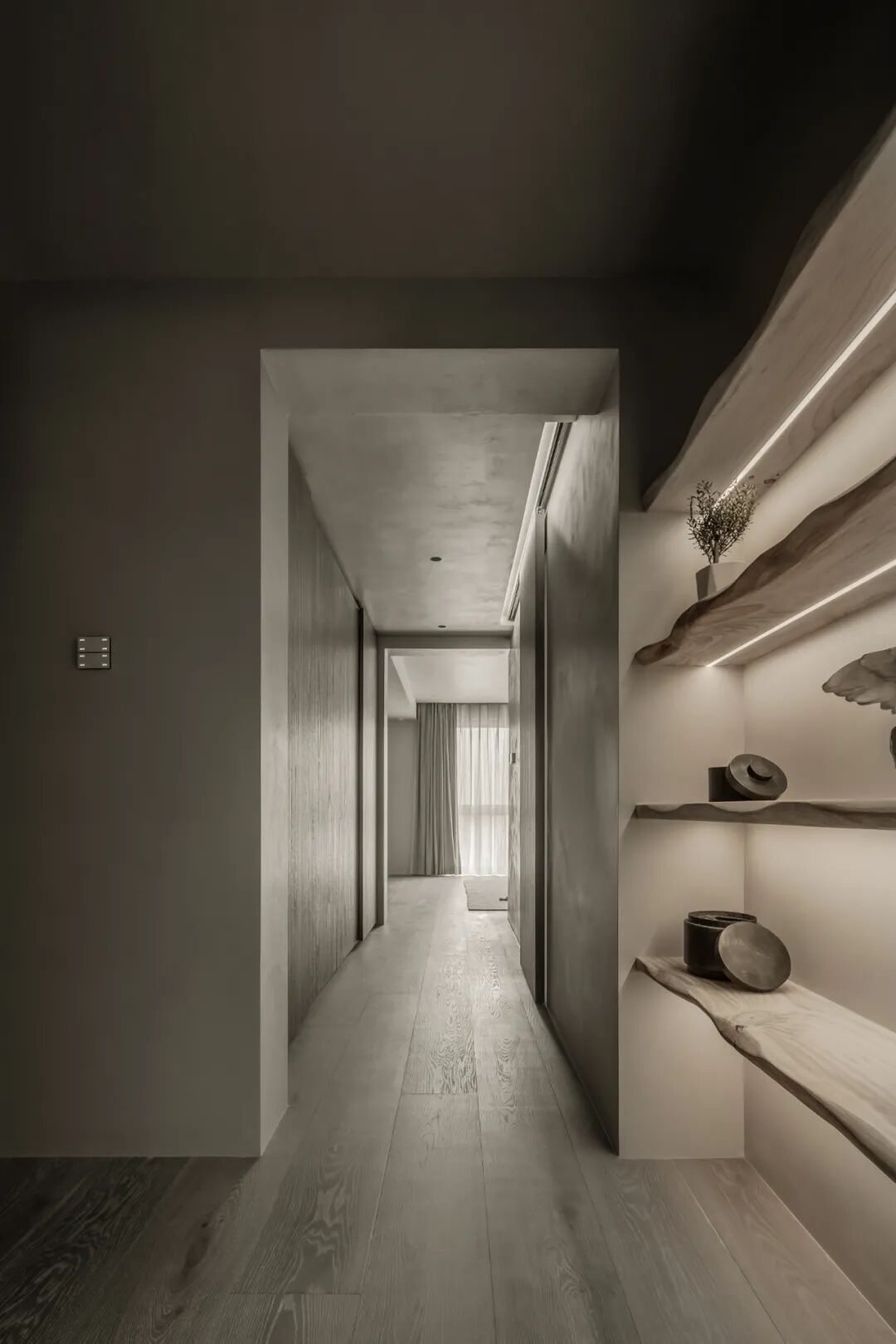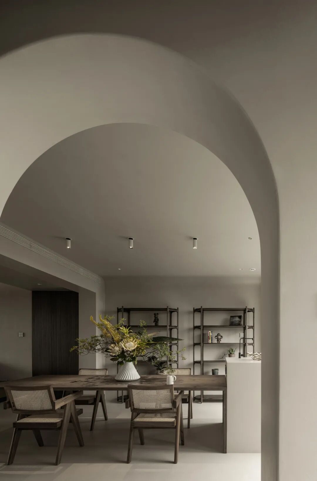 启户,整个空间大面积留白侘寂美,承载了纯粹且过目难忘的意境,左右两侧为休闲待客的客餐厅、向前则进入更为私密的寝居空间及衣帽间、佛堂,每个体块的自由穿插与亲密连结,动线清晰合理,从很大的程度上阐述了居者的一种简单洒脱的生活态度,释放居者的灵魂与思绪。