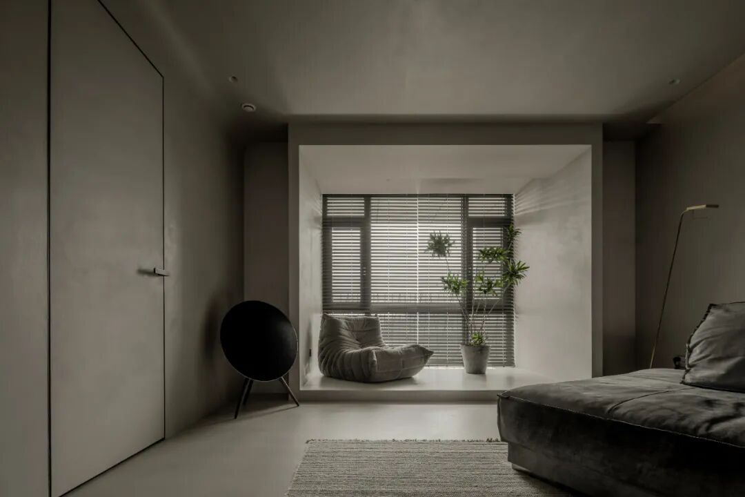 阳台巧妙地设计落地窗,无限采光的同时,让修长的花枝更显清新素雅,四壁及地板以中性色调为主,带有原生态的纹理或质感,用雾面代替所有光面,用质朴取代奢华,呈现侘寂质感。