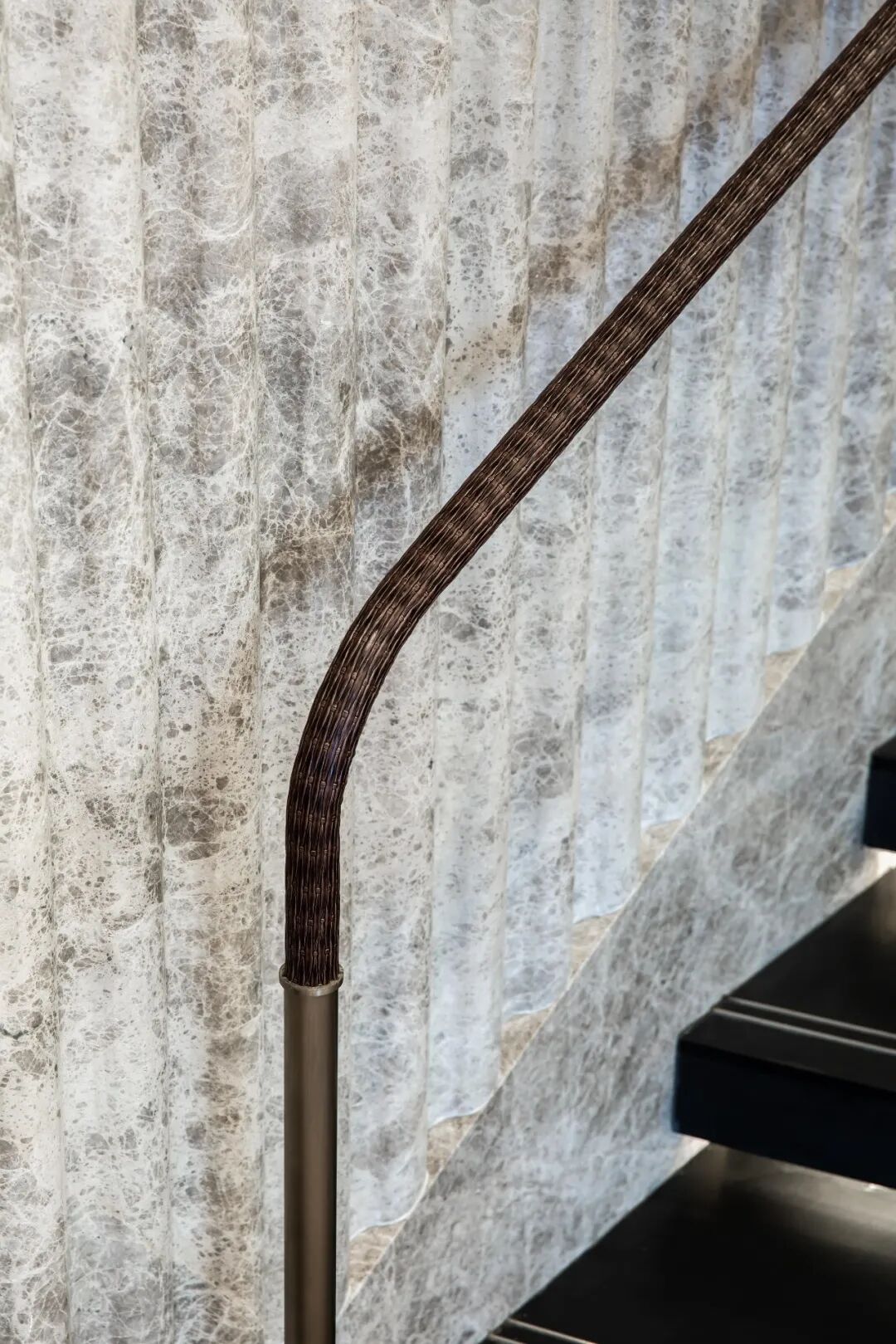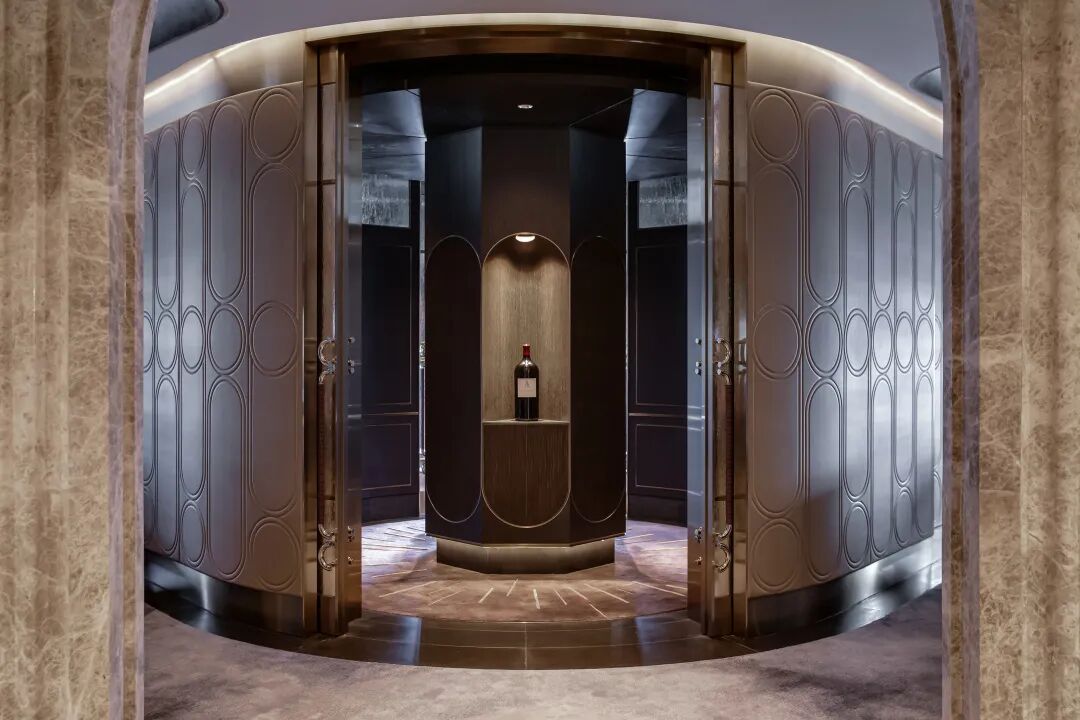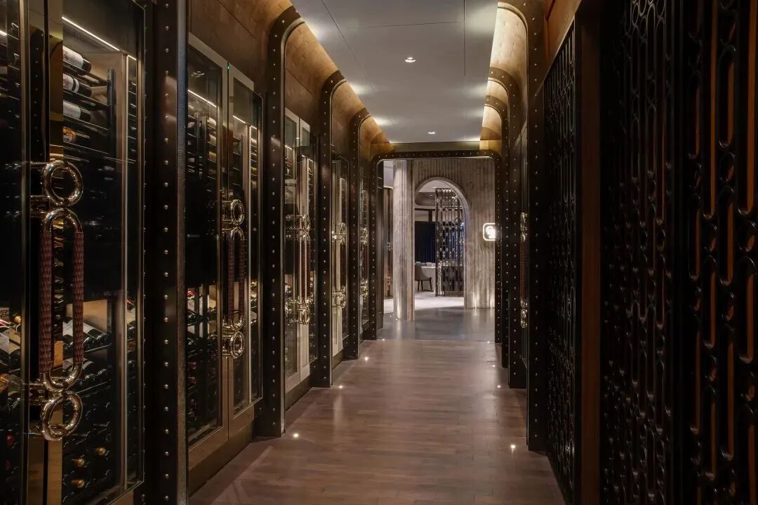 为连接酒吧与正式用餐区域的重要体验,设计师巧妙地令宾客“必须”经过此处这长长的豪华“品酒廊”—— 走过这酒廊时,宾客们自然地沉淀心境,并过渡到尊贵与正式的情绪当中。