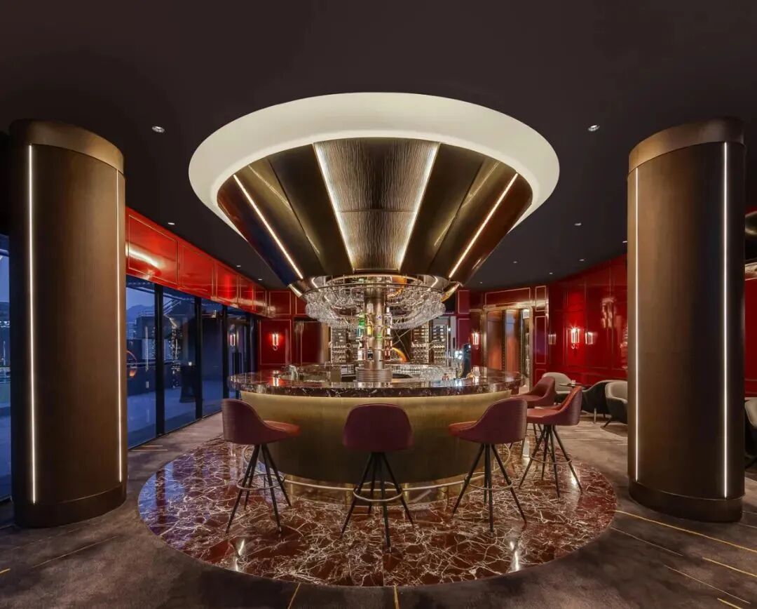 “吉澳吧” 是餐前小聚,感受赛马衝刺最热血沸腾的地方;这里的的主调颜色运用了红色,烘托“红醇烈焰”般的激情;而天花装饰又似赛马跑道、又似皇冠,令人遐想无限。