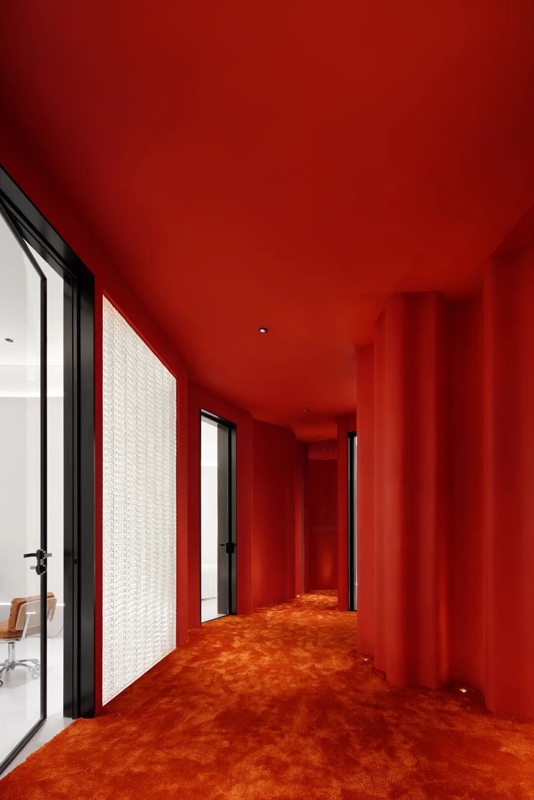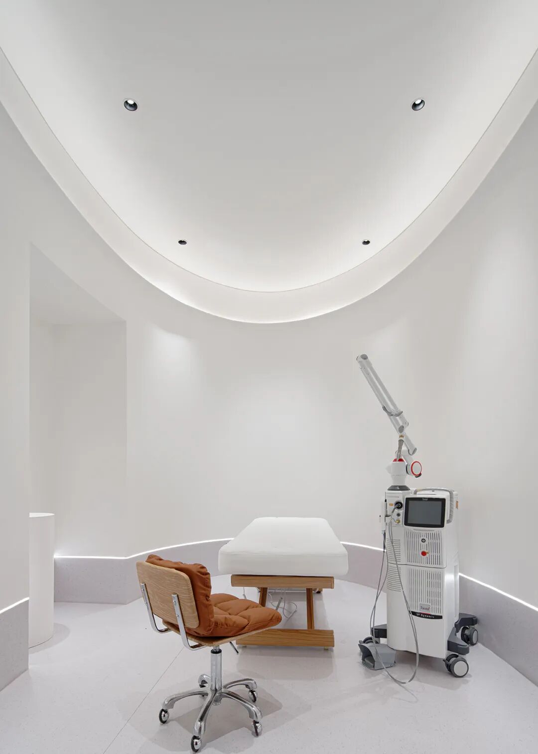 该项目坐落在广西南宁,项目室内面积600平米,上下两层,以及三个分别为接待、皮肤管理室和等候休息区组成。设计师在空间布局上,运用了颜色和材料的变化指示着不同的功能。