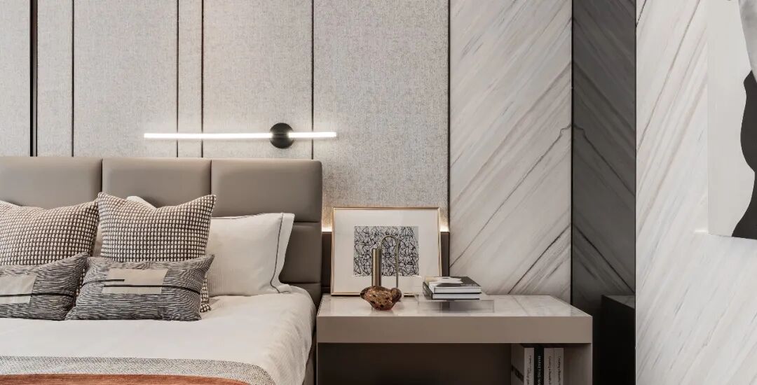 长辈房以时尚品质总领氛围、稳重平和的色调沉淀目光,闳雅堂软装团队利用拼色加叠的元素融入壁画床品上,勾勒素雅不失时尚的氛围,简约本身的魅力打造常看常新的静区体验。