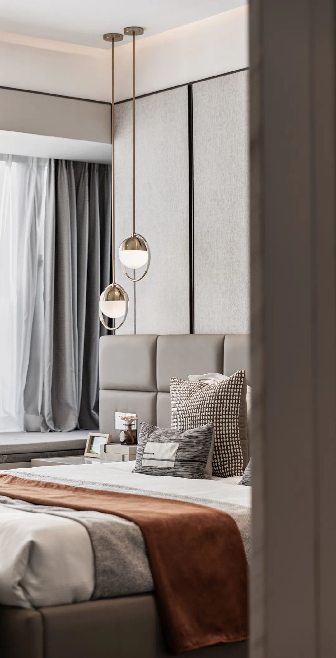 将精致品质连贯至主卧,此处延续客厅大环境中的高级灰与材质细节。线条与质感的双重跳跃下,主卧空间促成和谐共奏,安放着日间紧张节奏后的睡眠,消融压力释放疲劳。