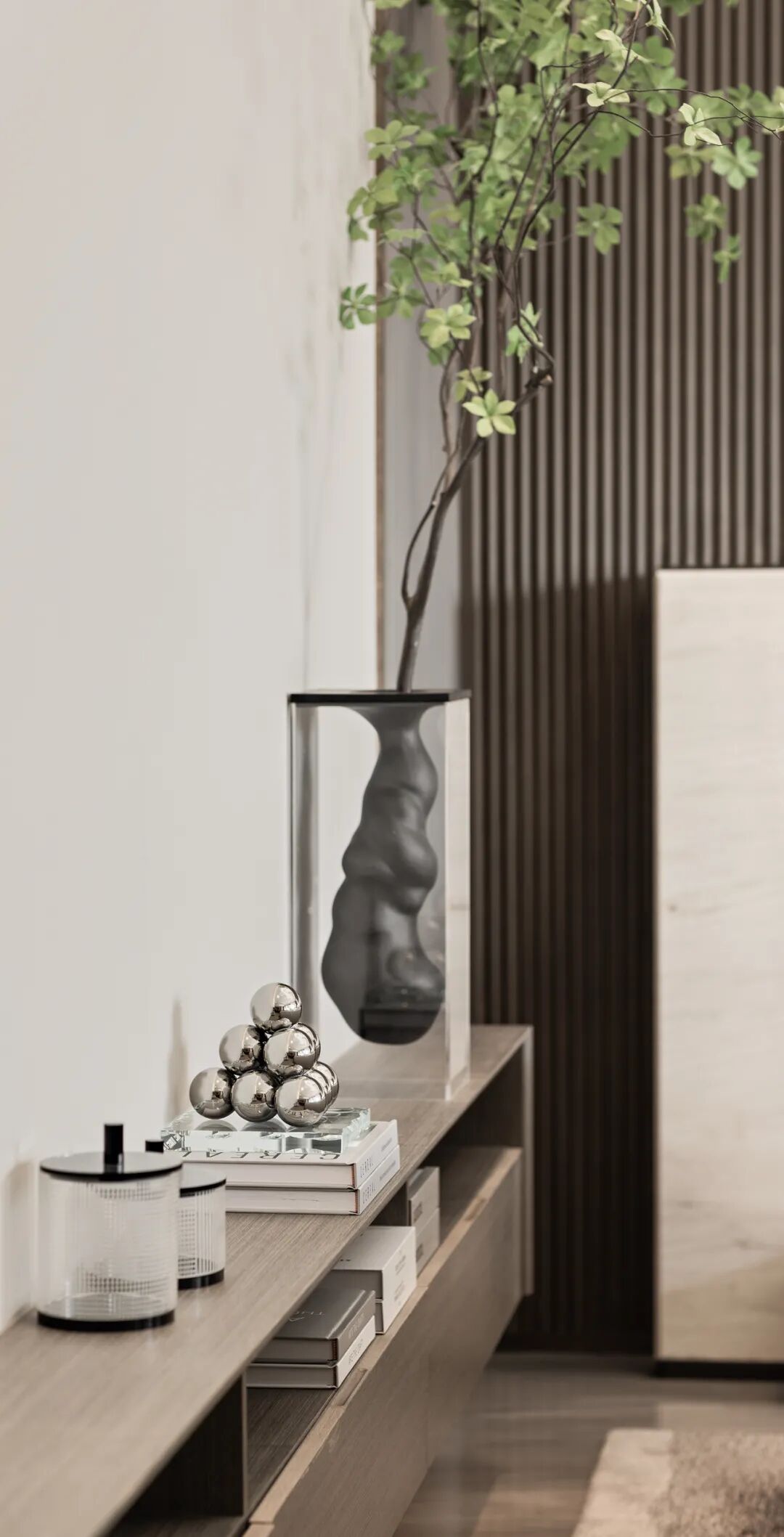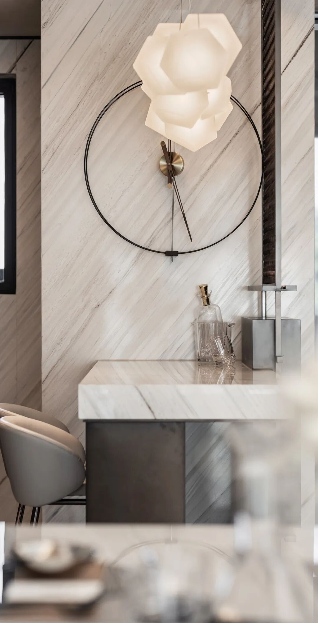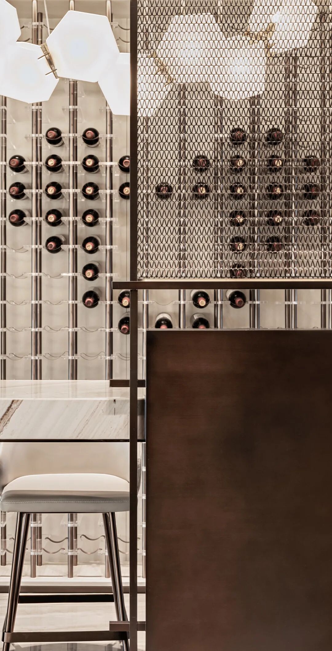 亚克力不锈钢酒架和大理石金属书架,承载着生活的两端情绪。一边是浓烈的酒,一边是宁静的书,居者可在家全沉浸拥有的安静与热烈。