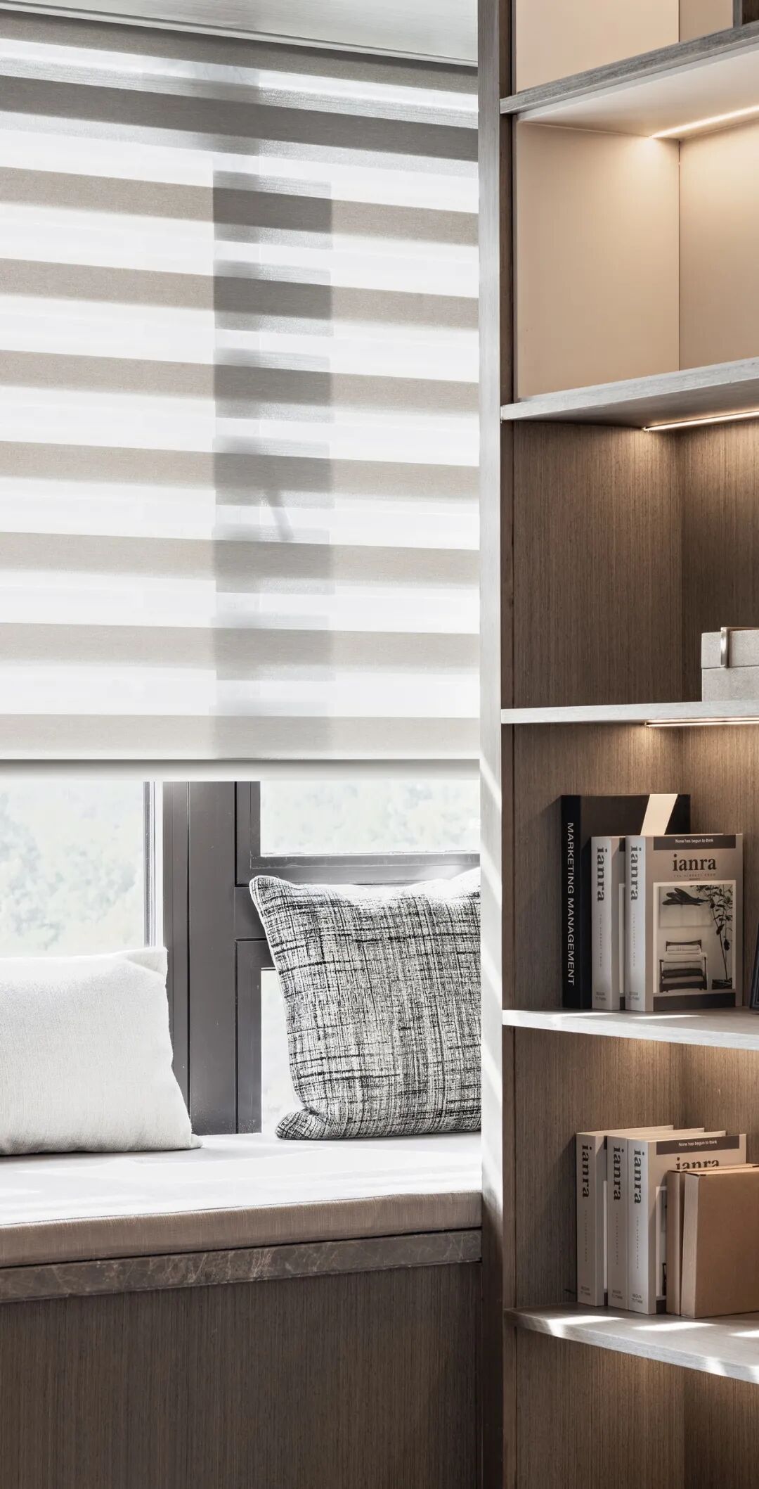软装在半开放设计的书房里启用香格里拉窗帘,两种不同材质的开合方式诠释空间的氛围对比,一侧透亮莹润,一侧影动斑驳。明亮的精神国度中细嗅蔷薇,让灵魂的世界更大更远。