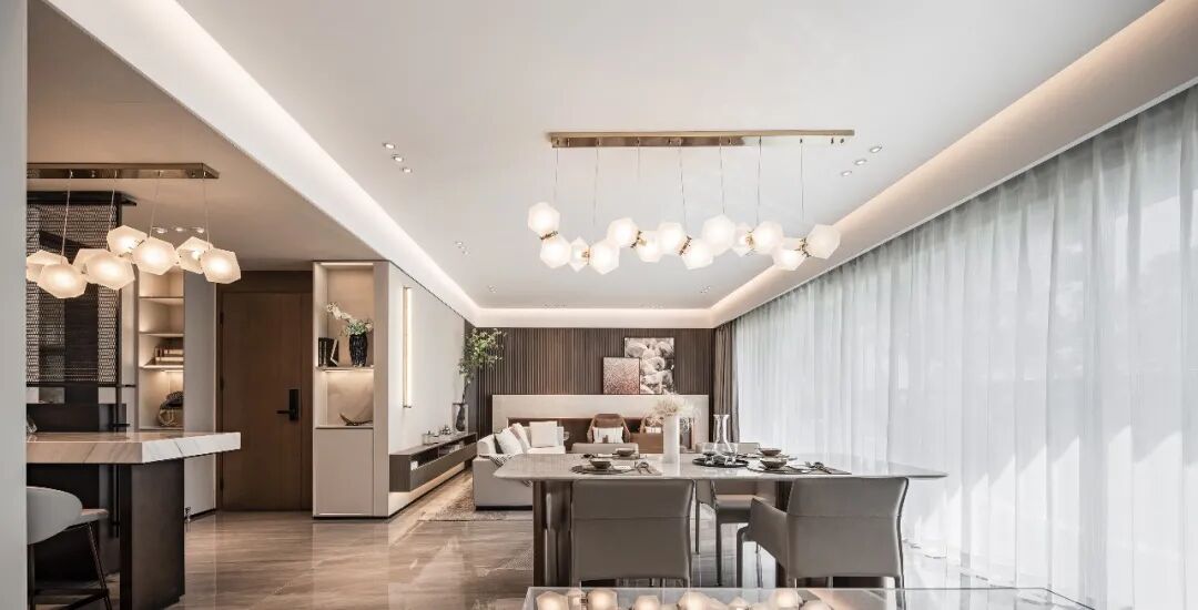 日光携清风吹起轻盈亮白的帘纱,艺术的审美与家居质感细节勾勒起温暖生活的回忆与联想。视线的归处是浪漫的故事感,或许是冬日里的一次围炉夜谈,或许是作家望着灯案出神。长沙发面向湖景阳台,给予与厅同宽的视觉阔度,洁白明亮,落定心上的宁静。