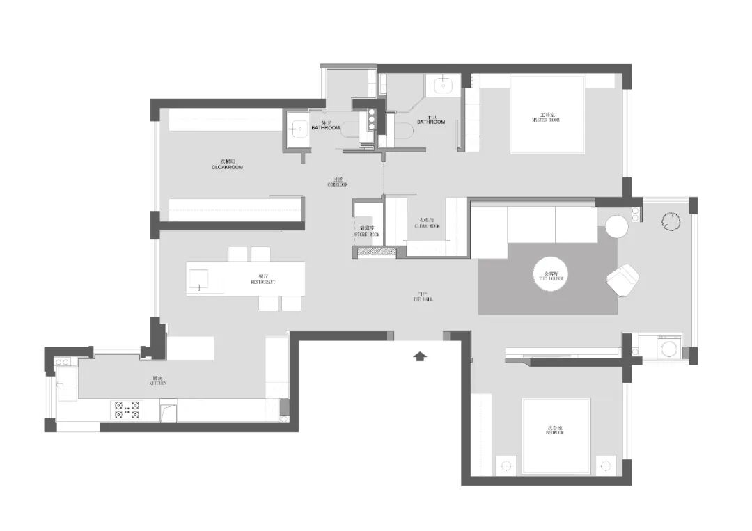 弱化空间的功能分区,打破常规,形成更多功能的使用模式,将餐桌与水池吧台相结合,形成更合理简单的餐厨动线。