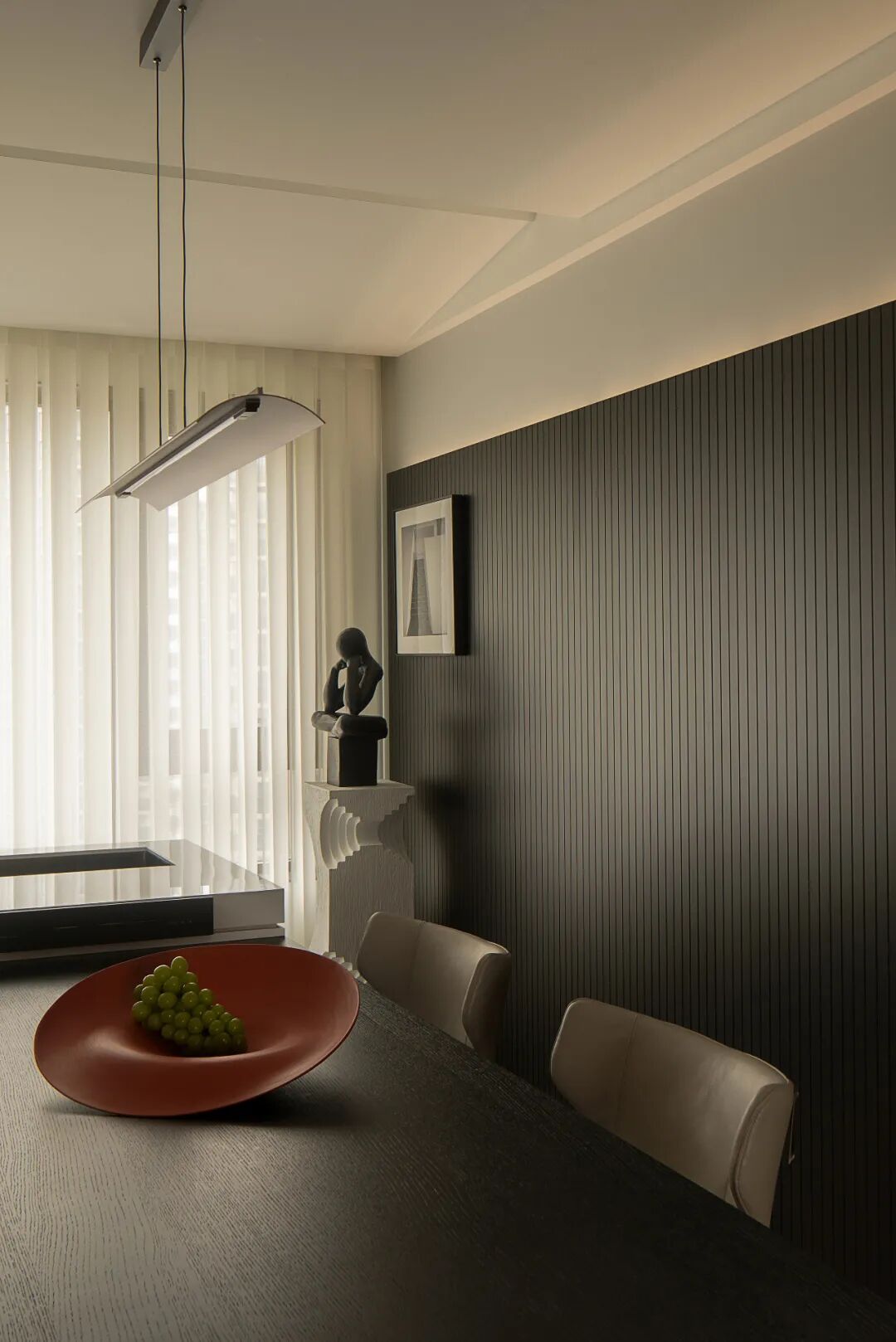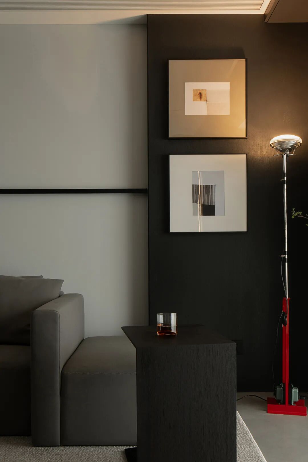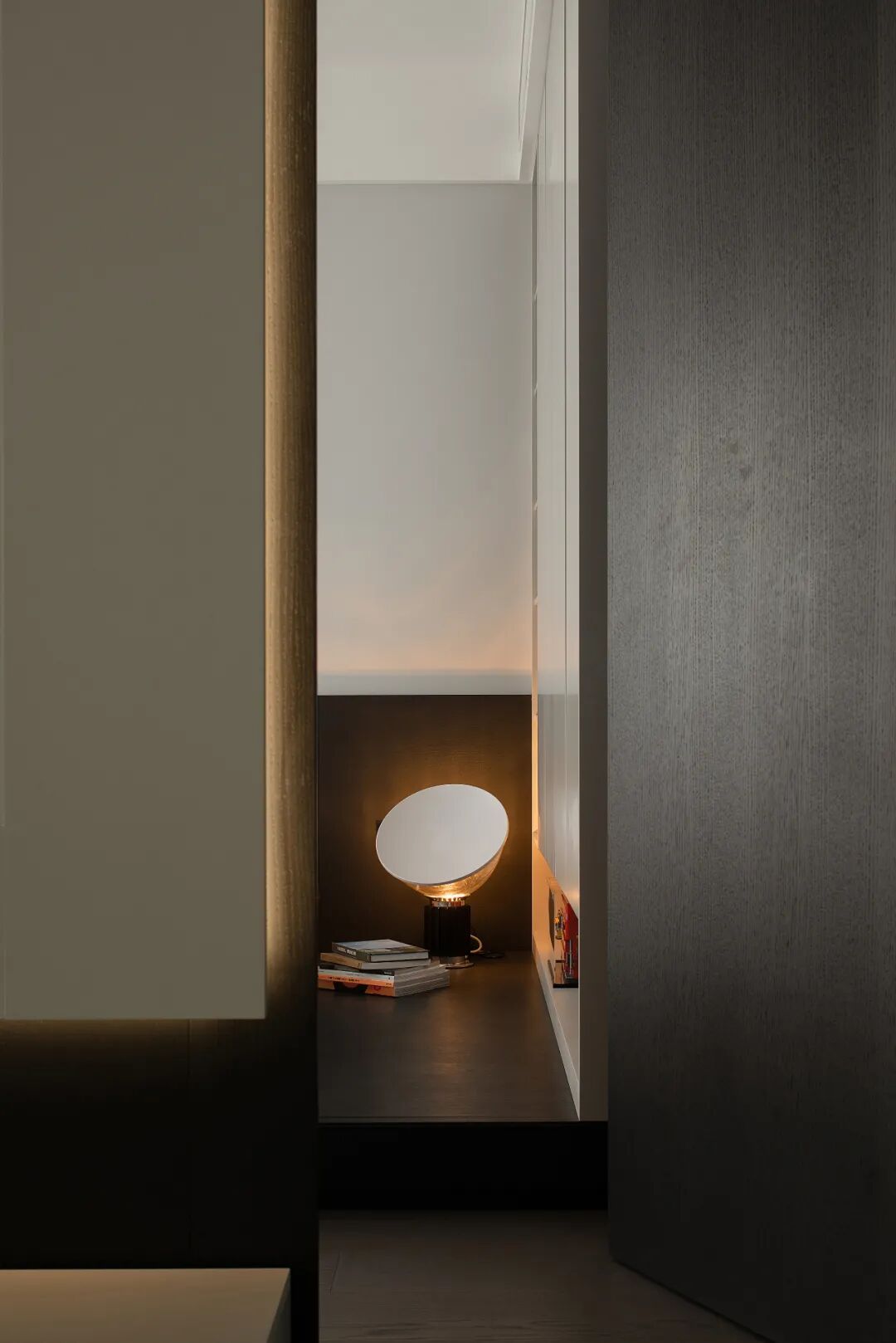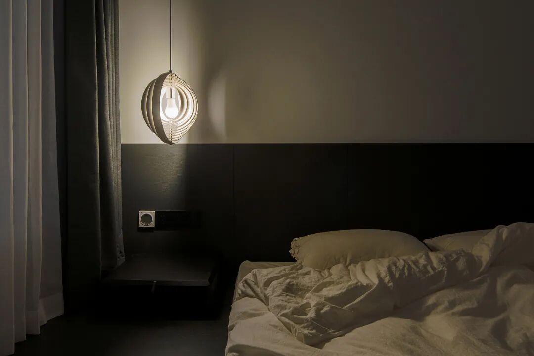 浅灰的地面到黑色木饰面,再往上到纯白的吊顶,三色过渡简单自然,彼此映衬,就像是本案的主题——昼夜一样,在无数个昼夜中,循环交替往复,最后组成家的记忆碎片。