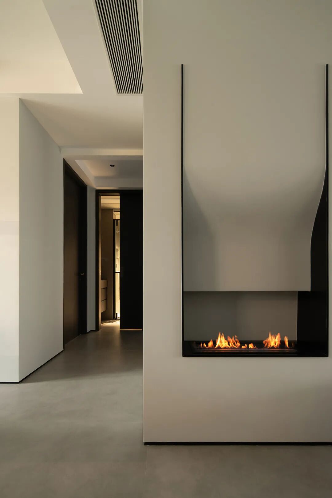 玄关处的焰火,做的非常现代化,用简单的曲线去做造型,在素色的墙面留下一抹温暖的光。