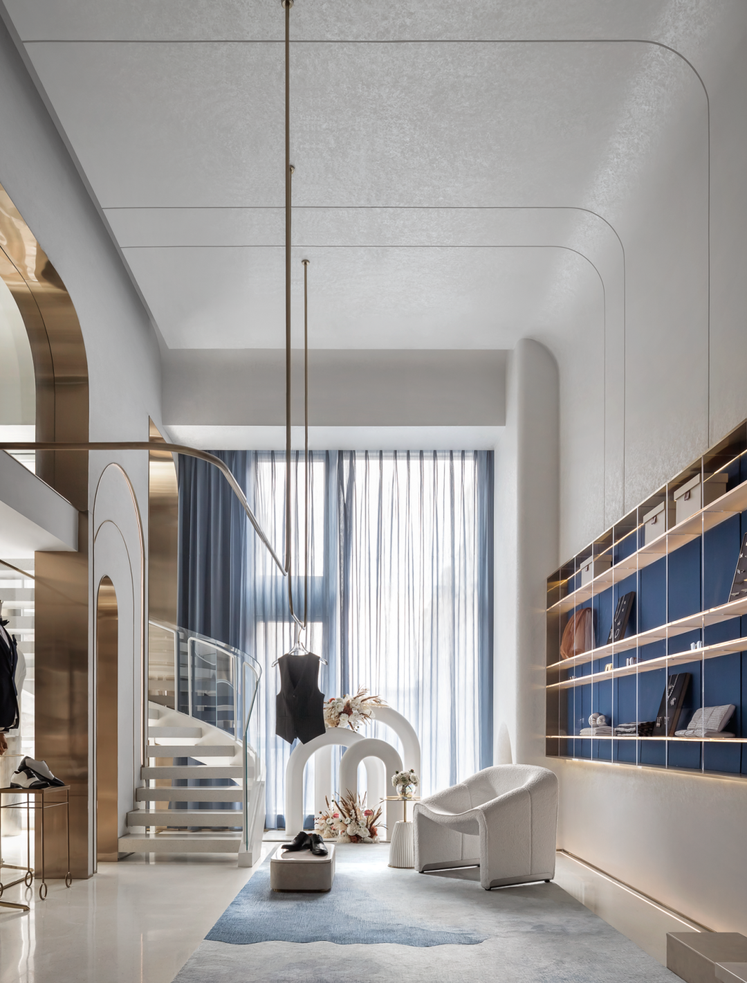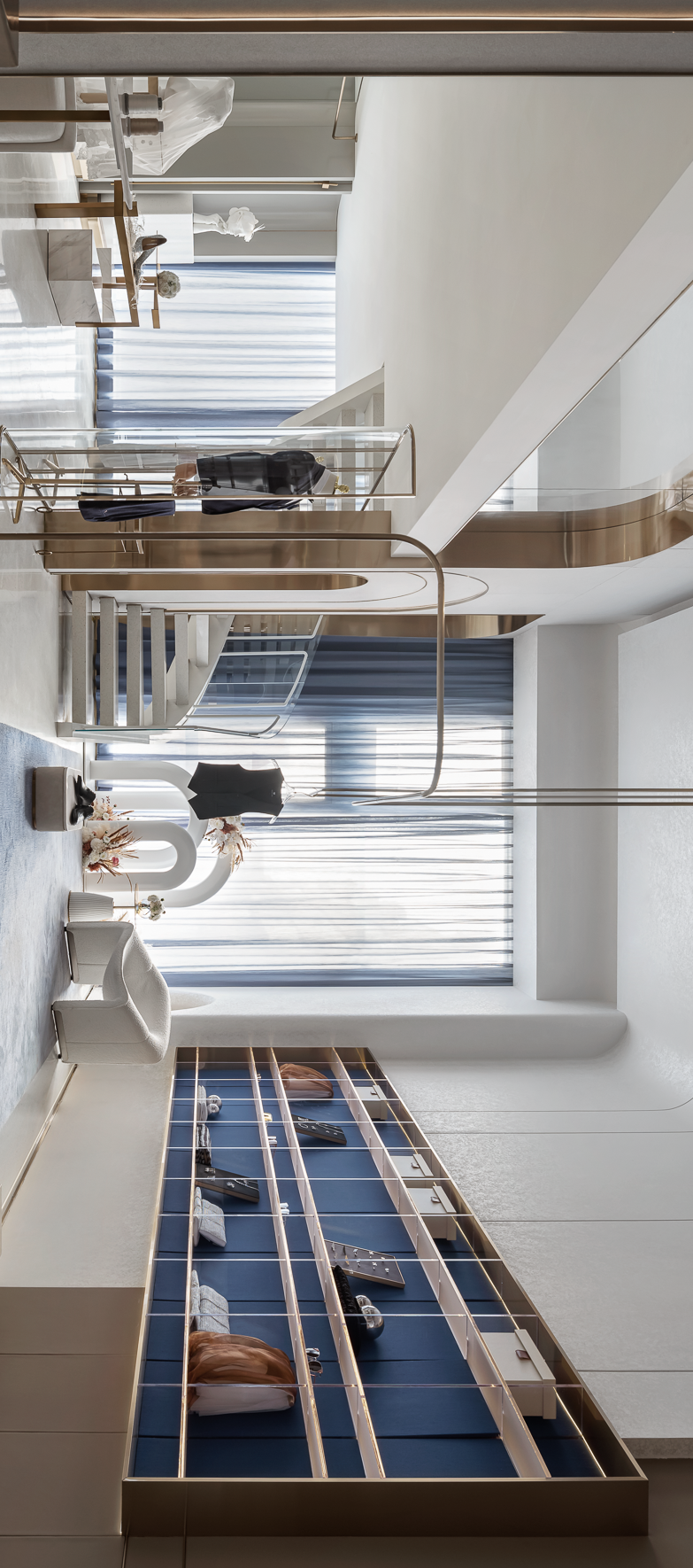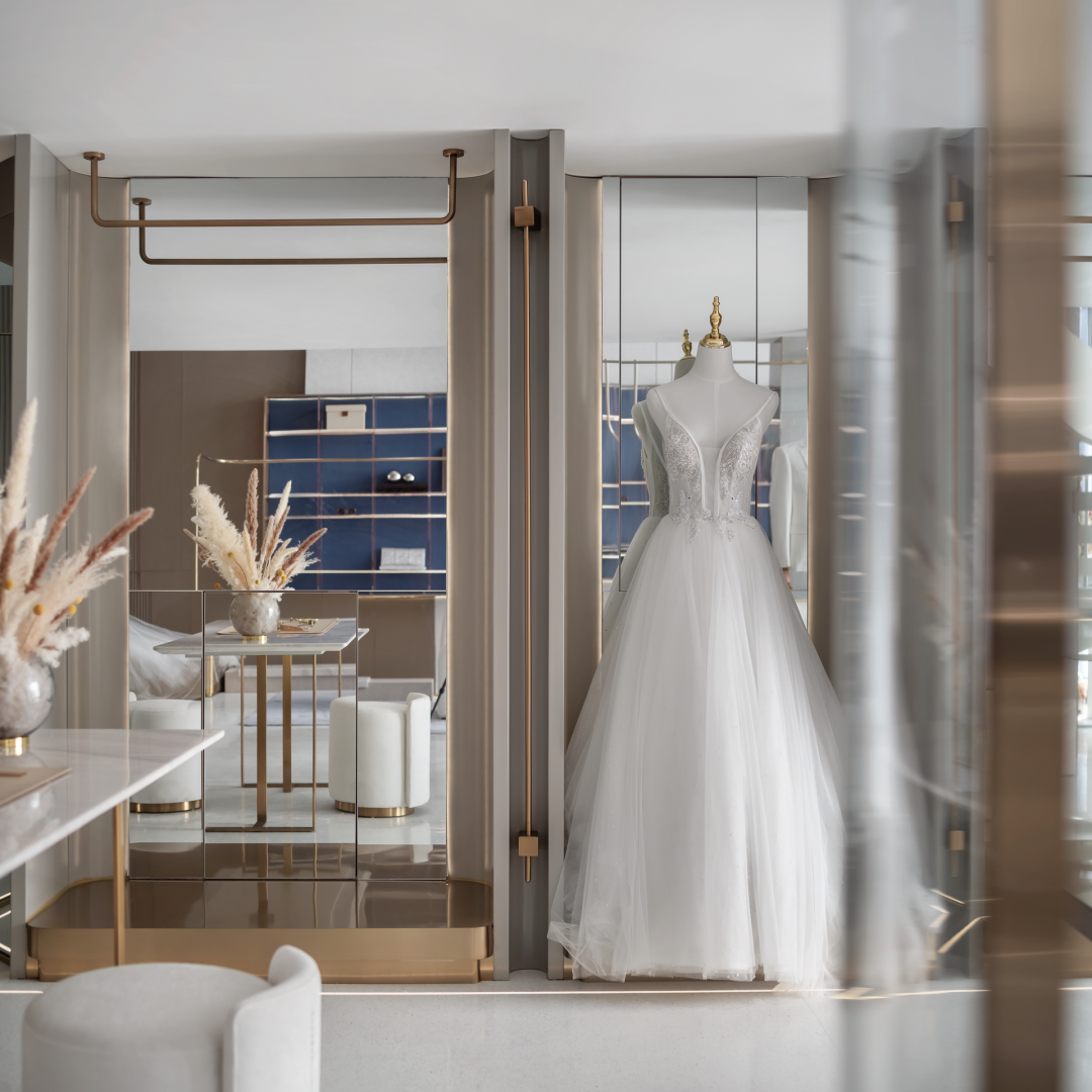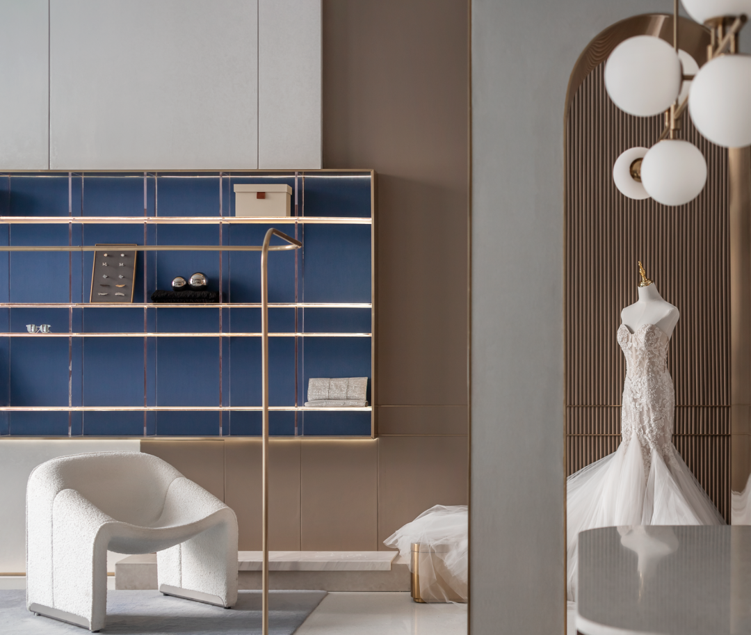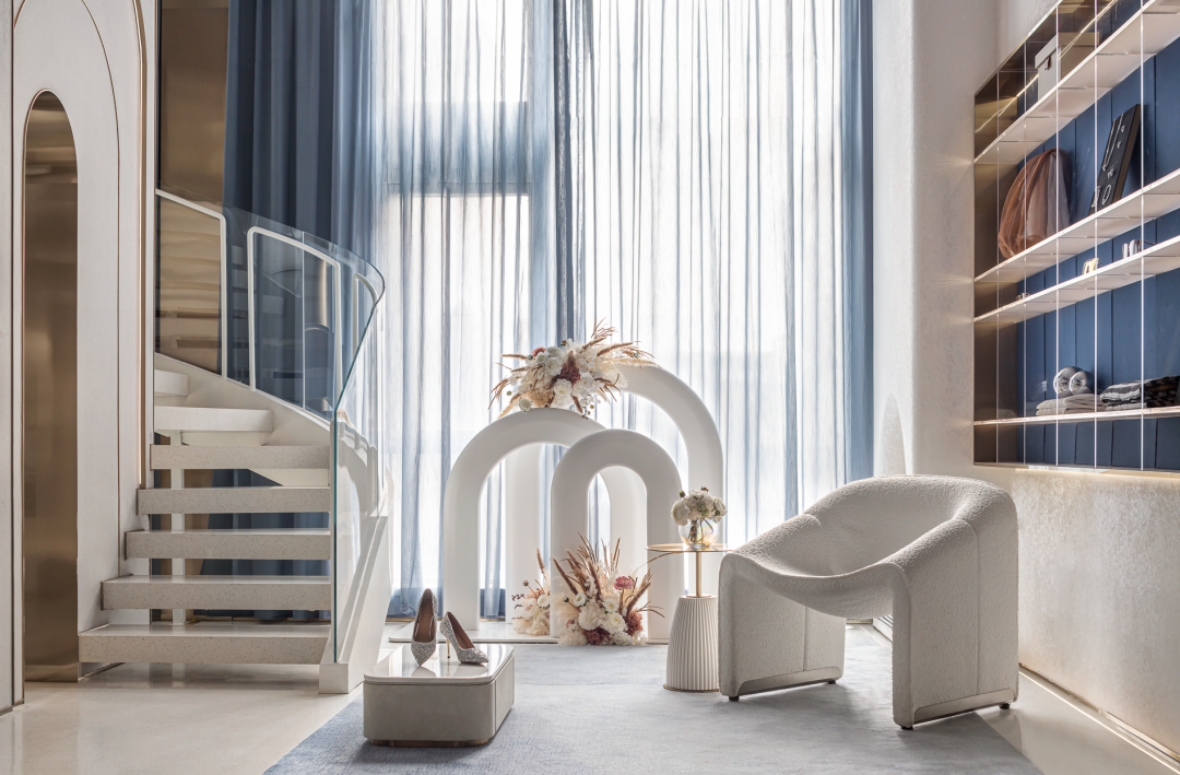本案为一间私人定制服装店,主营婚纱、礼服、配件设计等,项目位于年轻、时尚、多元化的新型商业环境——沈阳大悦城。针对公寓式户型带来的多样可能性,打造年轻活力的新潮经济和经营理念。