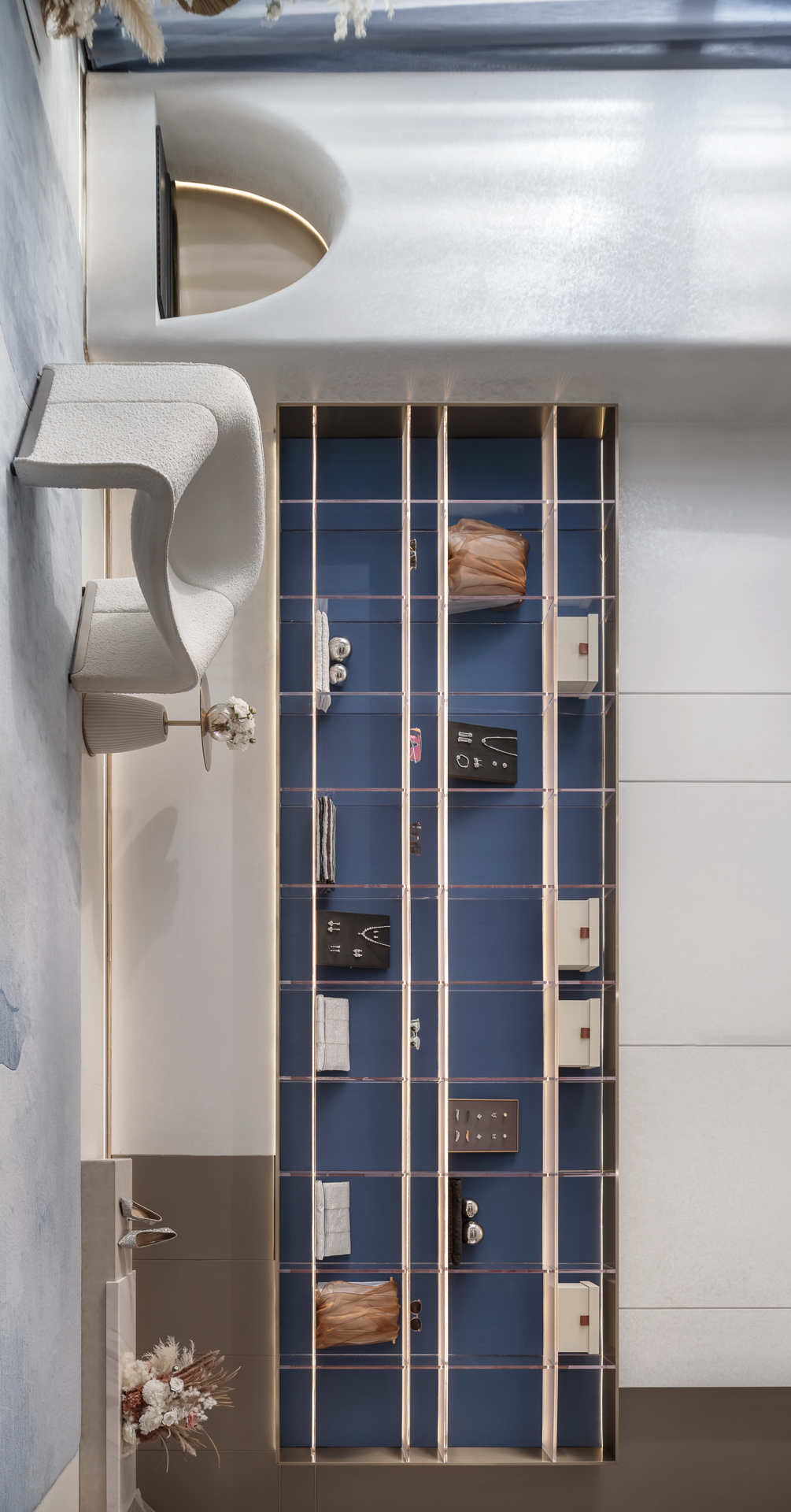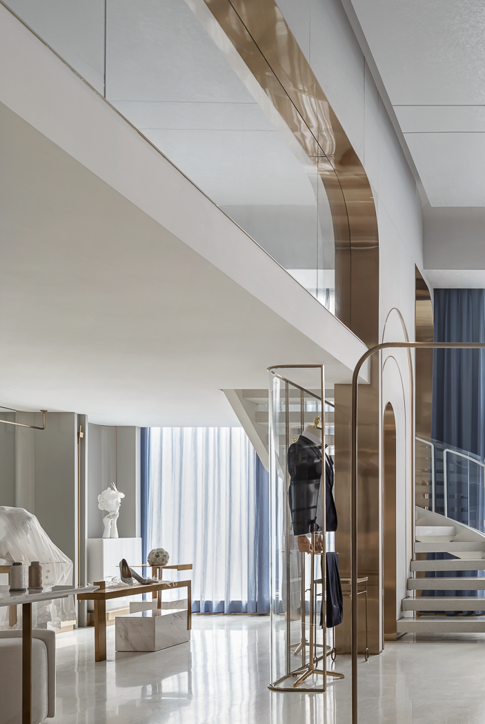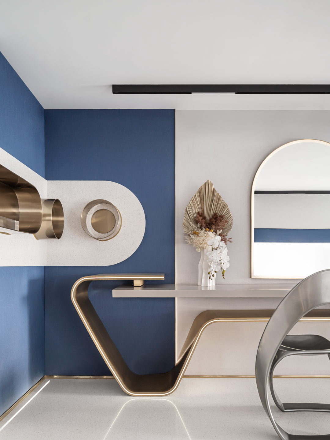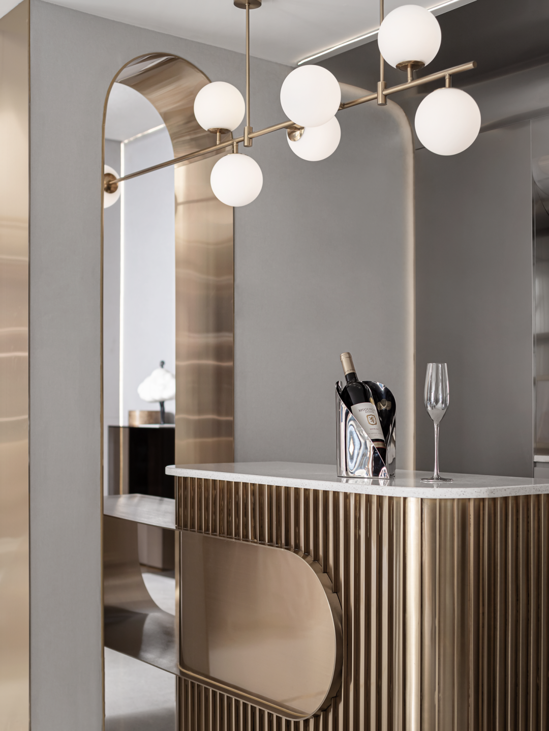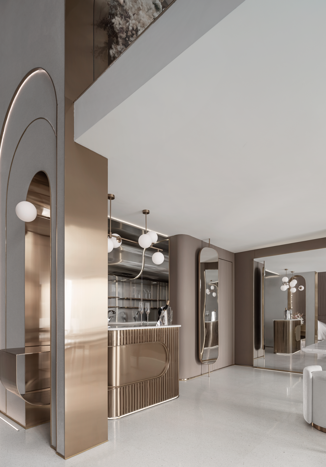 金属的清冷典雅与空间气质的暖调形成对比,设计师通过视觉与感受传达力量。