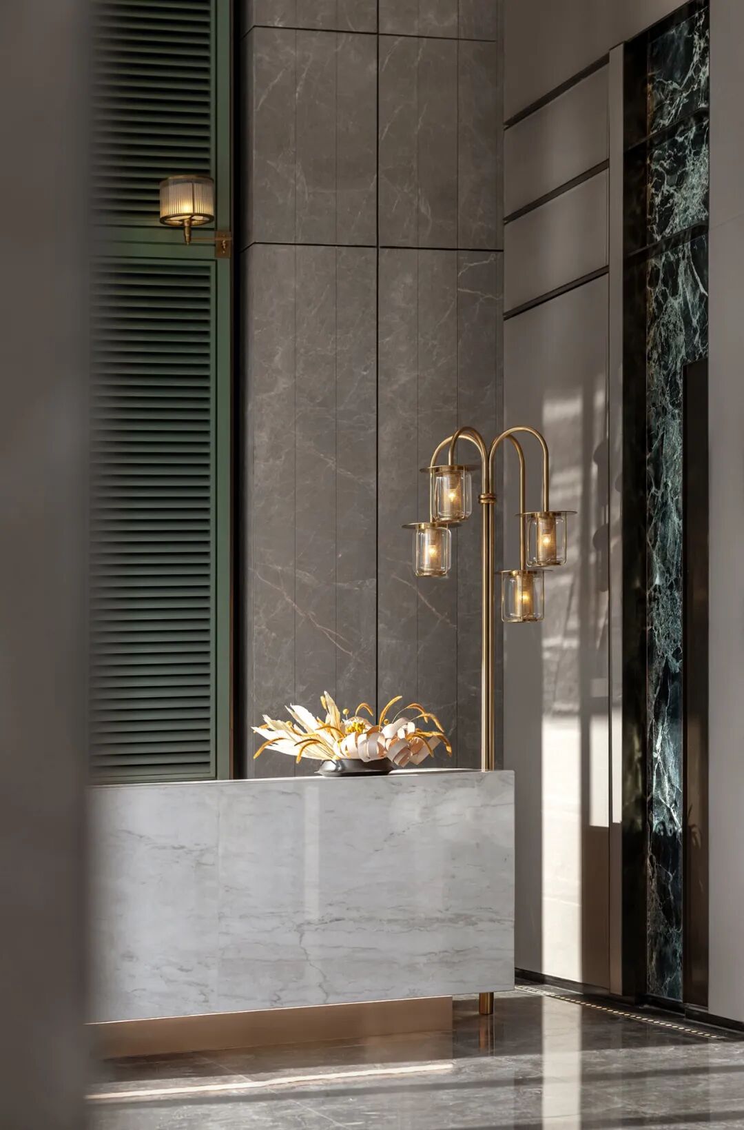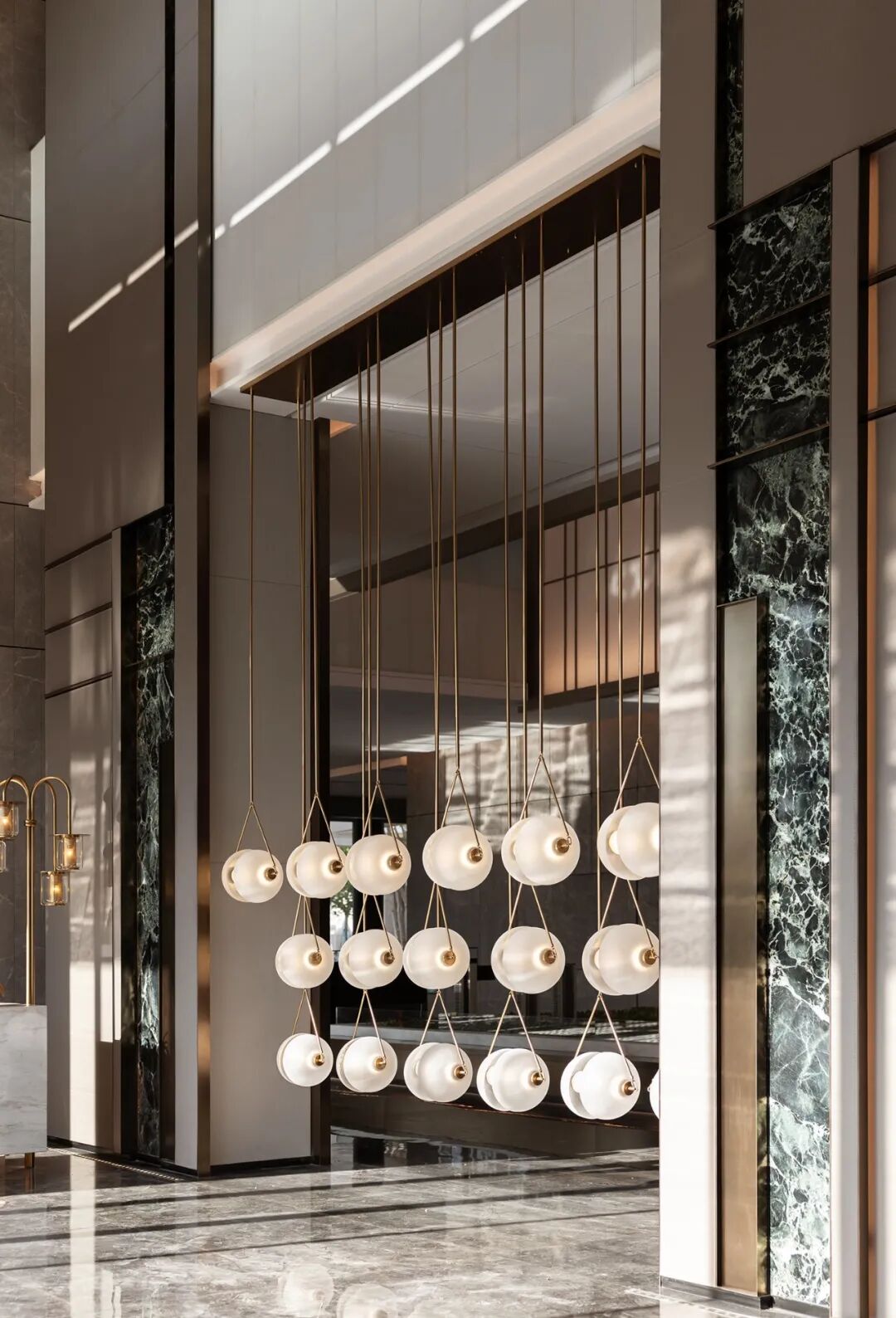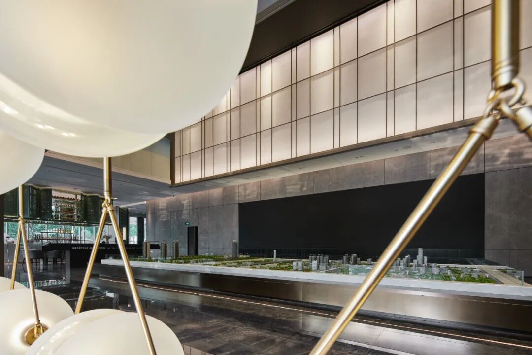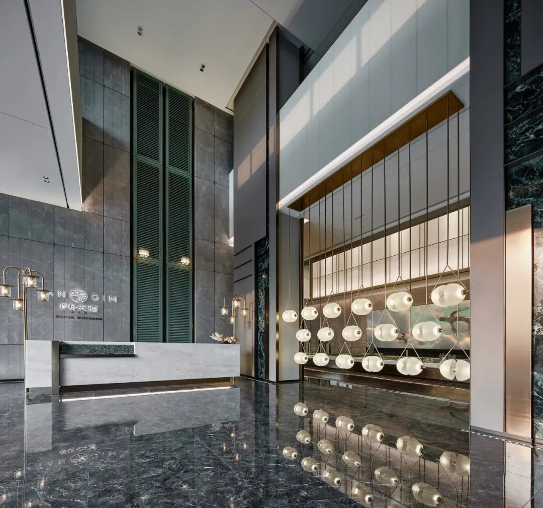 墙柱装饰着墨绿白纹的大理石,呼应项目“天珺”的美玉之意,细节之处体现了优雅质感与低调奢华感。