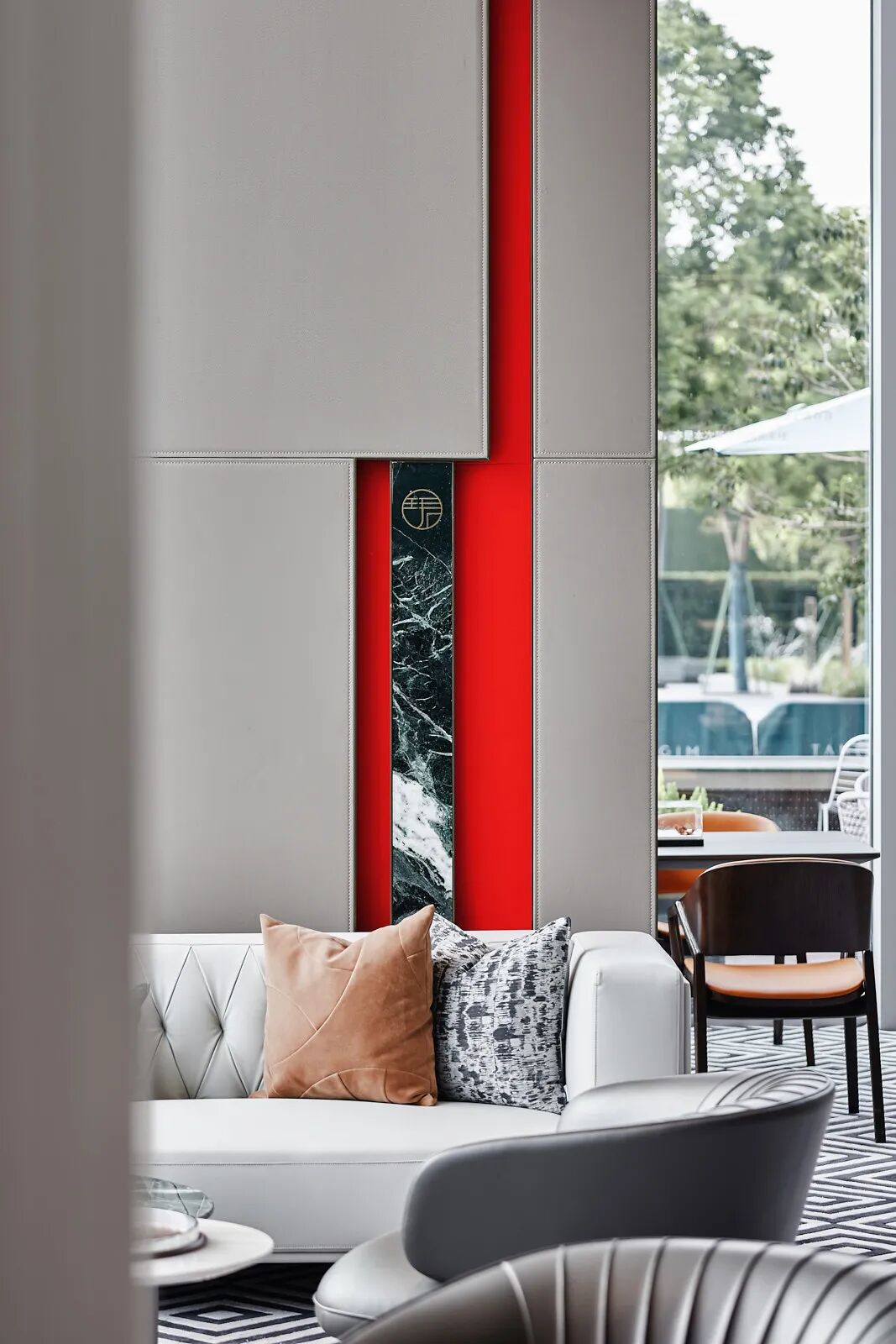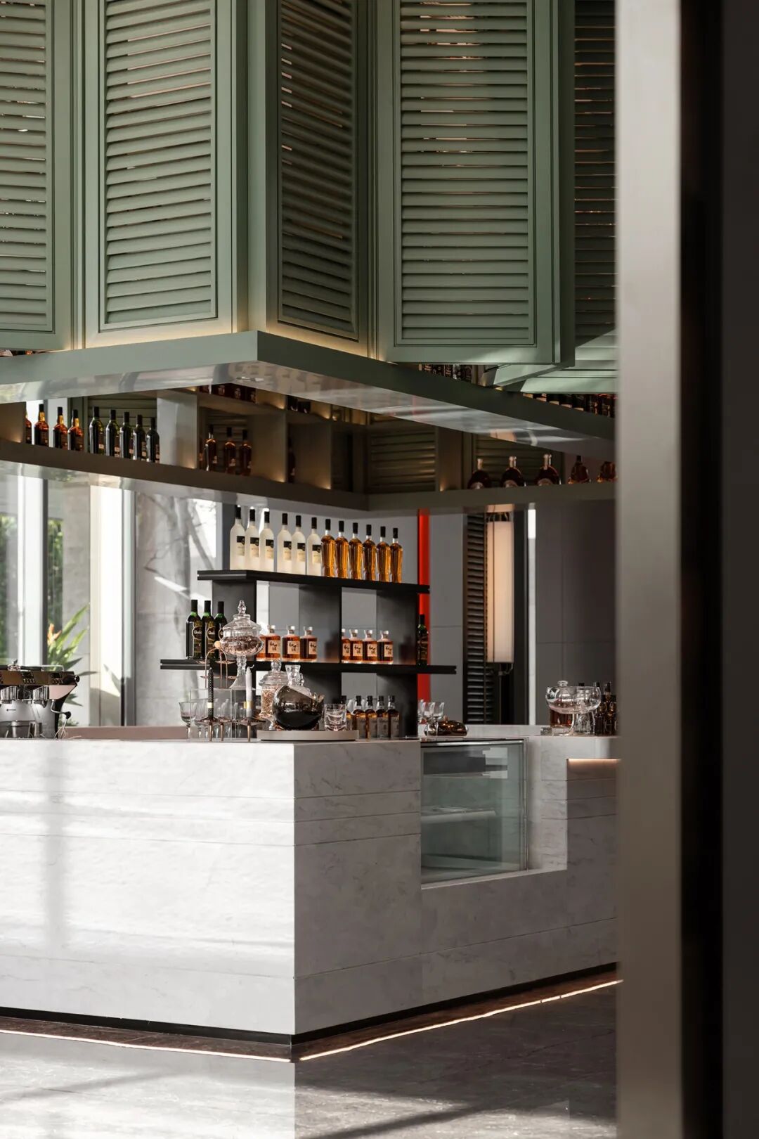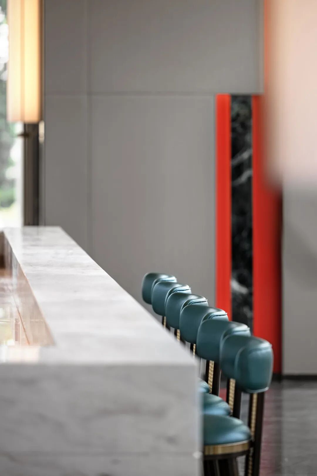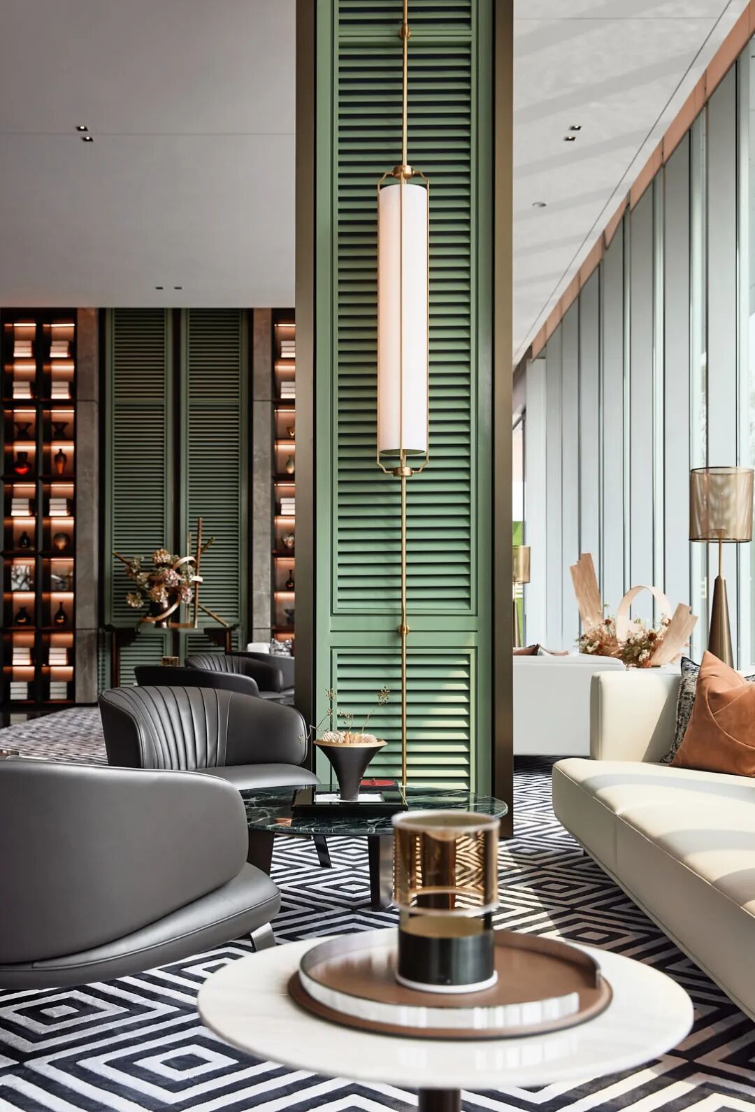 墙柱装饰着墨绿白纹的大理石,呼应项目“天珺”的美玉之意,细节之处体现了优雅质感与低调奢华感。
