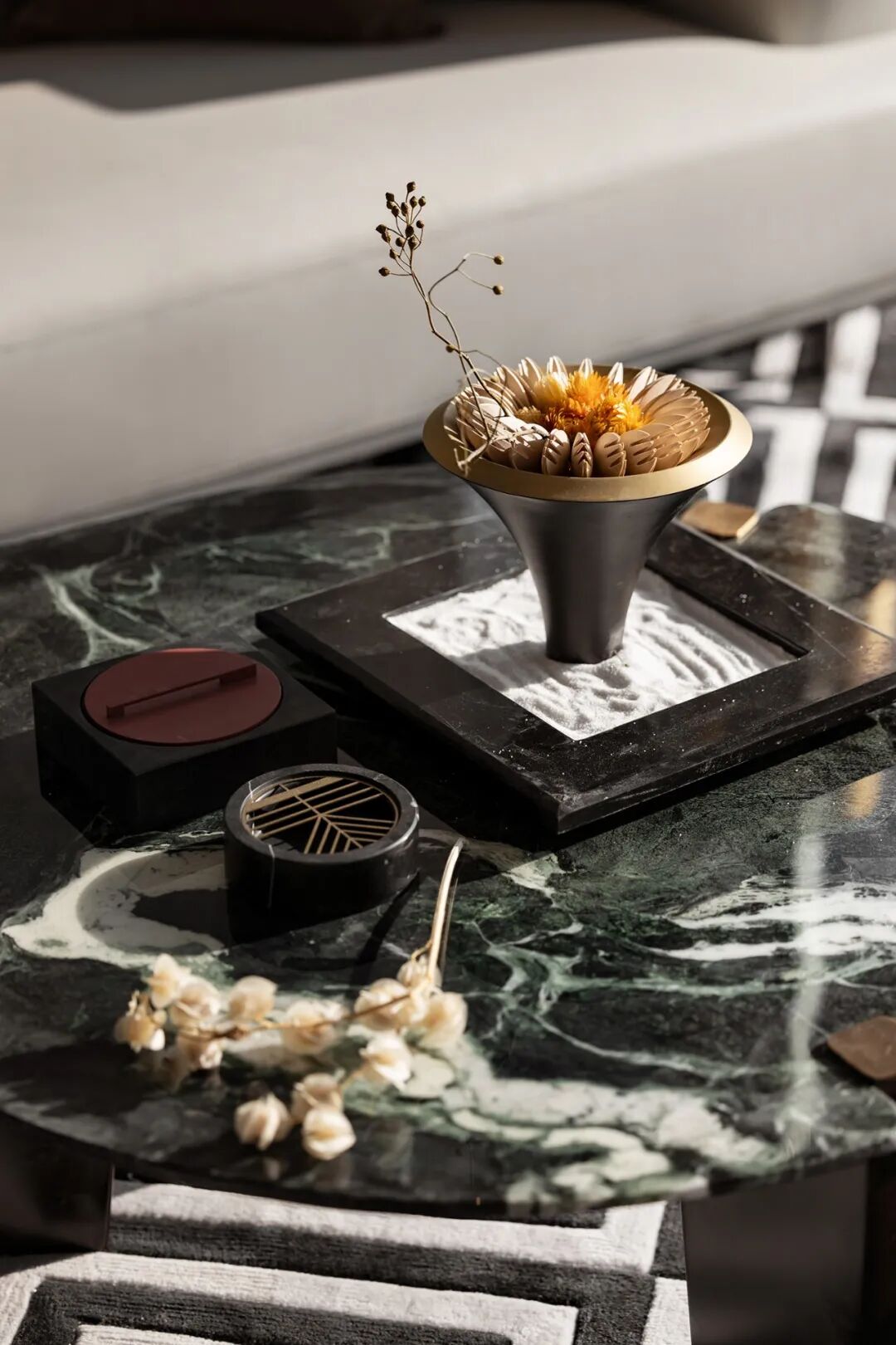 为天珺特邀展出的艺术品散落于各处,赋予空间不期而遇之美,让每一位步入空间的客人都能体会月下闲步湖畔的宁静心境。