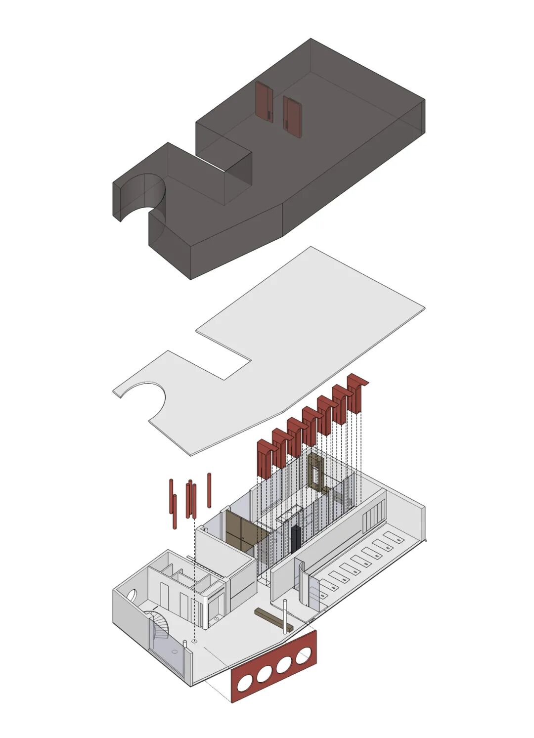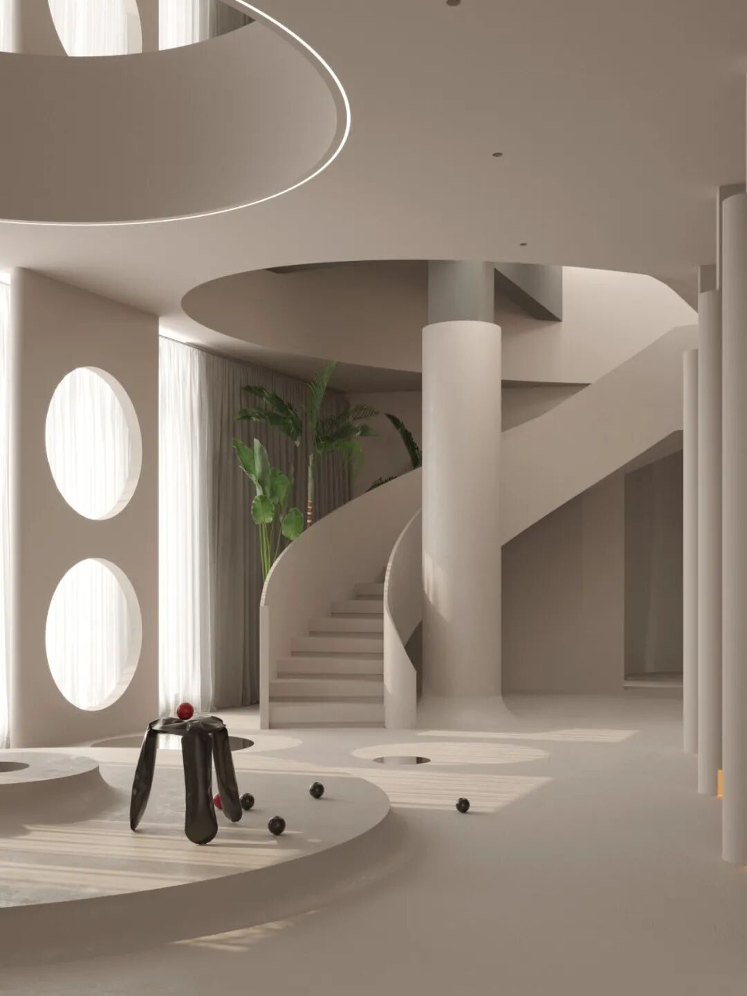 While trying to ensure adequate lighting, the designer emphasize thesense of privacy in the whole space and the visual impact in architecturalsense. As a highlight of the space, the design process of the circularstaircase needs to consider the possibility of integration with the spacewithout occupying too much space, which is also a major difficulty in thedesign.