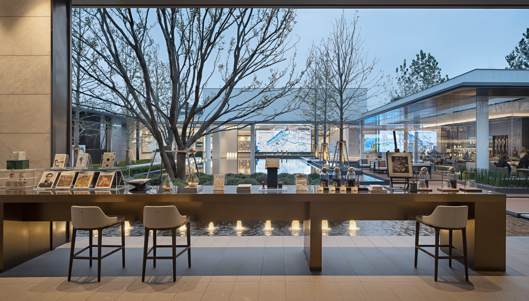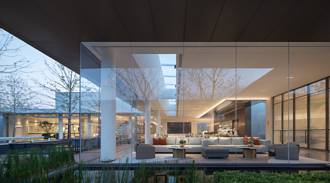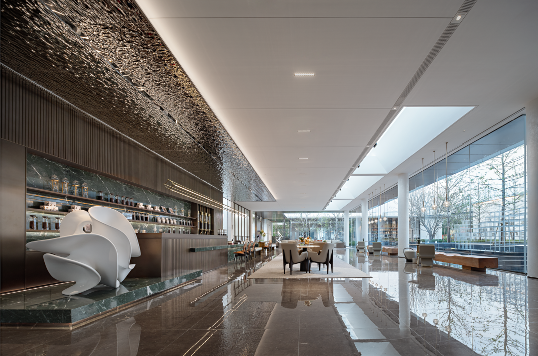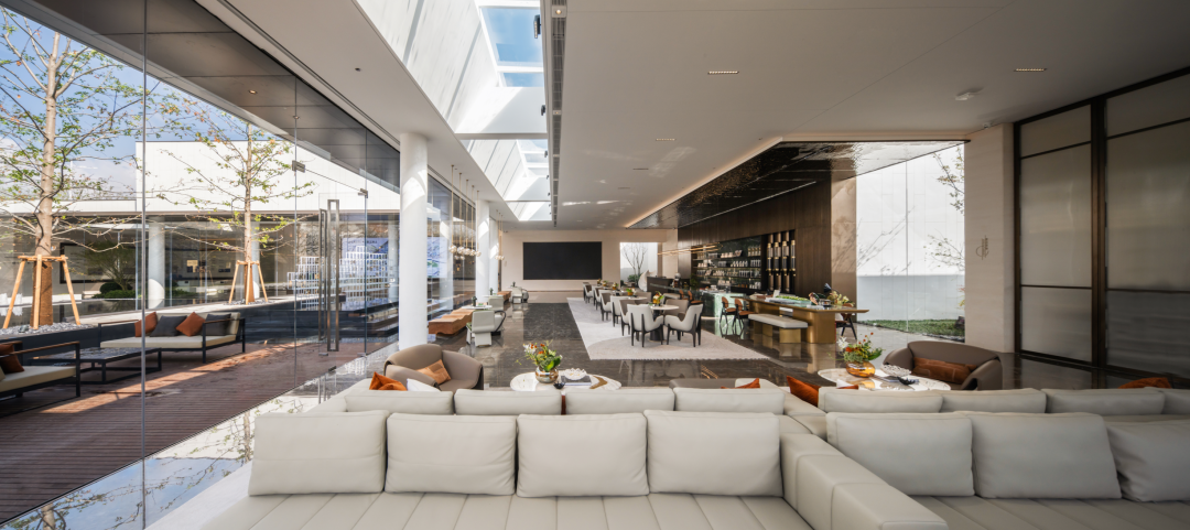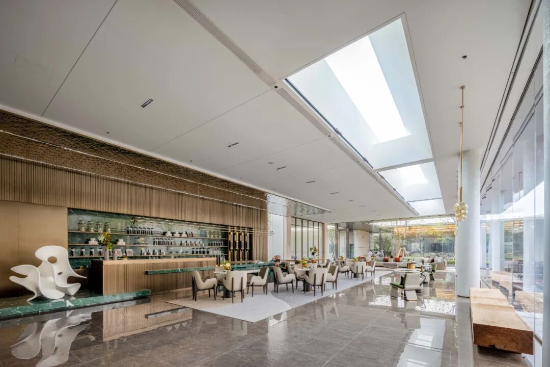 水景一侧,整面可以开合的玻璃门,消除了物理墙体、窗面严格的边界限制,人们在此交换感知。