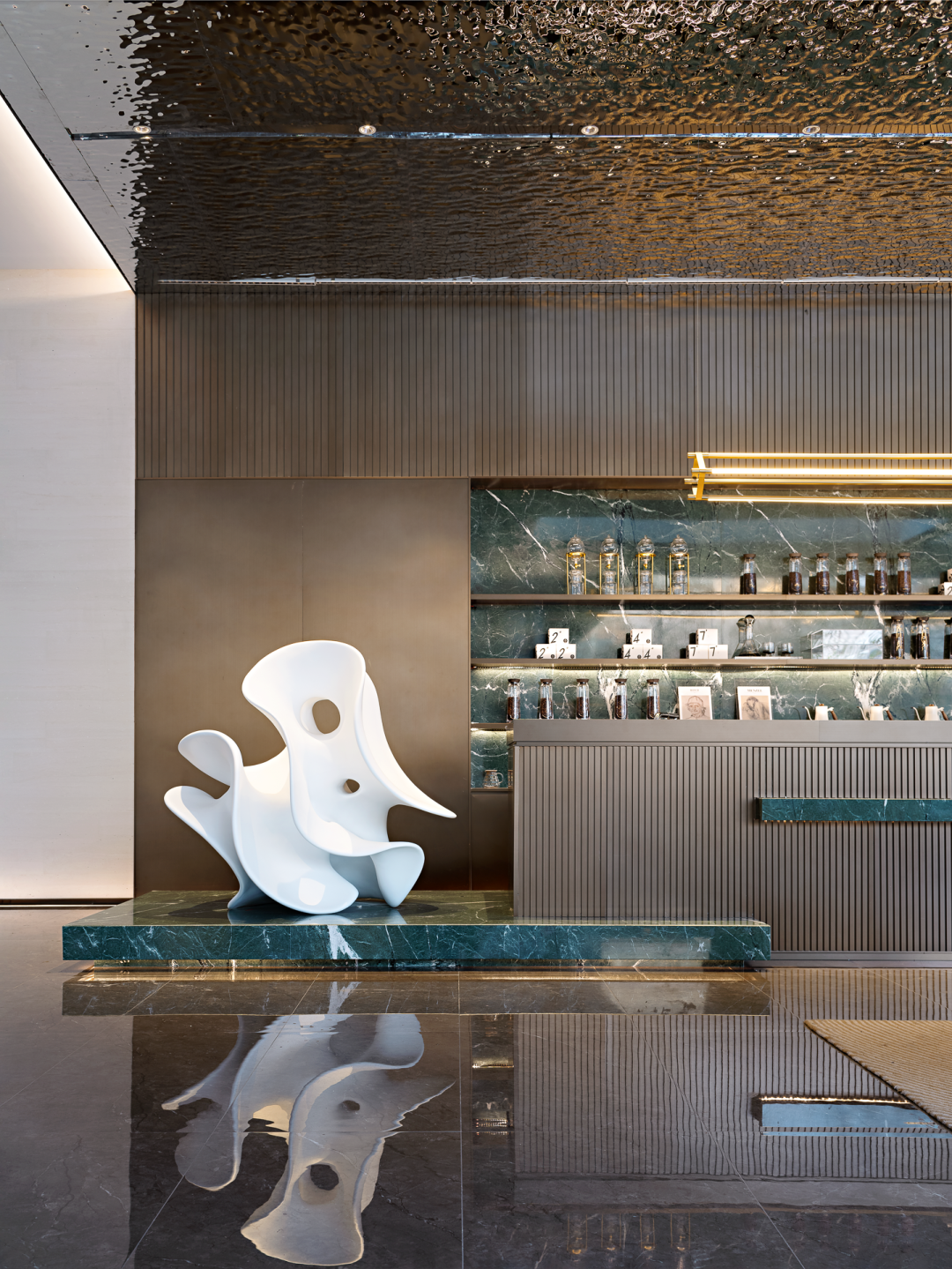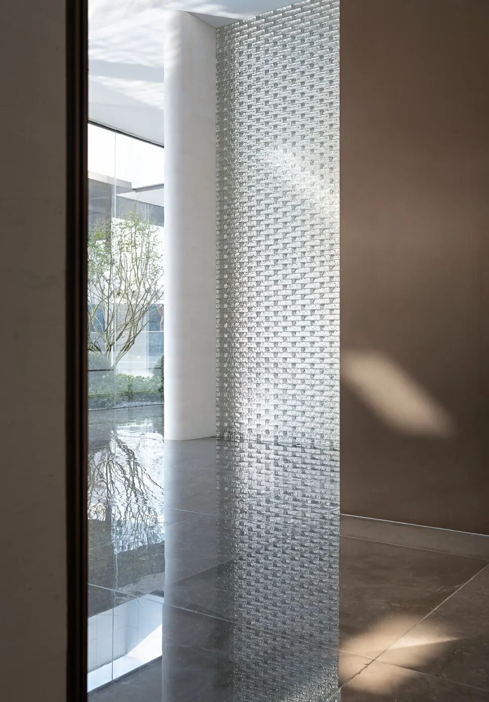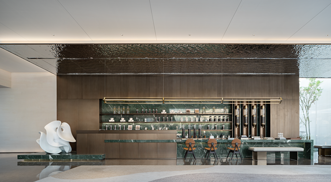 通透而自然,宁静而淡雅,由水在自然界中的不同状态与光影的变幻,贯穿整个空间,潺潺流水之间感受来自大自然的力量。
