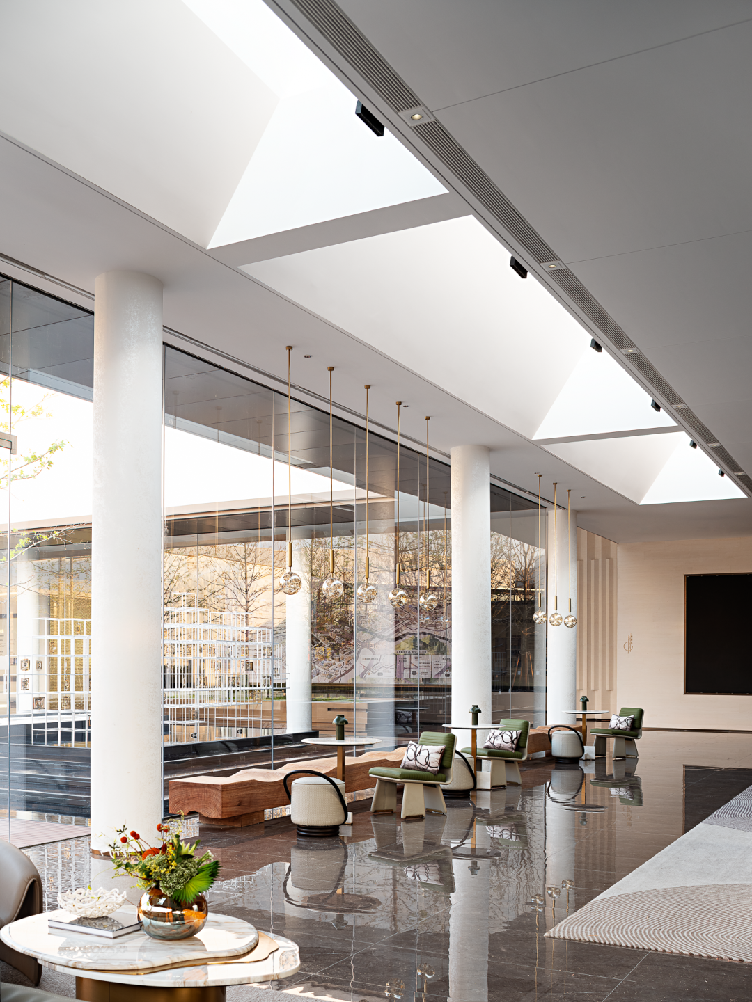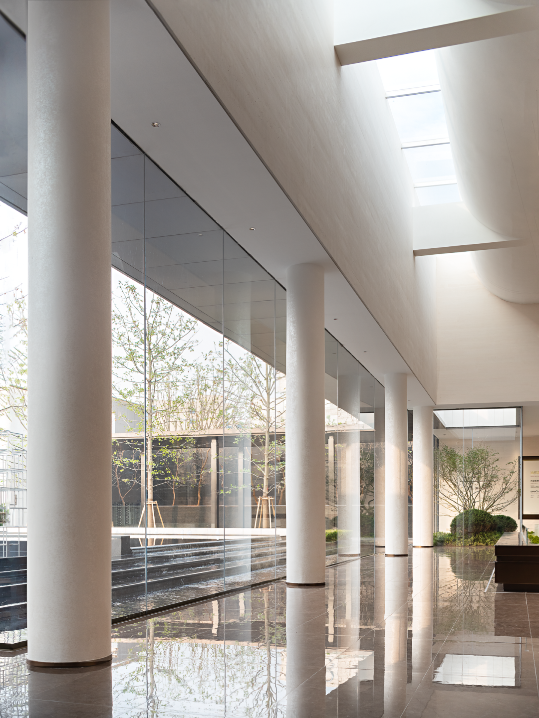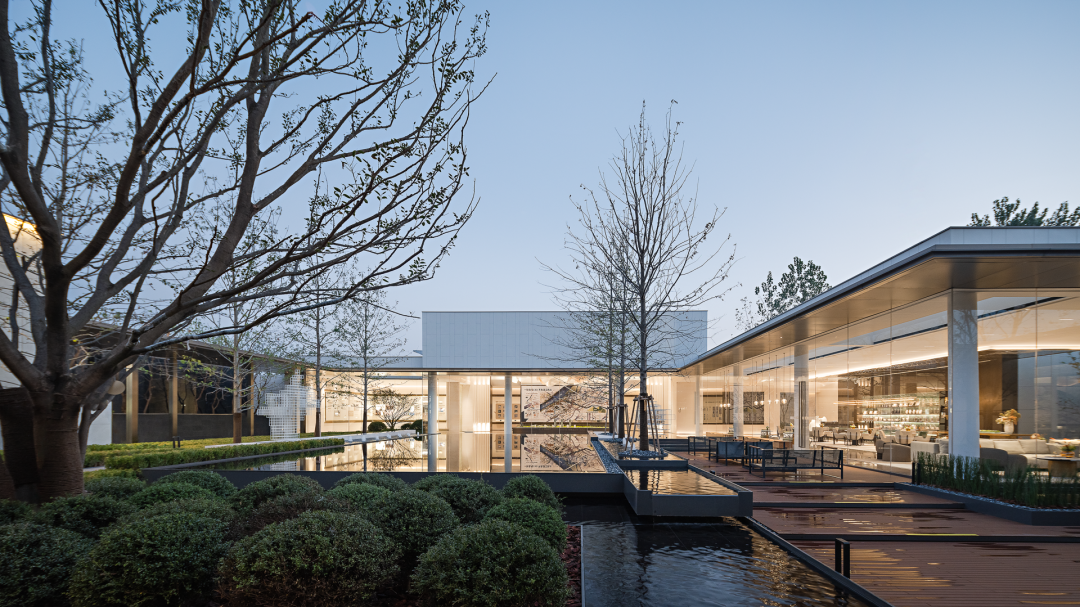 围绕室外景观与水景穿梭一条笔直过廊,浸入式体验划分动静动线,庭院、水院等渐次成形,于室内外之间,景观与室内无界交融