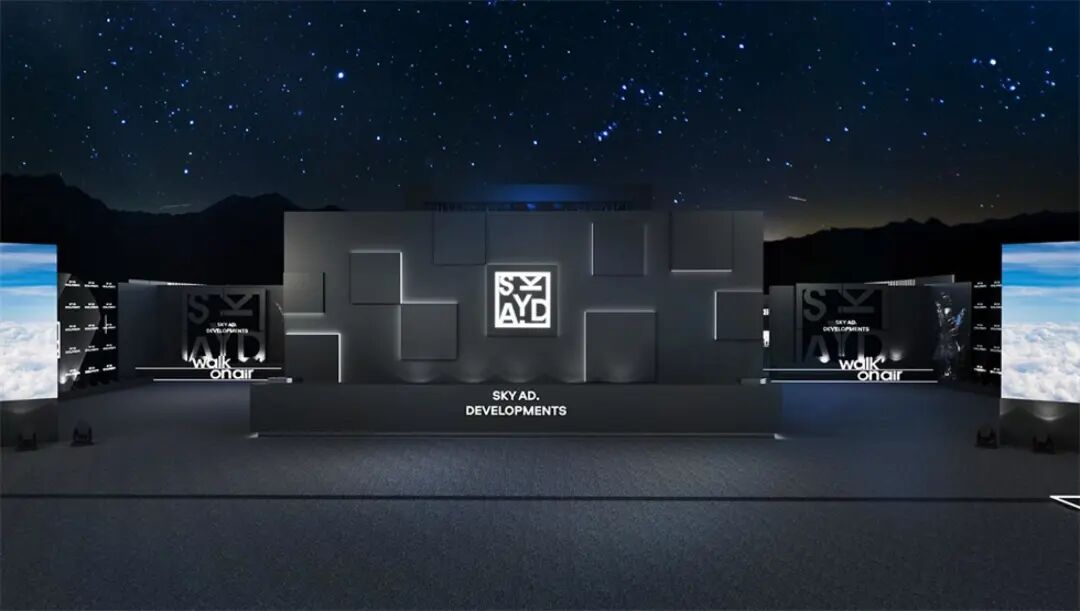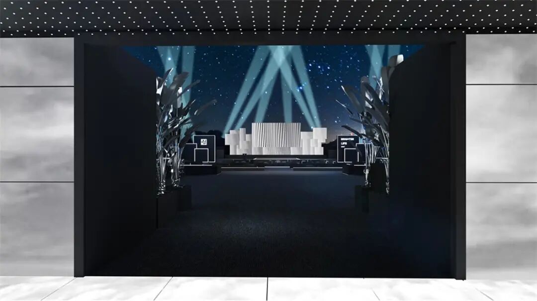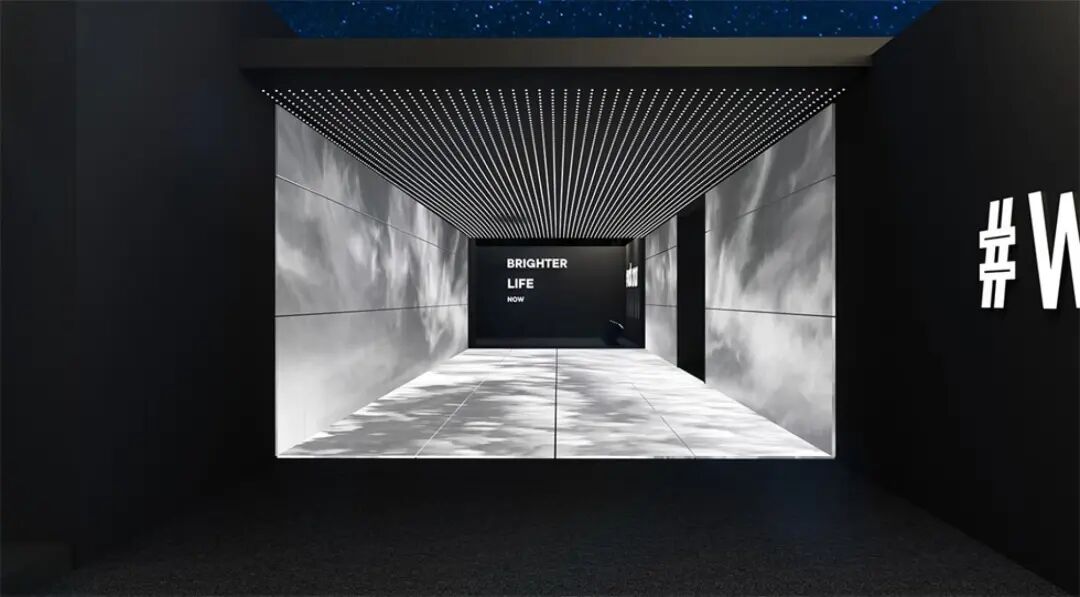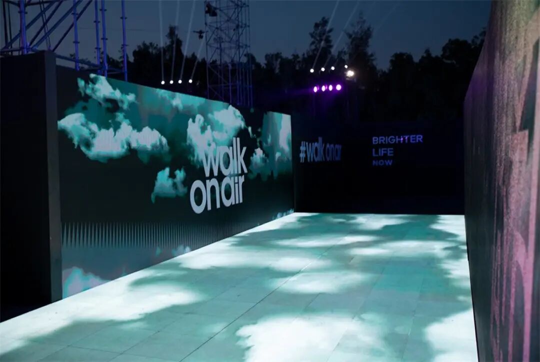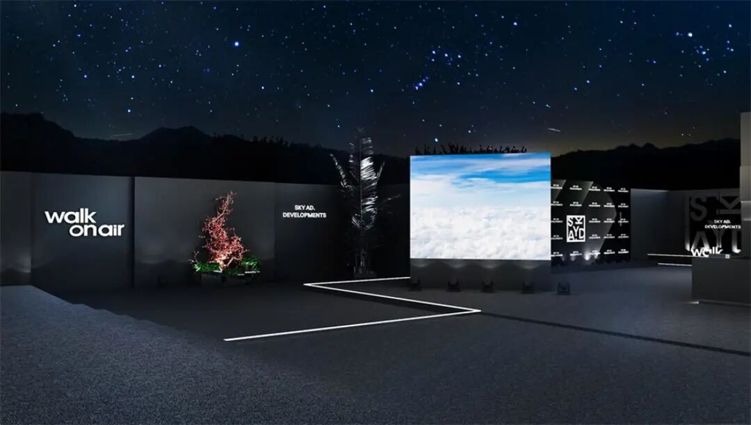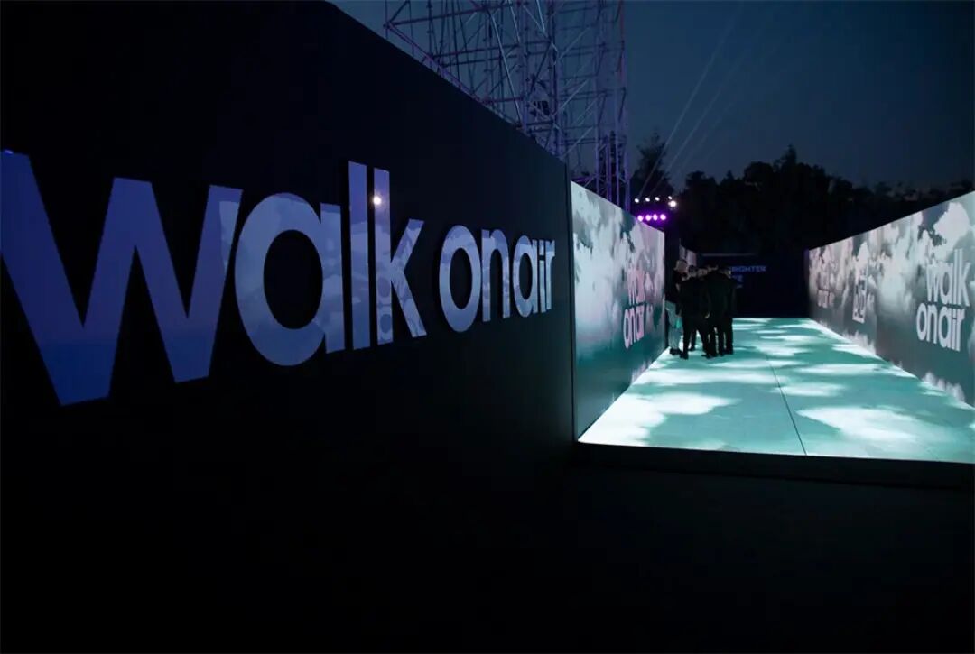 休息等待区与主舞台区之间的通道装置“空中漫步”,由三面的LED屏幕组合而成,屏幕上播放空中的云朵视频,人在其中仿佛漫步在空中。