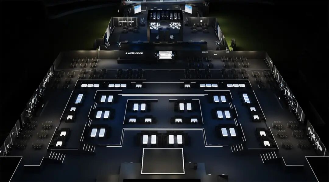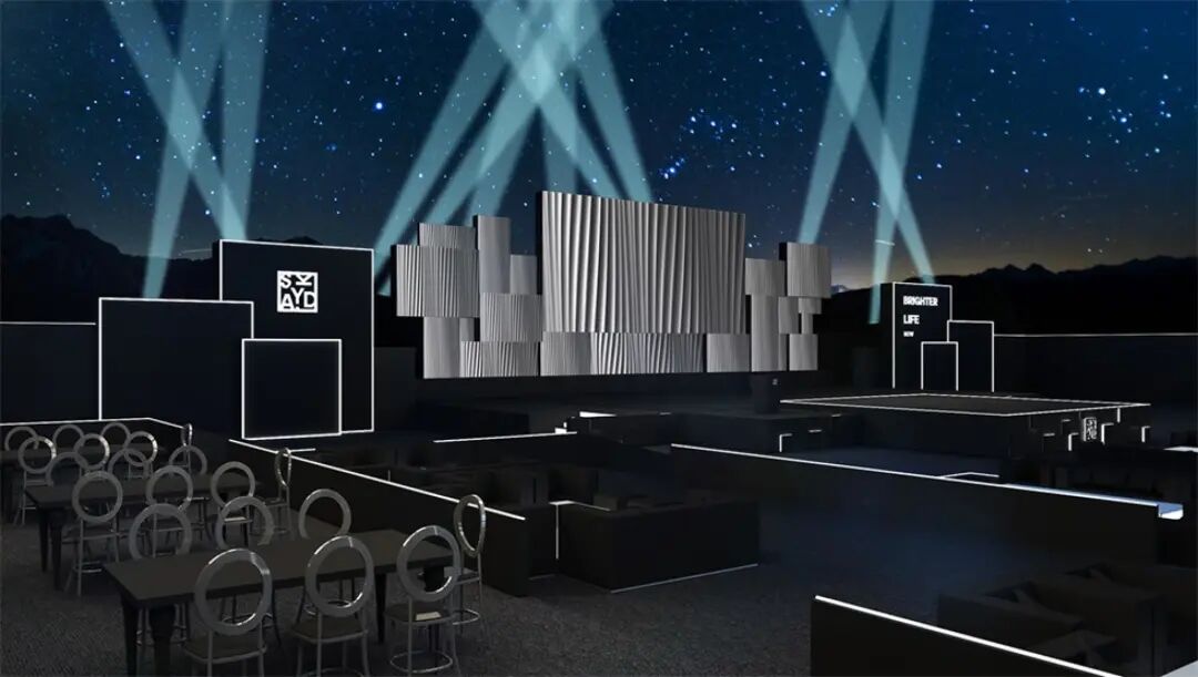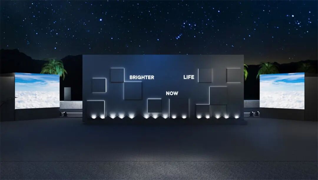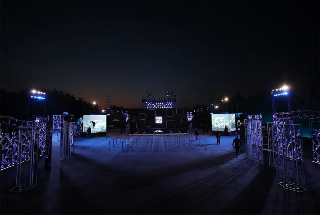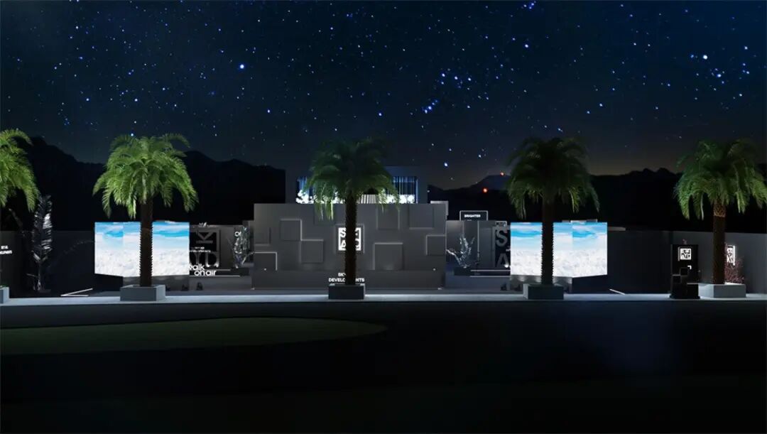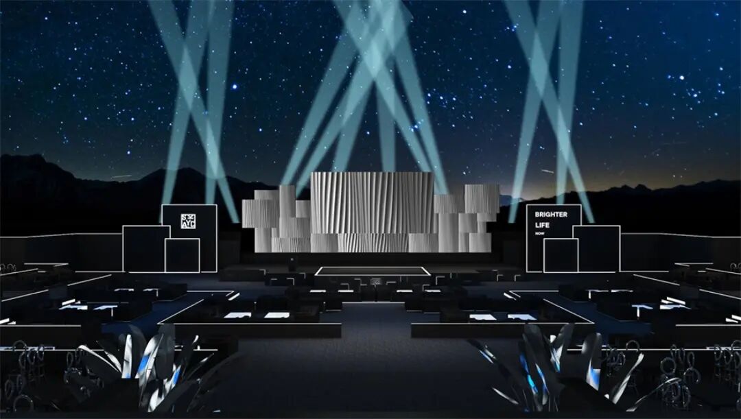 休息等待区与主舞台区之间的通道装置“空中漫步”,由三面的LED屏幕组合而成,屏幕上播放空中的云朵视频,人在其中仿佛漫步在空中。