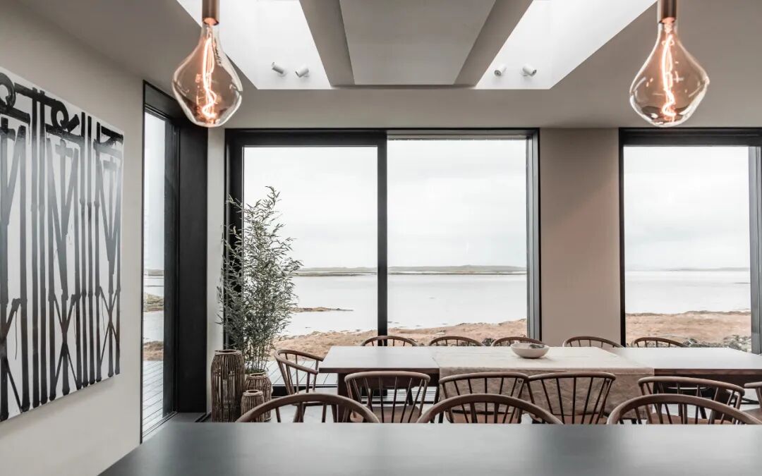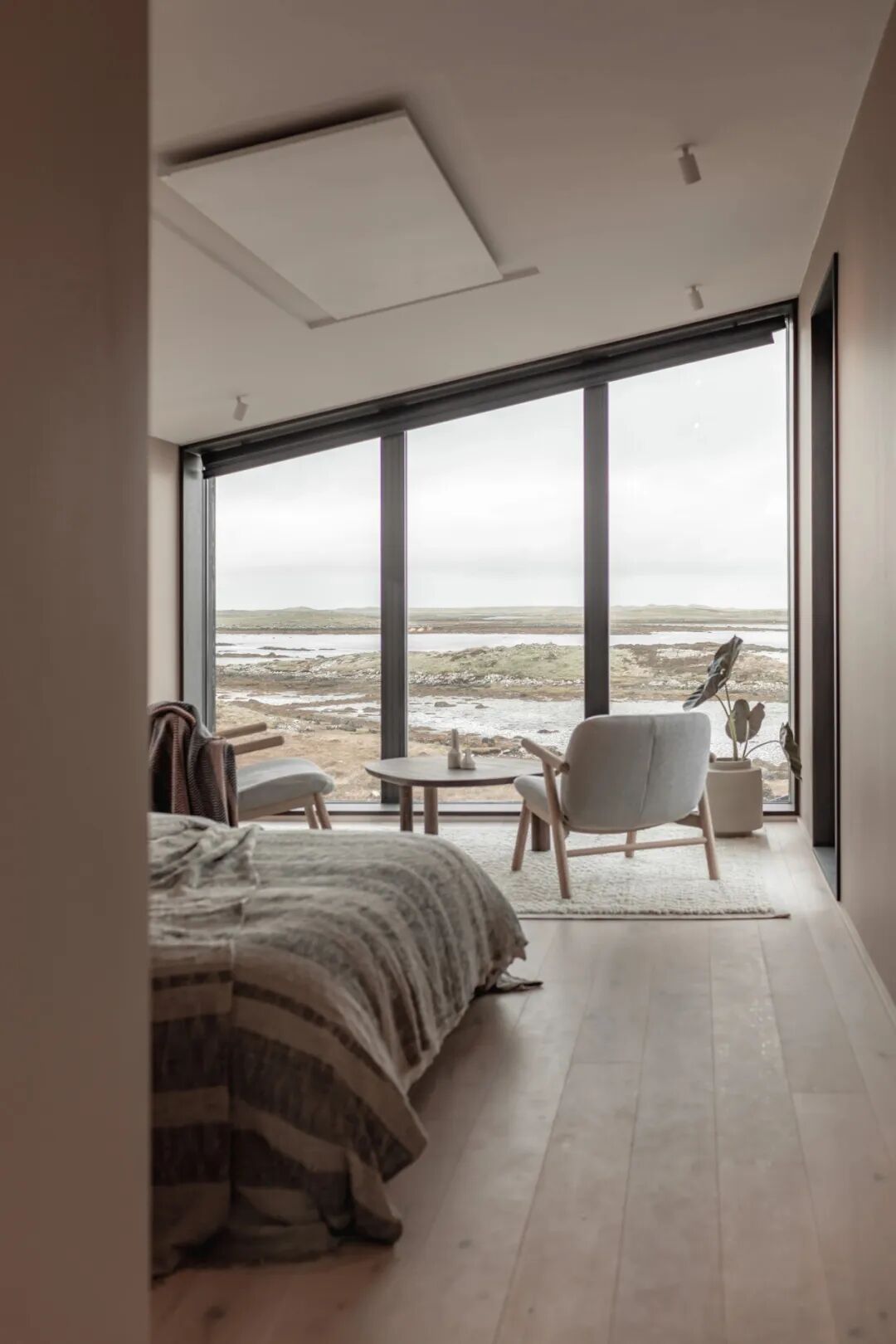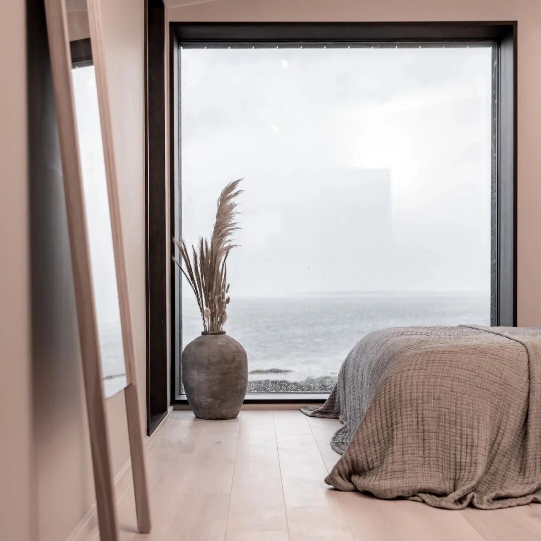 The idea has been to embrace the scenery and moving seascape. Large framed and dramatic windows allow for a continuous dialogue with the outdoors, integrated window seats covered in textured linens. Cosy nooks creating small serene sanctuaries, allowing for hibernation from the ever- shifting, wild weather. Reconnecting the inhabitants to the natural rhythms of nature and the passage of time in their daily lives.
