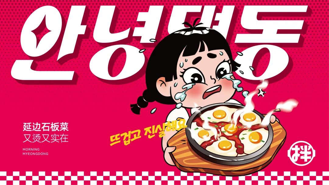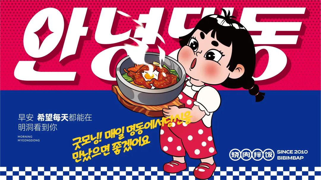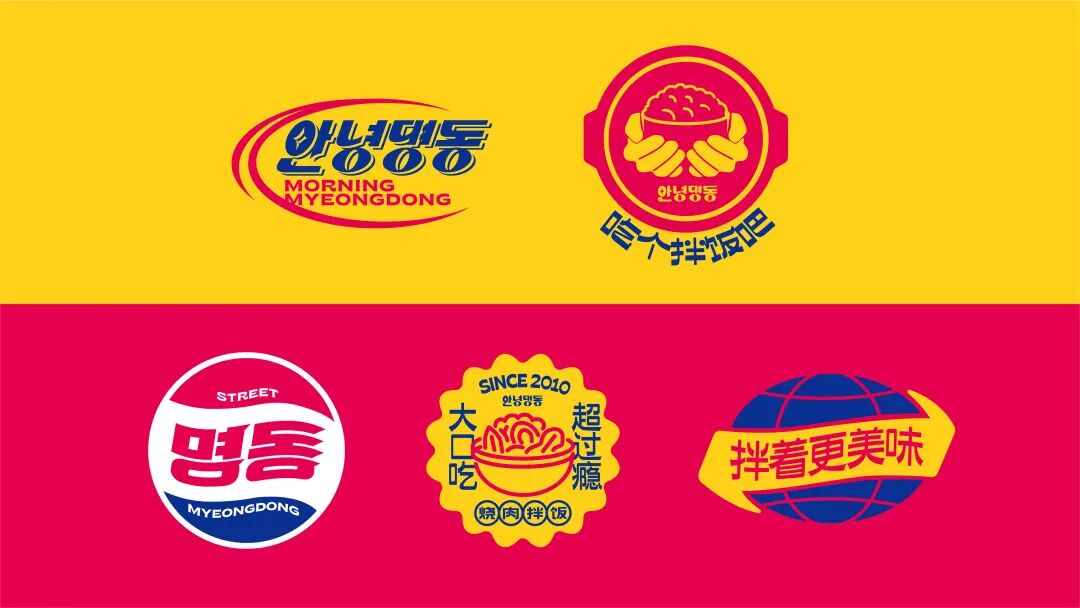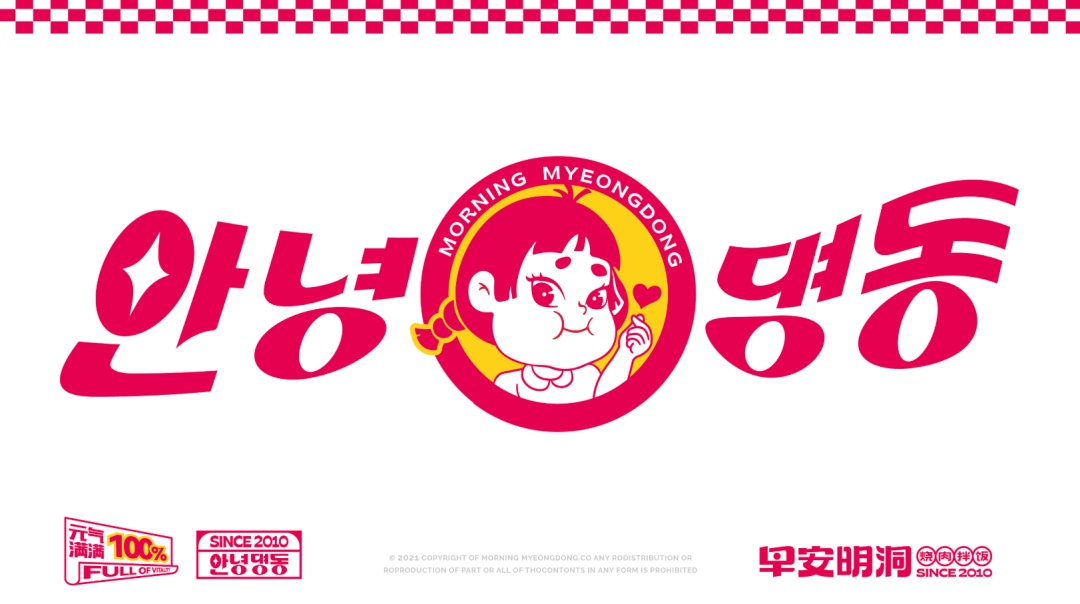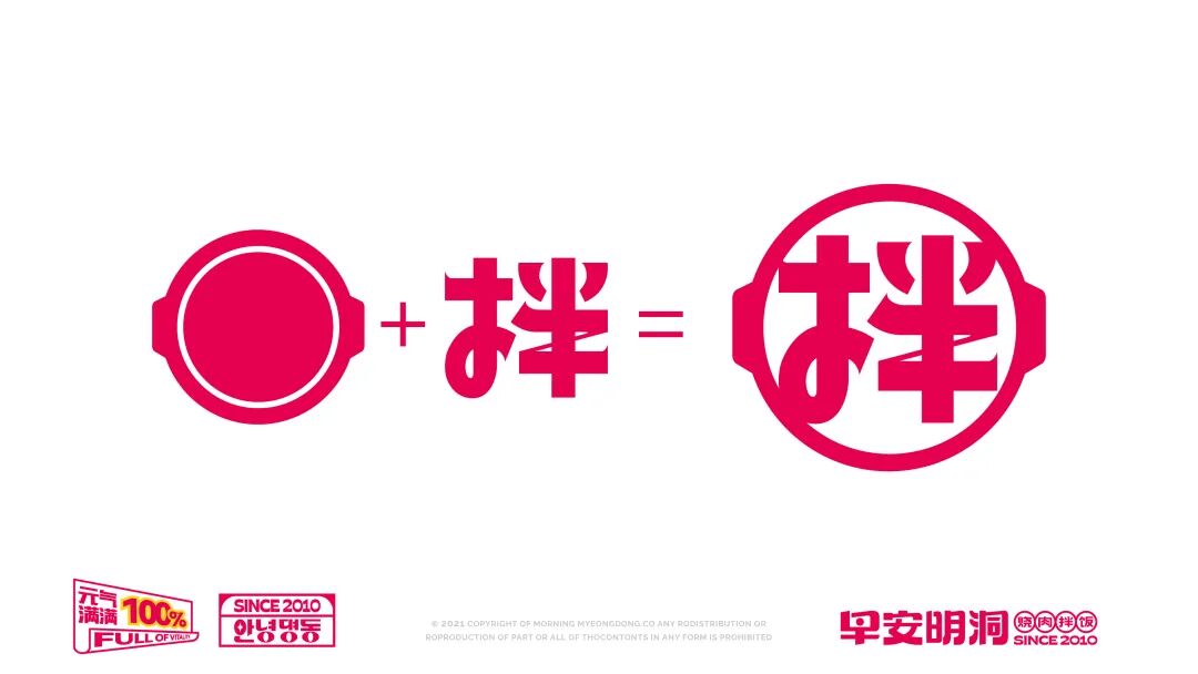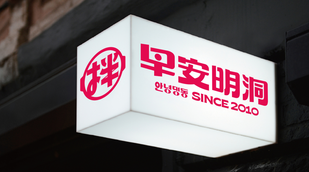 以上班族为主要目标受众的【早安明洞】烧肉拌饭品牌,希望一碗简单又美味的拌饭,满足饱腹感之余,又能在美食中放松自我,找到治愈的感觉。而在设计上,LOGO字样字顶部横线处做斜线处理,整体结构更有特点;同时加入了圆角、尖角等的处理,字体更有张力,提高识别度。