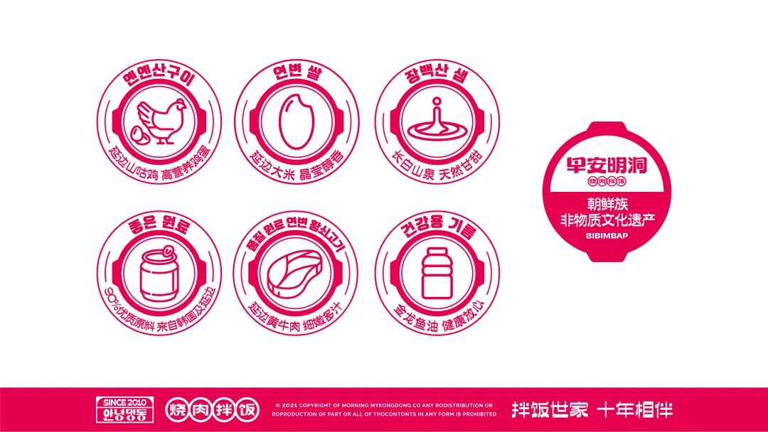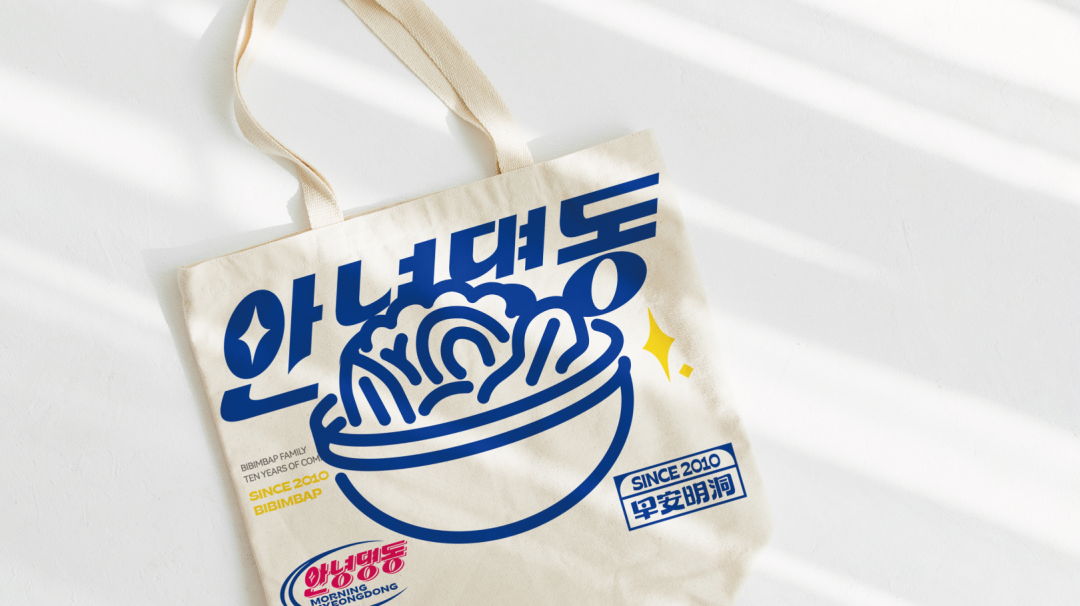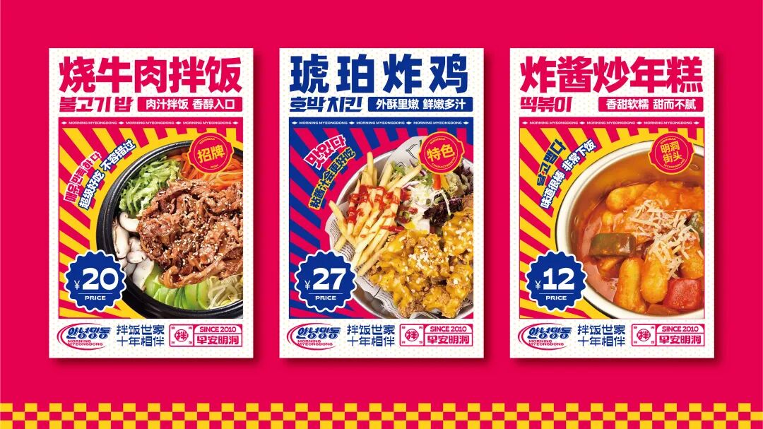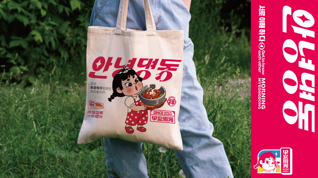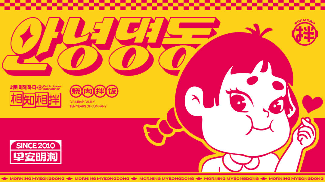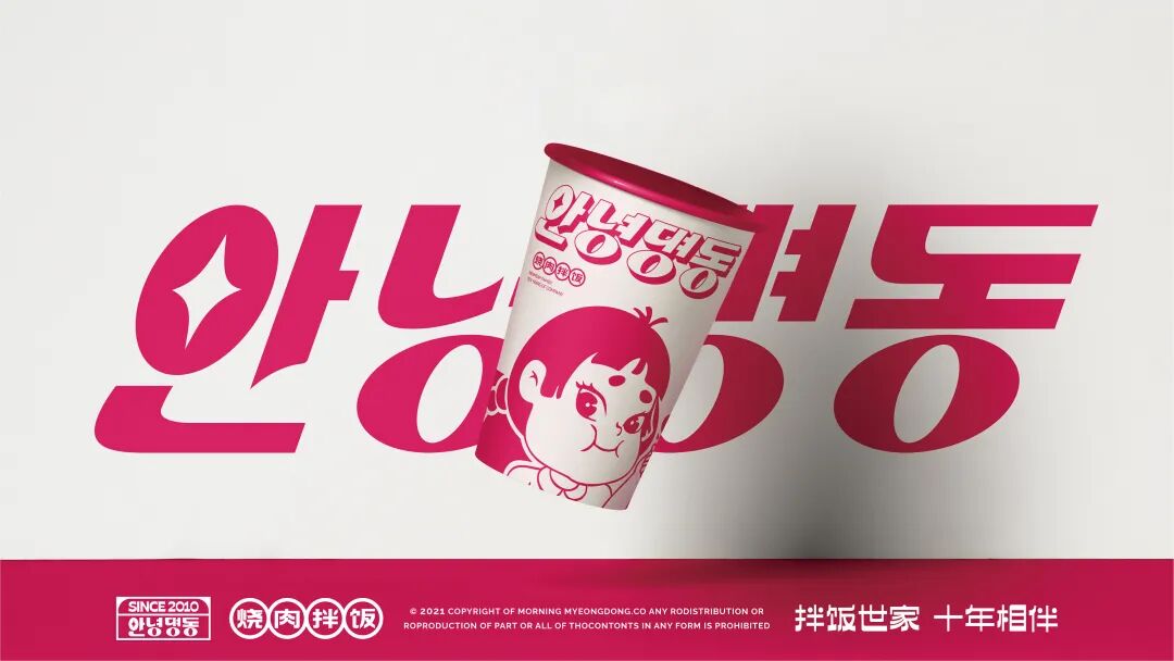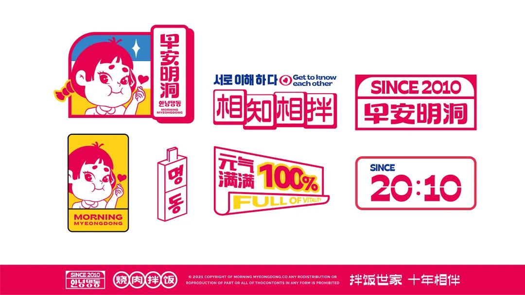 以上班族为主要目标受众的【早安明洞】烧肉拌饭品牌,希望一碗简单又美味的拌饭,满足饱腹感之余,又能在美食中放松自我,找到治愈的感觉。而在设计上,LOGO字样字顶部横线处做斜线处理,整体结构更有特点;同时加入了圆角、尖角等的处理,字体更有张力,提高识别度。