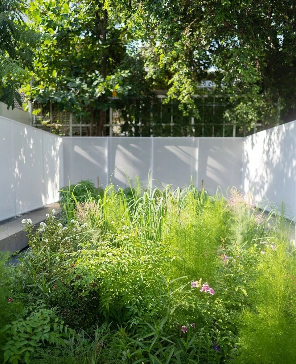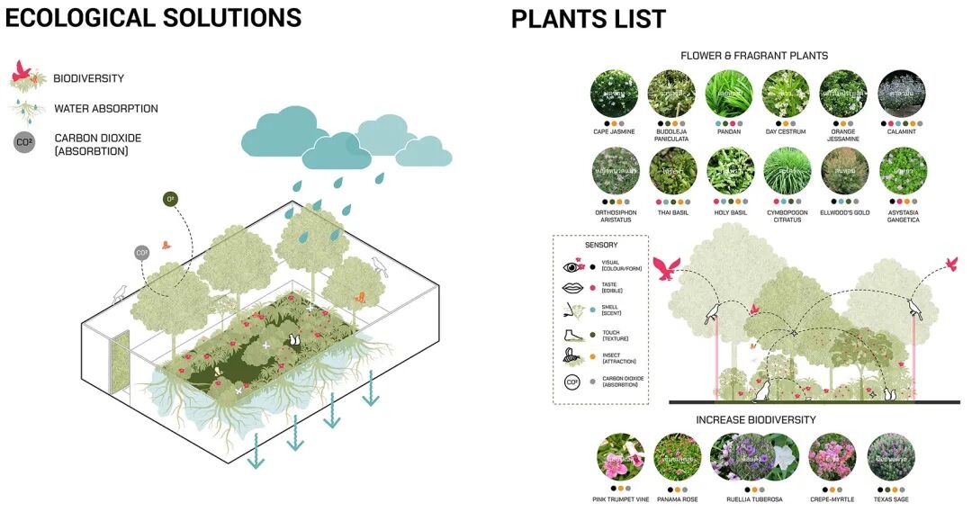 因此设计中置入了丰富的植物类型,开花植物具有疗愈作用,鲜艳的色彩能够吸引昆虫。此外,花园中还种植了一系列带有芳香植物,以营造出轻松宜人的氛围。