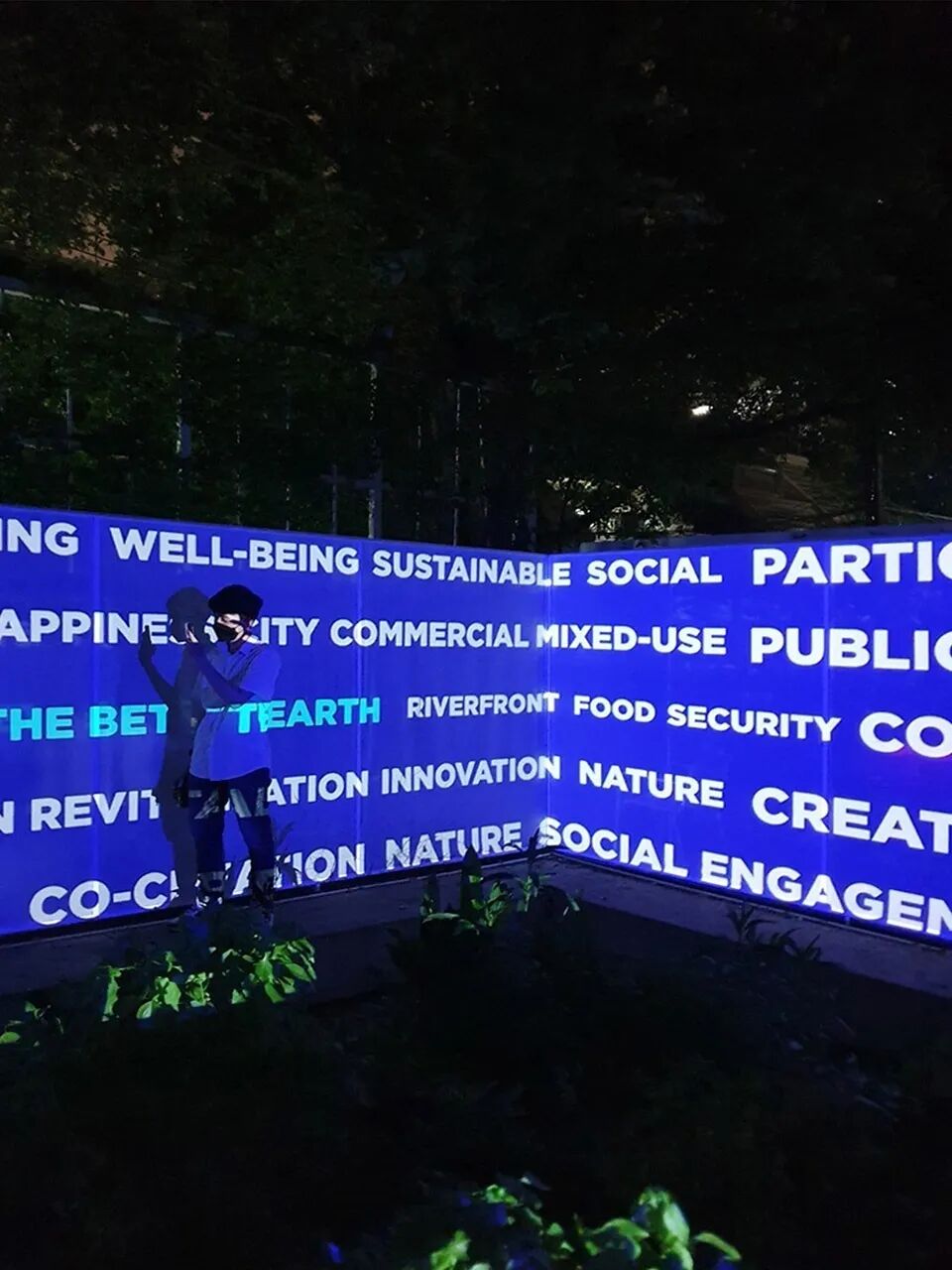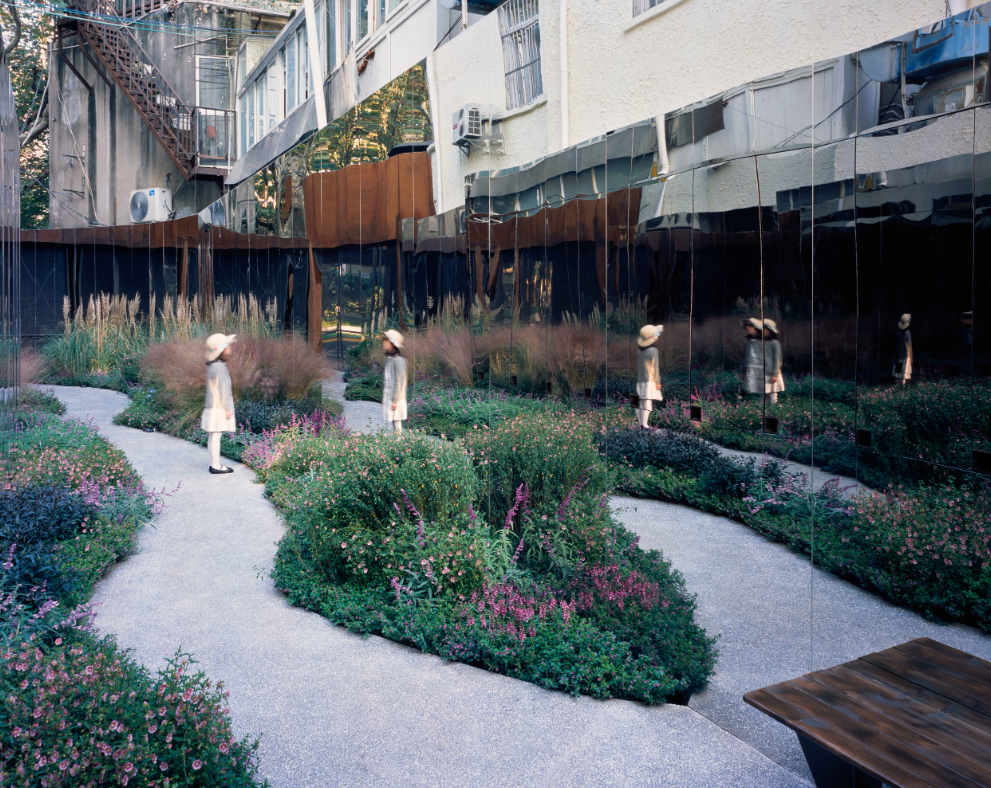 内部弄堂两侧墙面上的镜面不锈钢系统反射中间的小花园,当人从中走过,仿佛步入一个无限的自然花园,从而带来一种在城市中很难得的体验。部分镜面系统是可旋转的,当它旋转过来,是一块块可更换的展板,通过手机扫描展板上的二维码,便可进入网上无限的展览空间。