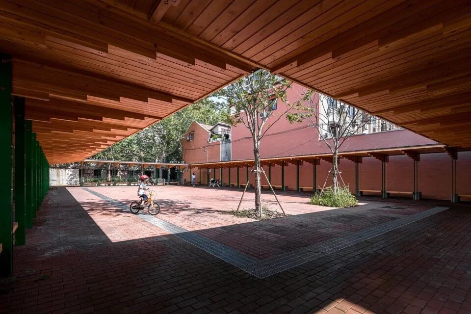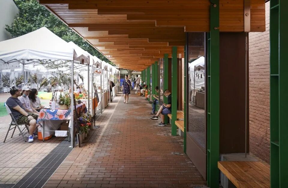 没有绿植的长方形红砖广场提供了一个开阔的空间,为举办各种活动提供了更多的可能性。封闭的凉廊,整体温馨的氛围,给人一种休闲舒适的感觉。居住在附近的居民,有的带着宠物坐在敞开的门廊晒太阳,有的则坐在折叠凳上与朋友闲聊。平日天气好的时候,这里不时举办周末集市。