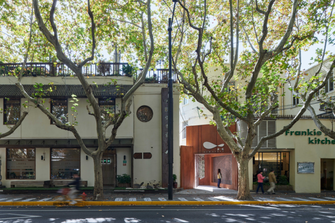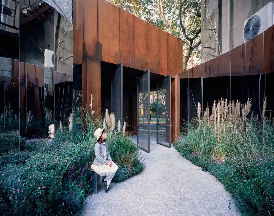 首先是设置一个由耐候钢形成的入口,这里布置了一个关于新华路历史建筑的永久展,设计师将整个新华路看成一个鲜活的博物馆,而这里将成为介绍新华路上众多珍贵历史建筑的小序厅。具有厚重感的耐候钢是对历史的回应,同时谦卑自然的介入城市街道界面。