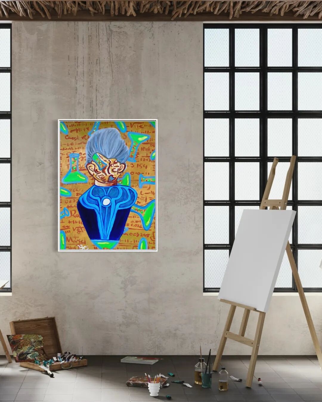 其中创作于2021年的《玛丽 居里》是艺术家关于女性人物创作中最为代表性的作品,该作品将爱穿蓝色长袍的居里夫人,以及自己研究放射性元素时的笔记融入作品之中,展示的是作为女科学家的她对真理信仰般的追求与勇气。