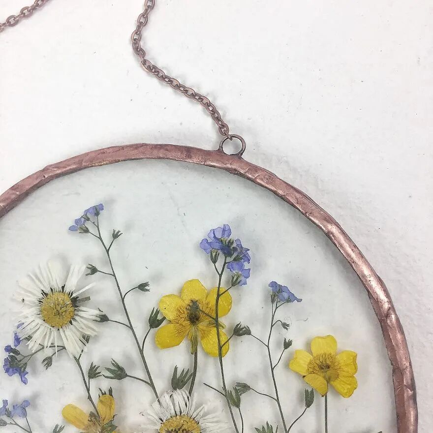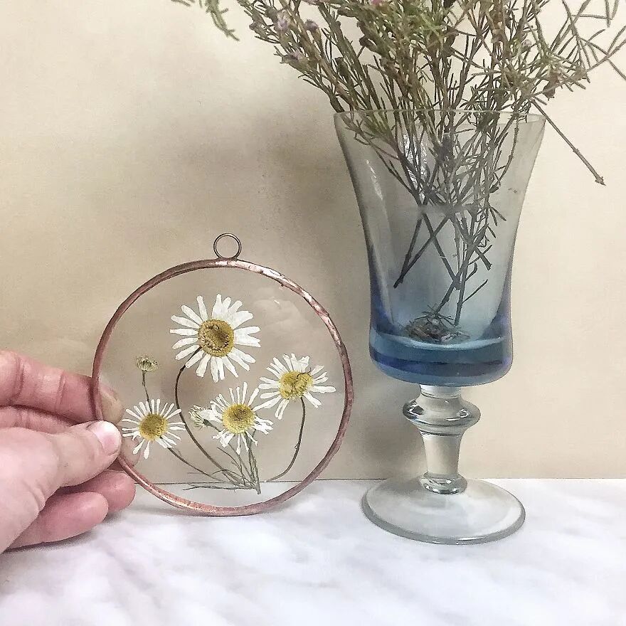 终于,塔蒂亚娜·拉扎鲁克在墙壁上挂着的一幅画上找到了灵感:“是否可以将干花做成装饰艺术品呢”?这真的是一位敢想敢干的姑娘,她找来透明的薄纱网,以及金属丝作为材料,将自己的植物标本摆放并粘贴在丝网上,然后将金属丝制作成方形或圆形的边框,最后,将植物标本放置到边框里,一幅精美的“装饰画”就完成了。