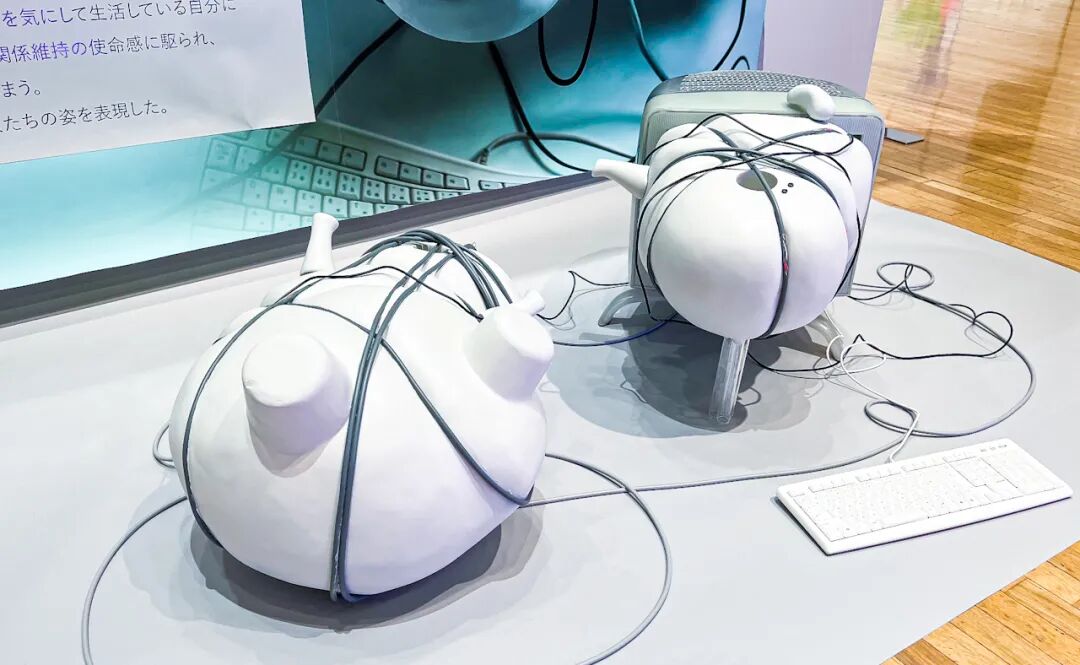 生活在现代的我们是被数字束缚的囚徒。讨厌自己总在意别人的反应,但又需要排除寂寞,需要维持关系,不得不再次被数码世界吸引。这件作品表现了在这样混沌的信息数字时代被囚禁的囚犯们的身姿。
