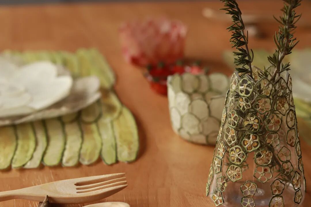 用诸如秋葵、萝卜、西红柿、黄瓜,藕等蔬菜做成的餐盘,餐垫,食皿。
